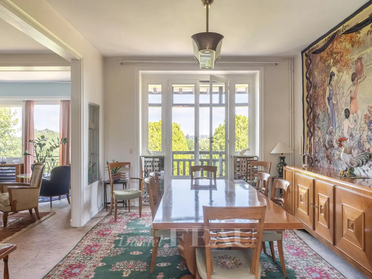 Val d’Or neighbourhood. This early 20th century Anglo-Norman style property is in one of Saint-Cloud’s most sought-after streets a stone’s throw from the station. Entirely decorated by renowned interior decorator Jules Leleu, it includes a spacious entrance hall, a triple living/reception room bathed in sunshine and overlooking the landscaped garden benefiting from an open view of the Bois de Boulogne and the Eiffel Tower, a spacious kitchen, a study, and a bedroom with a bathroom. Upstairs are three further bedrooms (two opening onto a balcony), and two bathrooms. On a basement with a self-contained 31 sqm studio apartment. With a near 100 sqm annex comprising a 3-room apartment, a 35 sqm recreation room and a double garage.