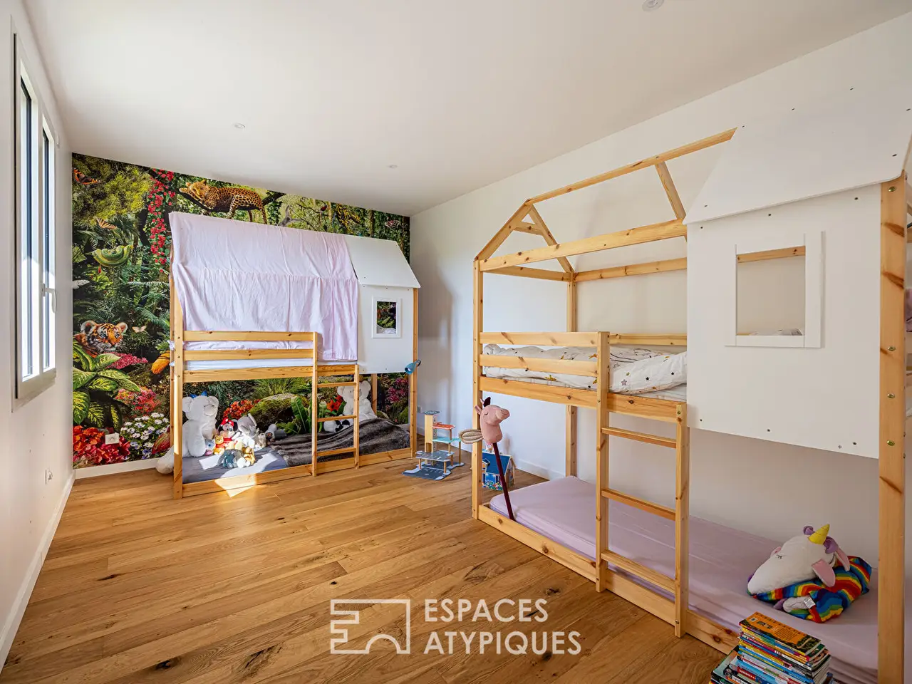 From the entrance, the tone is set: space, light and modernity. The vast living room, punctuated by large bay windows, offers a fluid connection between interior and exterior. Open and elegant kitchen, convivial dining room, double living room: each space invites relaxation and conviviality.