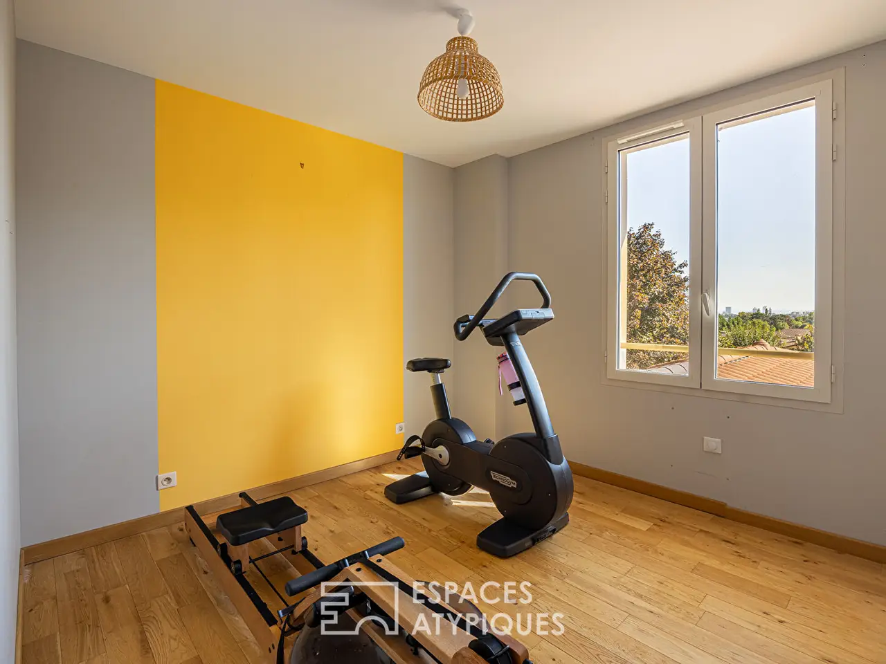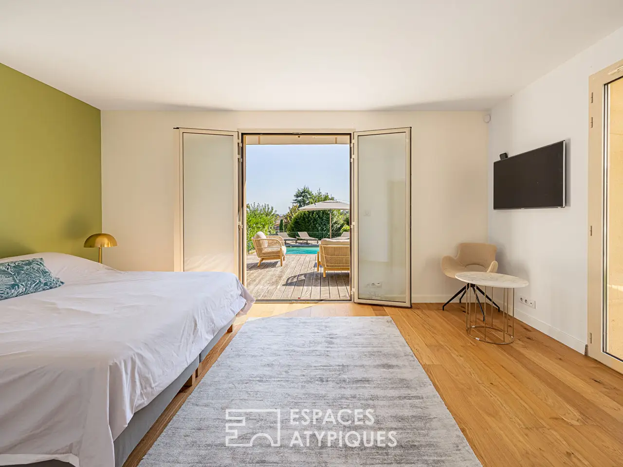 The exterior invites you to fully enjoy the beautiful season: multiple terraces, a private garden, and a sun-drenched swimming pool. Built to recent standards, the house boasts excellent energy performance, a guarantee of comfort and energy efficiency. A rare address where contemporary architecture blends with a relaxed lifestyle, in the heart of one of the most sought-after villages in the Monts d'Or.