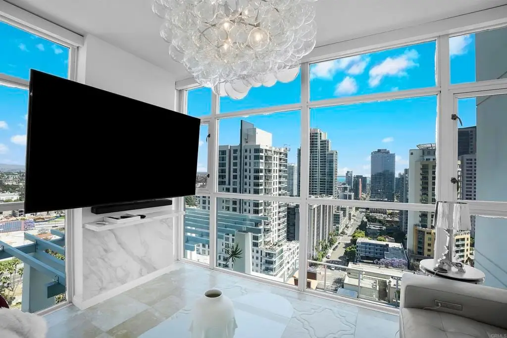 Experience the height of modern elegance in this impeccably designed 2Br 2Ba residence with den, offering the perfect blend of style and urban sophistication. Discovery at Cortez Hill is a contemporary full service luxury building offering residents comfort, convenience, and security. Expansive open-plan living areas flow seamlessly across honed travertine floors, illumilnated by statement lighting and spectacular views framed by floor to ceiling windows with automated roll-down shades and a beautiful gas fireplace. Entertain guests at the elegant bar or move to the private balcony with views of Balboa Park and the beautiful mountains to the east. Peek bay views to the west and south add to the ambiance. The chefs kitchen is both beautiful and functional, featuring sleek Italian porcelain countertops, custom cabinetry, and top-tier stainless steel appliances; an entertainers dream that anchors the homes refined aesthetic. The serene primary suite invites relaxation with blackout shades and drapes, for a restful night's sleep and a spa-inspired bath with dual marble vanity, soaking tub, walk-in shower and generous storage. The 2nd bedroom and bath provides comfort for family or guests while the versatile den provides the ideal setting for a home office, media lounge, or creative space. An in-unit laundry and walk-in pantry provide storage and convenience. The building features 24-hour concierge, a state of the art fitness center with separate weight room and cardio equipment, steam room, and sauna. The rooftop lap pool, spa, barbecues, fire-pit, and outdoor dining area are like living at a private resort. A bicycle room, business center, conference room, deeded storage and 2 secure side by side underground parking spaces round out the building amenities. This residence delivers an effortless lifestyle in one of the quietest downtown neighborhoods; placing the best of urban living, fine dining, and vibrant culture right at your doorstep.