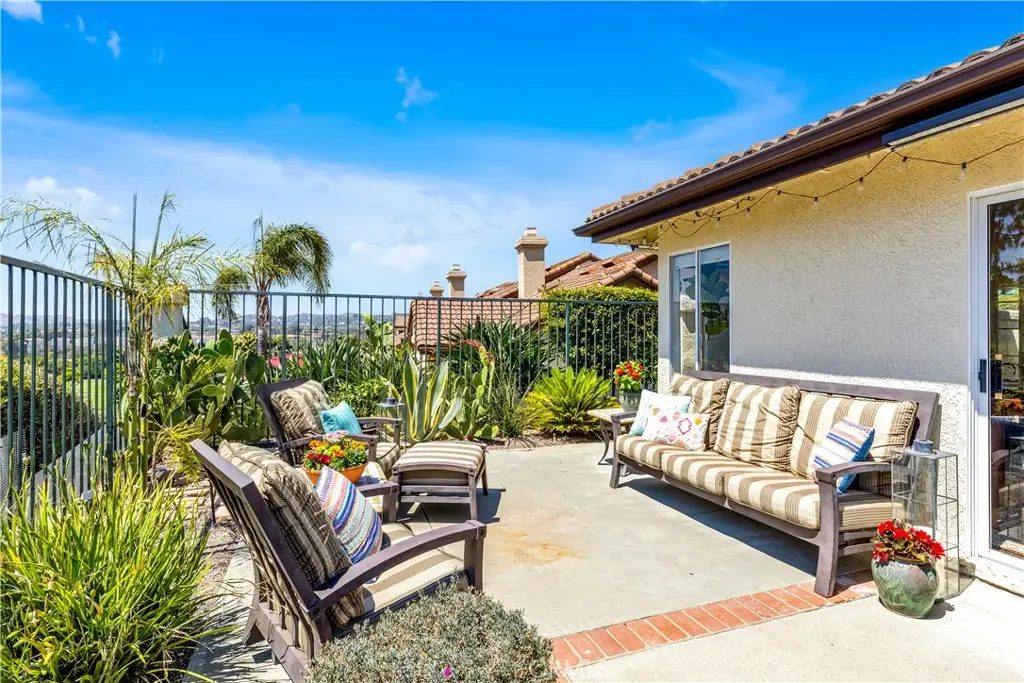 Hear the Mission Bells and enjoy the cool Coastal Breezes from this upgraded 3 bed | 2 bath + loft townhome in the sought-after community of Mesa Vista in beautiful San Juan Capistrano. Ideally situated in a private, interior location, this home lives like a single level with all the bedrooms on the main floor and a spacious, flexible layout throughout. Step through the gated front courtyard into an open living area filled with natural light and accented with a gas fireplace and tile floors. Sliding glass doors lead to a beautifully landscaped wraparound patio with golf course, city lights, and Mission views--perfect for indoor/outdoor living. Custom built outdoor kitchen and grill area includes a stainless gas barbecue, refrigerator and custom drawers and makes this back yard a perfect place to entertain. Spacious, comfortable and with room for multiple seating areas, it is the perfect spot to enjoy sunset views looking out to the historic San Juan Capistrano Mission. The interior kitchen is upgraded with granite countertops, wood cabinetry, recessed lighting, tile flooring and at counter seating and is open to the eating nook with patio access. Separate dining room offers the perfect entertaining area or it can be an ample flex space for more modern use of space. All 3 bedrooms are located on the main floor which allows for ultimate single level living. Main-floor primary suite offers a private patio and a renovated en-suite bath with step-in shower, custom vanity, tile flooring, and walk in closet. Two secondary bedrooms are large enough for queen sized beds and a large loft provides space for guests, a home office, or bonus area. Other highlights include an attached 2-car garage with direct access, garage overhead storage, washer and dryer, newer air conditioner (2023), furnace (2023), newer window shades (2023), modern light fixtures (2025), bathroom fixtures (2025), newer interior paint and carpets (2022). Nestled in the rolling hills of historic San Juan Capistrano, Mesa Vista offers 3 pools/spas, and optional RV parking. Enjoy the lifestyle this home offers being just minutes away from award-winning schools, shopping, hiking trails, world-class beaches, fine dining, equestrian facilities, golf courses, and the charming downtown area. All this and easy freeway access! WELCOME HOME!