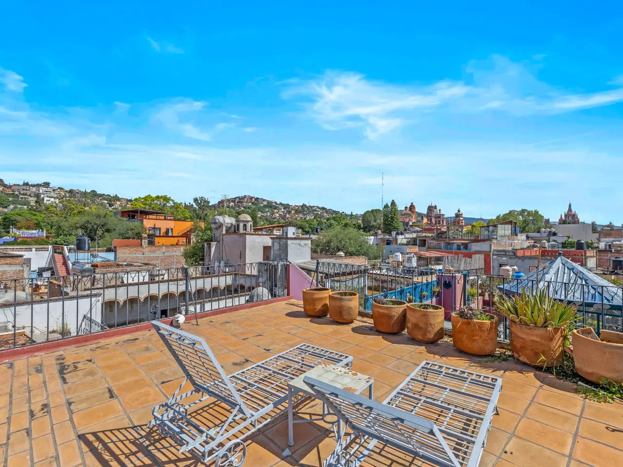 Welcome to Ca’rossa Where Mexican Colonial charm meets Italian elegance in San Miguel de Allende’s Centro. From the moment you arrive, the striking red façade framed with cantera surrounds on every window, the front door, and garage sets the tone for this exceptional residence. Step inside through a thoughtfully designed corridor that opens to the dining area, where arched French doors perfectly frame the outdoor living space. Whitewashed Saltillo tile floors and stenciled ceilings create an airy, light-filled atmosphere that immediately feels both refined and welcoming. The heart of the home is its interior patio, a serene space visible from both the dining and living areas. With its “inspiration wall” fountain, it invites moments of gardening, al fresco dining, or quiet relaxation. Just off the dining area, the galley-style kitchen delights with granite countertops, generous cabinetry, and handcrafted mosaics in cheerful tones of yellow, white, and blue—an inspiring setting for cooking and entertaining. A cozy library nook, guest half-bath, and an elegant living room painted in warm tones complete the first floor. Here, a carved cantera fireplace with floral relief takes center stage, complemented by a stone accent wall, light well, and a second fountain. A private garage offers convenience at this level as well. Second Level Up the graceful staircase, the Saltillo tile continues. The primary suite is a retreat unto itself with a cantera fireplace, a view over the patio, and a spacious en suite bath featuring custom wood cabinetry, double sinks, a bathtub, and shower. True to European tradition, the W.C. is set apart from the bathing area. An adjacent office or den—finished with a striking mosaic floor—offers versatility as a workspace or even a smaller bedroom. Down the hall, the guest suite enchants with another carved wood fireplace surround and a beautifully tiled bathroom. Like the primary suite, this room also overlooks the tranquil patio. Third Level & Rooftop On the third floor, discover a third bedroom with en suite bath, a laundry room, and direct access to the expansive rooftop terrace. Bursting with greenery, this terrace is anchored by a charming glass gazebo—perfect for dining, reading, or creating art. A shaded loggia with vines and foliage evokes the romance of dining al fresco in Italy. One level above, a second sun terrace offers breathtaking 360° views of San Miguel. From here, admire the iconic Parroquia, San Francisco, the Oratorio, and Las Monjas churches, along with panoramic sunsets over the city skyline. The Opportunity Ca’rossa is more than a home—it’s a lifestyle. With its seamless blend of Colonial Mexican architecture and European sophistication, it offers charm, comfort, and character at every turn. Don’t miss this exquisite opportunity—schedule your private showing today. This unique opportunity is significantly reduced to allow current 90 year-old owner lifetime use of home. So if your timing is flexible, this is an amazing deal for you!