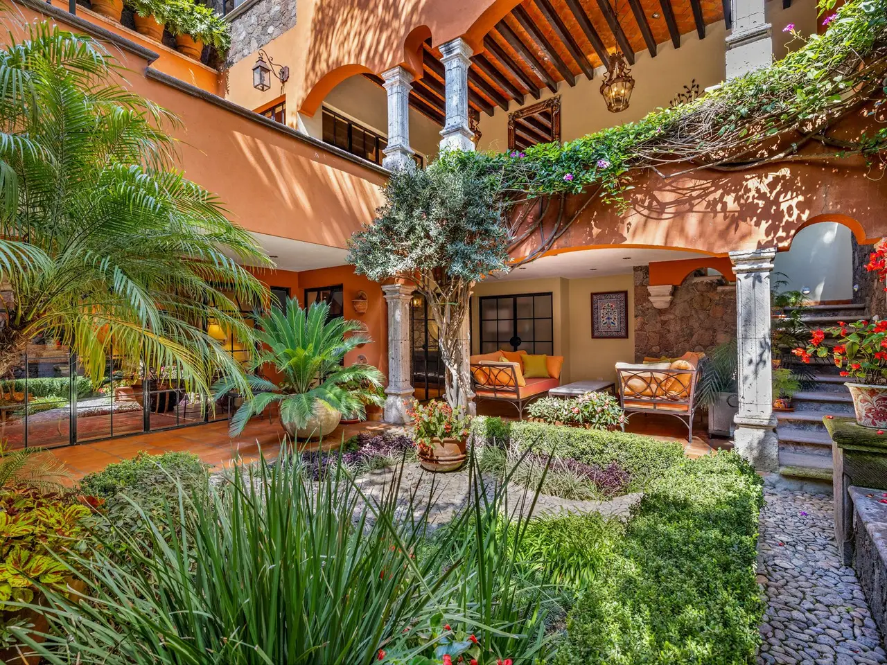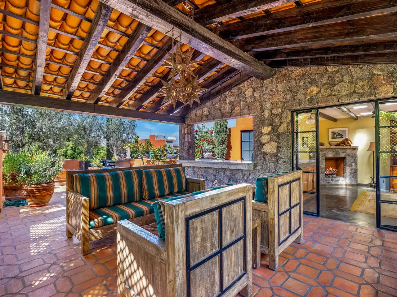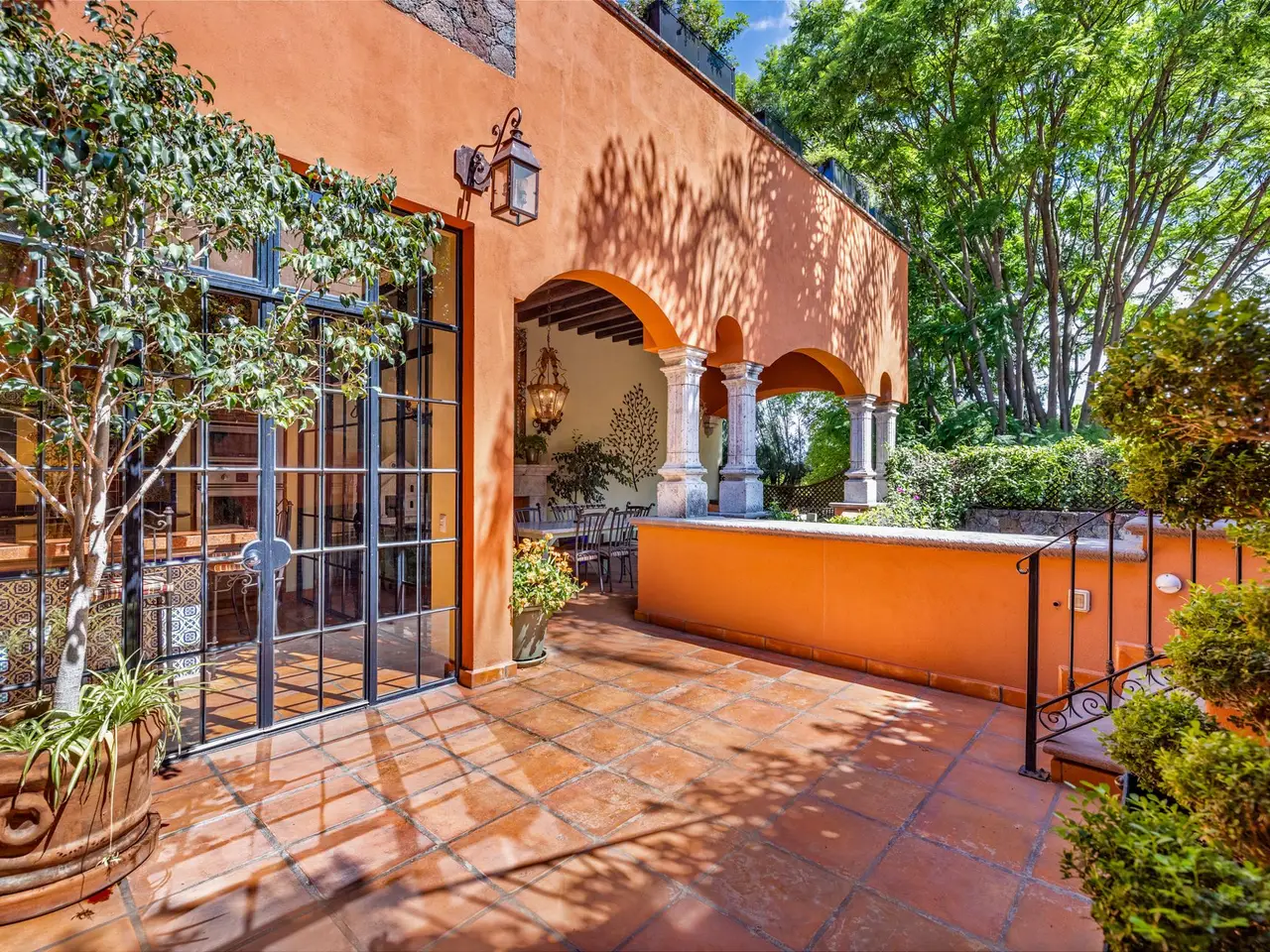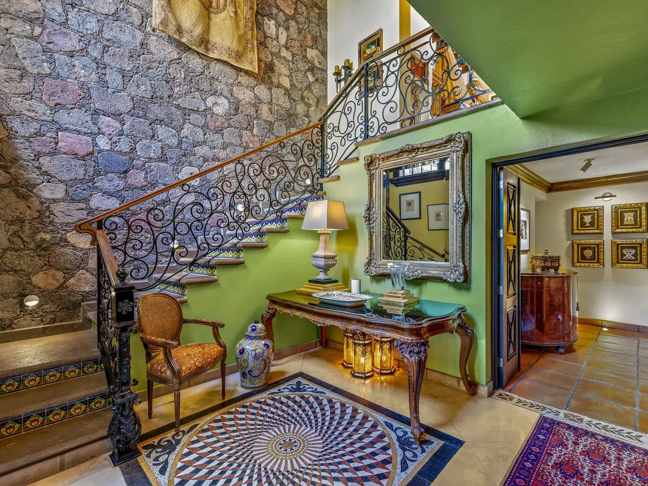 You enter Casa Flora through a graceful foyer, where a stone fountain and hand-crafted details set the tone for the home. From here, an anteroom provides access to the private quarters. The master suite is especially impressive, with carved wood accents, a cantera fireplace, and air conditioning for year-round comfort. Glass doors open to a garden and patio with another fountain and a covered seating area — ideal for enjoying the outdoors in privacy. The en-suite bathroom features high end finishes, including matching circular mirrors over dual sinks, and a spacious walk-in closet. Abundant natural light fills the space throughout the day. The guest bedroom offers its own en-suite bathroom and bright windows, making it comfortable for family or visitors. A laundry room is conveniently located off the anteroom. From the anteroom, a short staircase leads up to the main living level. The kitchen features granite countertops, high-end appliances, a large island, and hand-carved cabinetry. Adjacent is a terrace perfect for dining al fresco or enjoying evening cocktails. The formal living room centers around a grand cantera fireplace, complemented by a impressive custom cabinet built by a local master craftsman, two elegant chandeliers, and a grand piano. A formal dining room extends from the living area, offering a refined space for entertaining. From the kitchen terrace, stairs lead down to the back garden, where the sound of the fountain carries through the air. This level also includes a guest bathroom. Another short flight of stairs brings you to a second terrace with a sitting area and sweeping views. On this level you’ll also find a thoughtfully designed office with custom cabinetry and its own full bath. The office opens to yet another patio and could easily serve as a third bedroom if desired. From the upper terrace, a spiral staircase leads to a rooftop with panoramic views of the Parroquia and the surrounding hills. Casa Flora also offers modern conveniences and upgrades that enhance its livability. The home is equipped with eight solar panels for energy efficiency, a whole-house water purification and pressurization system, and mini-split air conditioning units. Casa Flora is offered with a carefully curated furniture package, including fine furnishings and antiques of exceptional quality. This turnkey offering allows new owners to step directly into a beautifully finished home, ready to be enjoyed from day one.