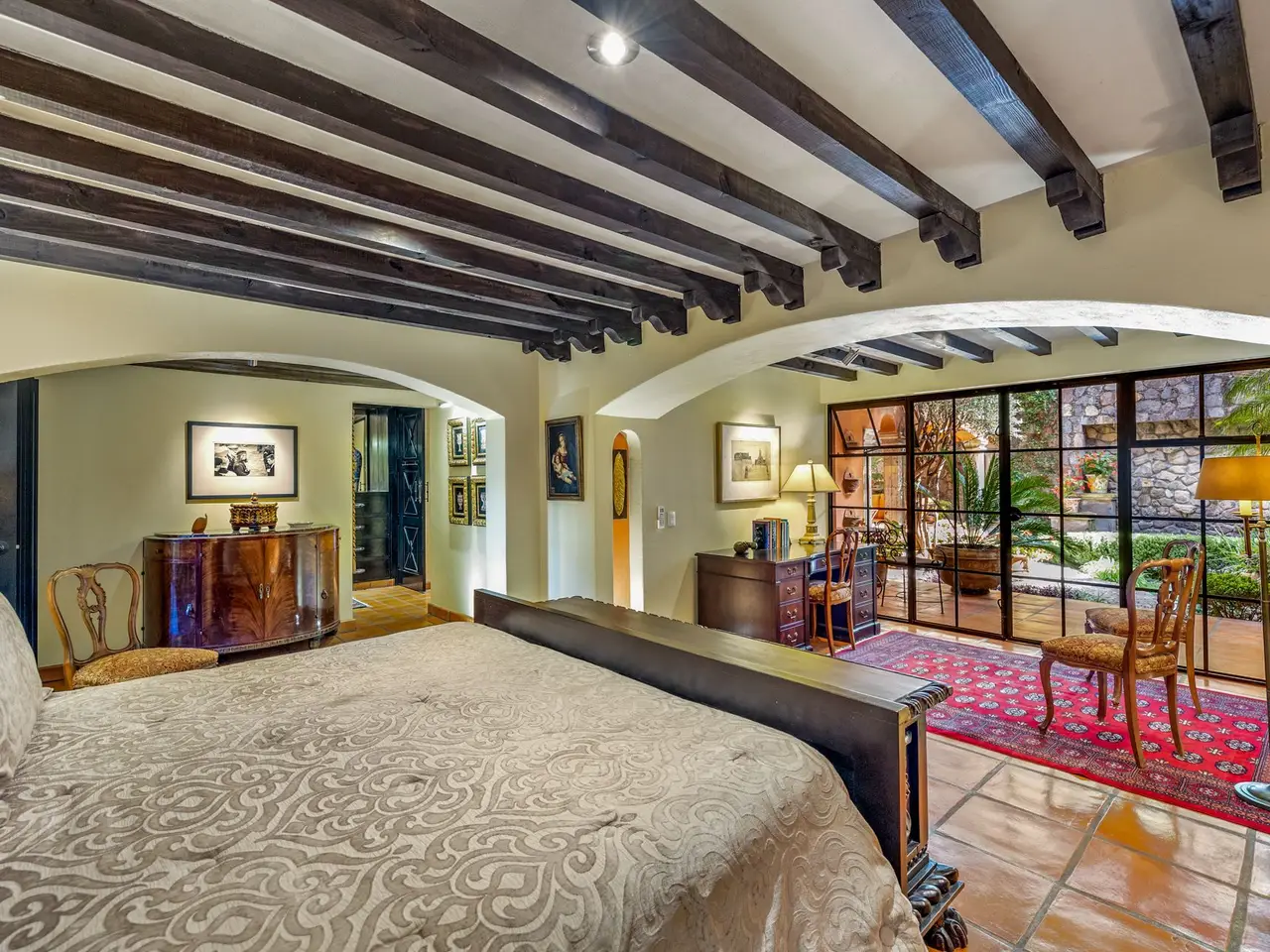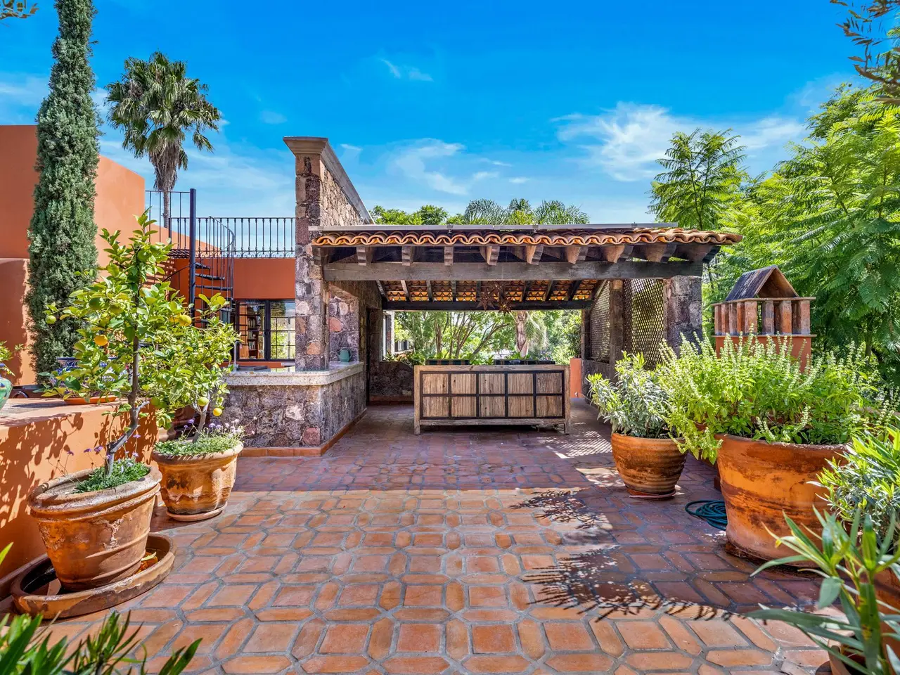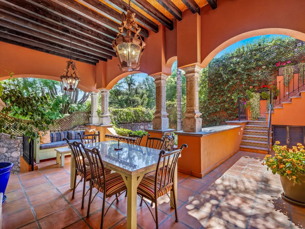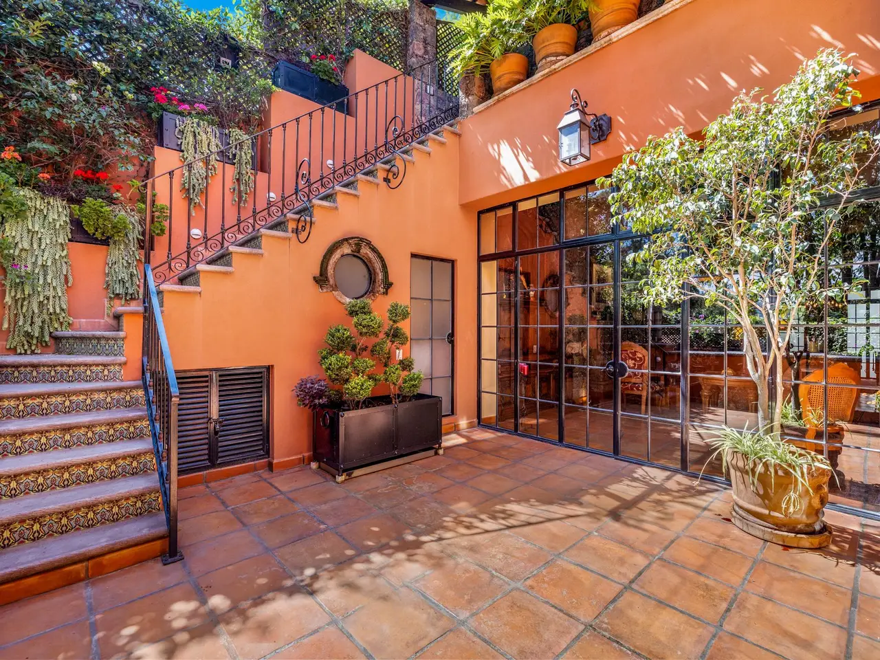 You enter Casa Flora through a graceful foyer, where a stone fountain and hand-crafted details set the tone for the home. From here, an anteroom provides access to the private quarters. The master suite is especially impressive, with carved wood accents, a cantera fireplace, and air conditioning for year-round comfort. Glass doors open to a garden and patio with another fountain and a covered seating area — ideal for enjoying the outdoors in privacy. The en-suite bathroom features high end finishes, including matching circular mirrors over dual sinks, and a spacious walk-in closet. Abundant natural light fills the space throughout the day. The guest bedroom offers its own en-suite bathroom and bright windows, making it comfortable for family or visitors. A laundry room is conveniently located off the anteroom. From the anteroom, a short staircase leads up to the main living level. The kitchen features granite countertops, high-end appliances, a large island, and hand-carved cabinetry. Adjacent is a terrace perfect for dining al fresco or enjoying evening cocktails. The formal living room centers around a grand cantera fireplace, complemented by a impressive custom cabinet built by a local master craftsman, two elegant chandeliers, and a grand piano. A formal dining room extends from the living area, offering a refined space for entertaining. From the kitchen terrace, stairs lead down to the back garden, where the sound of the fountain carries through the air. This level also includes a guest bathroom. Another short flight of stairs brings you to a second terrace with a sitting area and sweeping views. On this level you’ll also find a thoughtfully designed office with custom cabinetry and its own full bath. The office opens to yet another patio and could easily serve as a third bedroom if desired. From the upper terrace, a spiral staircase leads to a rooftop with panoramic views of the Parroquia and the surrounding hills. Casa Flora also offers modern conveniences and upgrades that enhance its livability. The home is equipped with eight solar panels for energy efficiency, a whole-house water purification and pressurization system, and mini-split air conditioning units. Casa Flora is offered with a carefully curated furniture package, including fine furnishings and antiques of exceptional quality. This turnkey offering allows new owners to step directly into a beautifully finished home, ready to be enjoyed from day one.