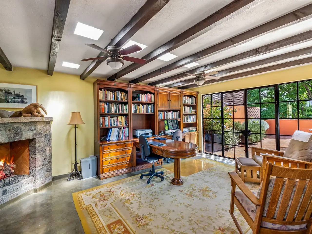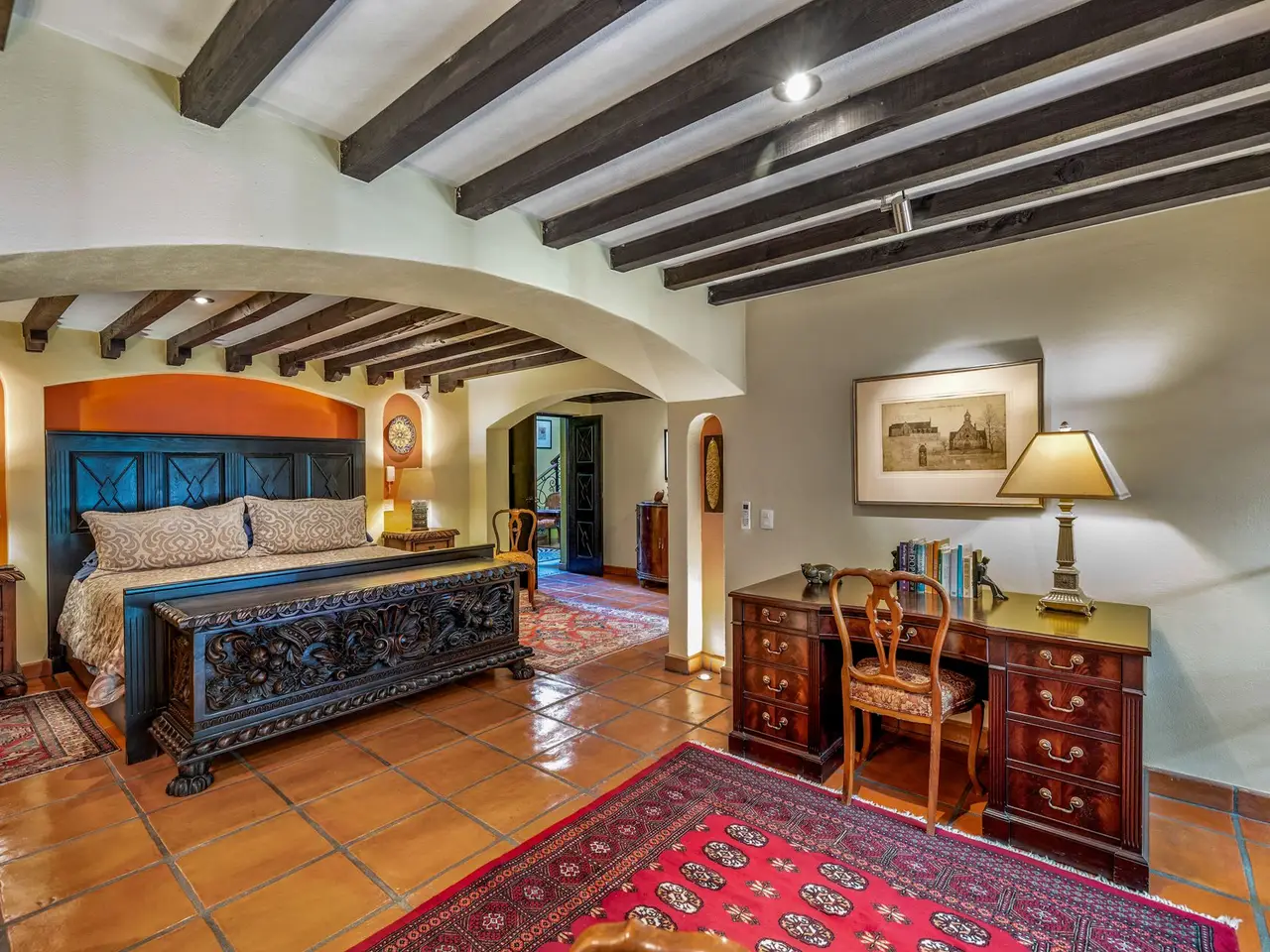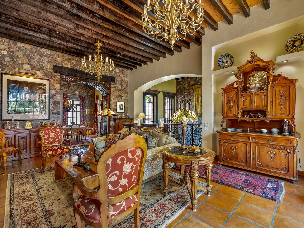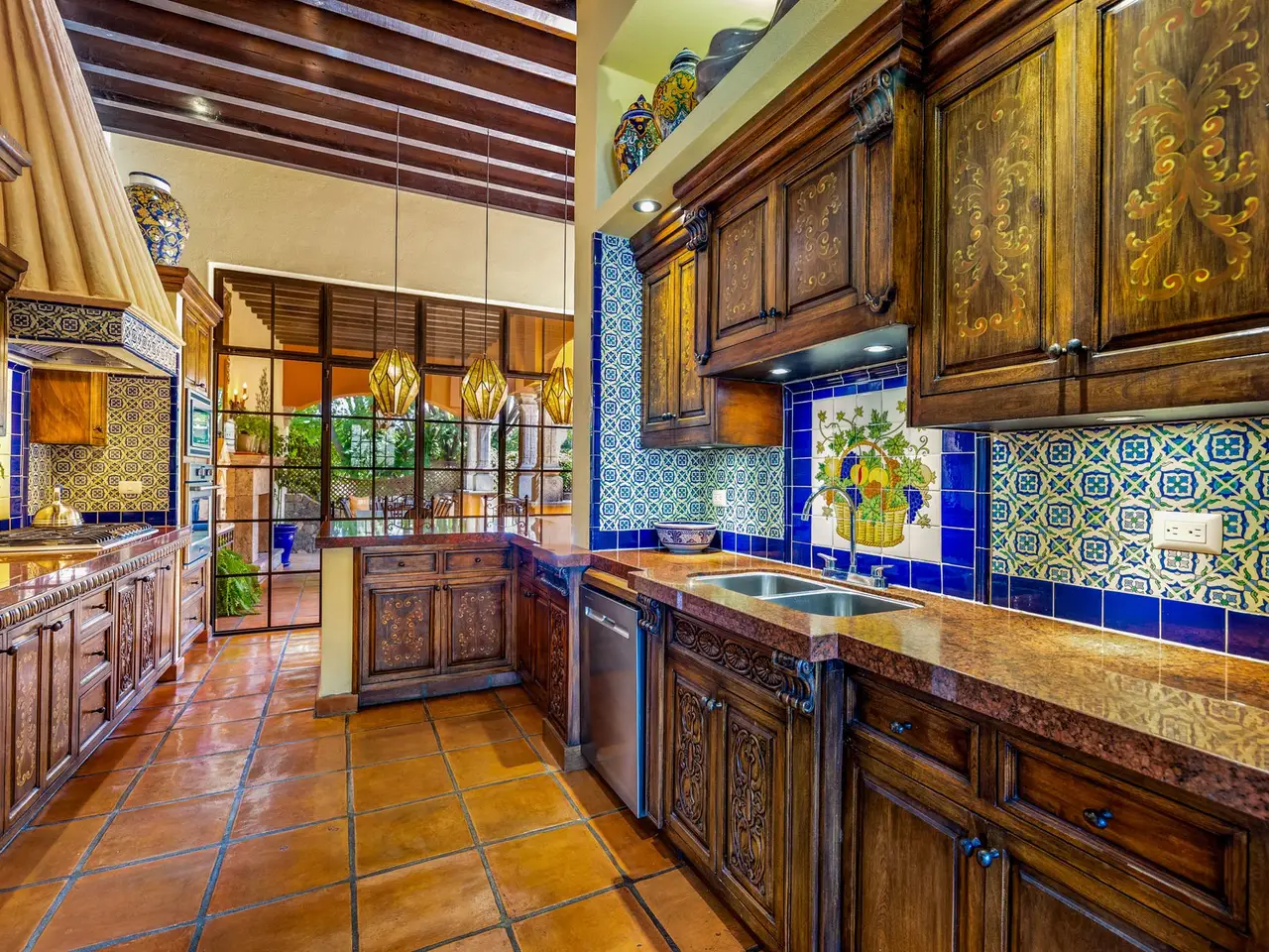 You enter Casa Flora through a graceful foyer, where a stone fountain and hand-crafted details set the tone for the home. From here, an anteroom provides access to the private quarters. The master suite is especially impressive, with carved wood accents, a cantera fireplace, and air conditioning for year-round comfort. Glass doors open to a garden and patio with another fountain and a covered seating area — ideal for enjoying the outdoors in privacy. The en-suite bathroom features high end finishes, including matching circular mirrors over dual sinks, and a spacious walk-in closet. Abundant natural light fills the space throughout the day. The guest bedroom offers its own en-suite bathroom and bright windows, making it comfortable for family or visitors. A laundry room is conveniently located off the anteroom. From the anteroom, a short staircase leads up to the main living level. The kitchen features granite countertops, high-end appliances, a large island, and hand-carved cabinetry. Adjacent is a terrace perfect for dining al fresco or enjoying evening cocktails. The formal living room centers around a grand cantera fireplace, complemented by a impressive custom cabinet built by a local master craftsman, two elegant chandeliers, and a grand piano. A formal dining room extends from the living area, offering a refined space for entertaining. From the kitchen terrace, stairs lead down to the back garden, where the sound of the fountain carries through the air. This level also includes a guest bathroom. Another short flight of stairs brings you to a second terrace with a sitting area and sweeping views. On this level you’ll also find a thoughtfully designed office with custom cabinetry and its own full bath. The office opens to yet another patio and could easily serve as a third bedroom if desired. From the upper terrace, a spiral staircase leads to a rooftop with panoramic views of the Parroquia and the surrounding hills. Casa Flora also offers modern conveniences and upgrades that enhance its livability. The home is equipped with eight solar panels for energy efficiency, a whole-house water purification and pressurization system, and mini-split air conditioning units. Casa Flora is offered with a carefully curated furniture package, including fine furnishings and antiques of exceptional quality. This turnkey offering allows new owners to step directly into a beautifully finished home, ready to be enjoyed from day one.