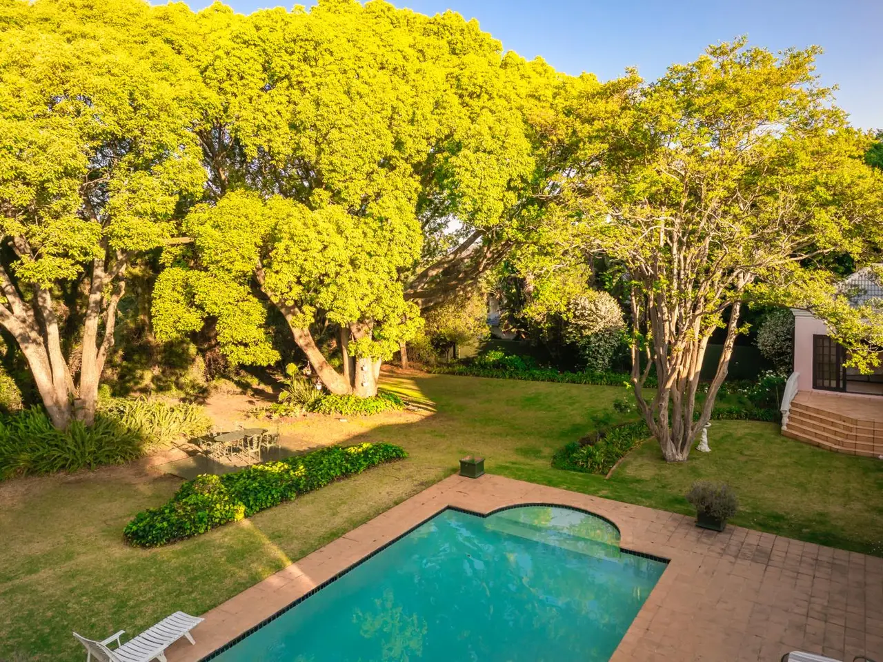 Expansive park-like garden with 150-year-old trees