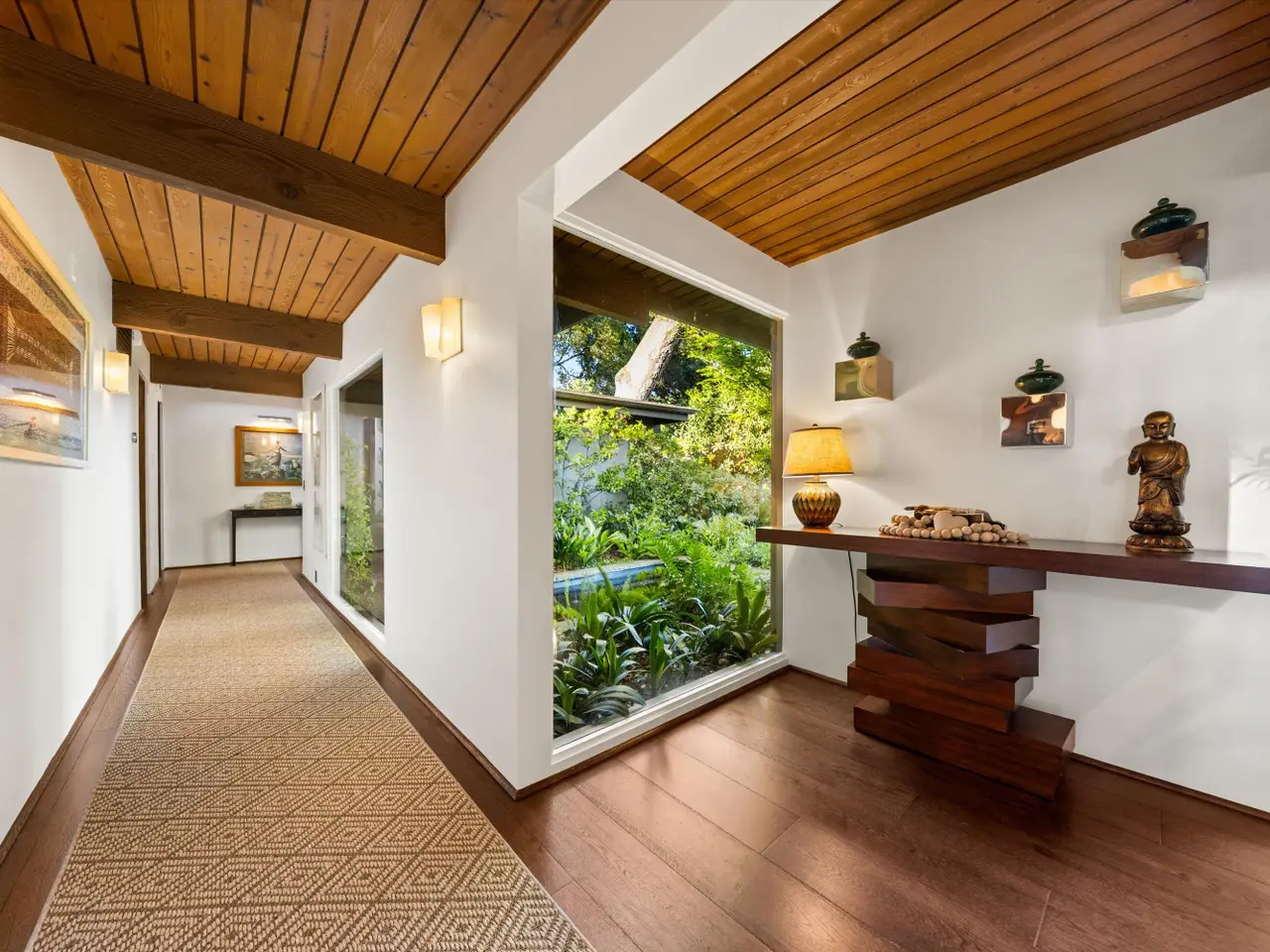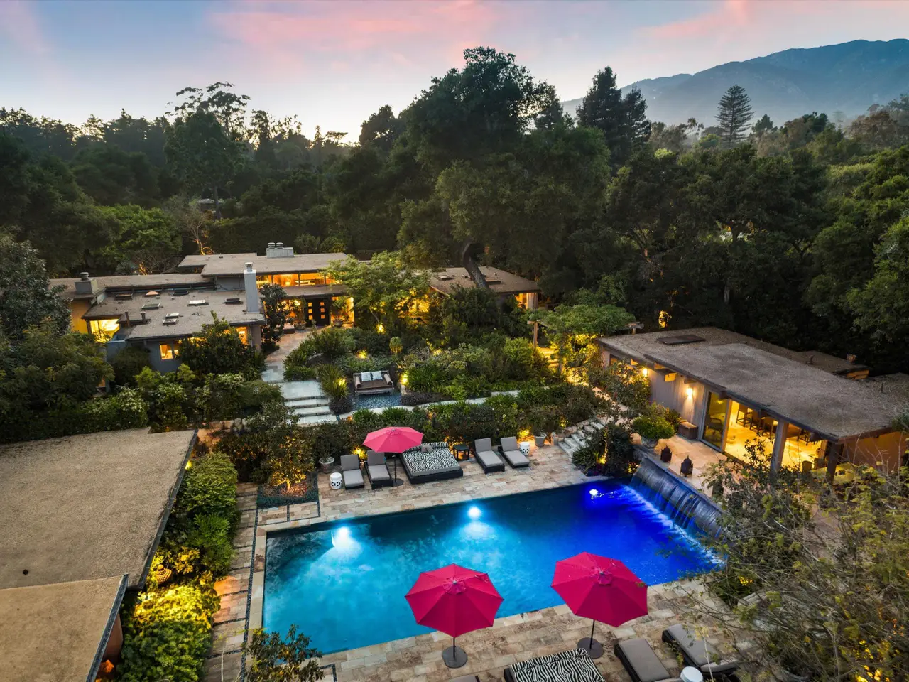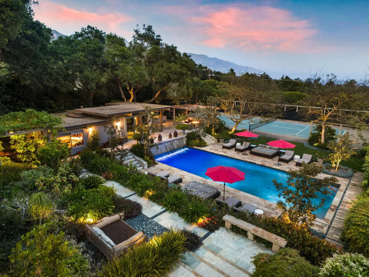 A Private Zen Retreat in the Heart of Montecito Tucked behind gates on a peaceful lane, this single-level Mid-Century estate is a tranquil sanctuary where nature and luxury converge. Lush tropical landscaping, curated pathways, and serene outdoor moments create a resort-like atmosphere. Inside, soaring ceilings and walls of glass frame garden views, while a chef's kitchen, dramatic agate fireplace, and seamless indoor-outdoor flow elevate everyday living. The spa-inspired primary suite features radiant heated floors, steam shower, ceiling-fill soaking tub, and private garden with hot tub and outdoor shower. Two additional en-suite bedrooms and two offices offer flexibility and comfort. A sparkling pool, modern cabana with bar and home theatre, outdoor kitchen, tennis court, and smart home systems complete this exceptional retreat. Experience the ultimate Montecito lifestyle private, peaceful, and unforgettable. This Shangri-La is waiting for you!