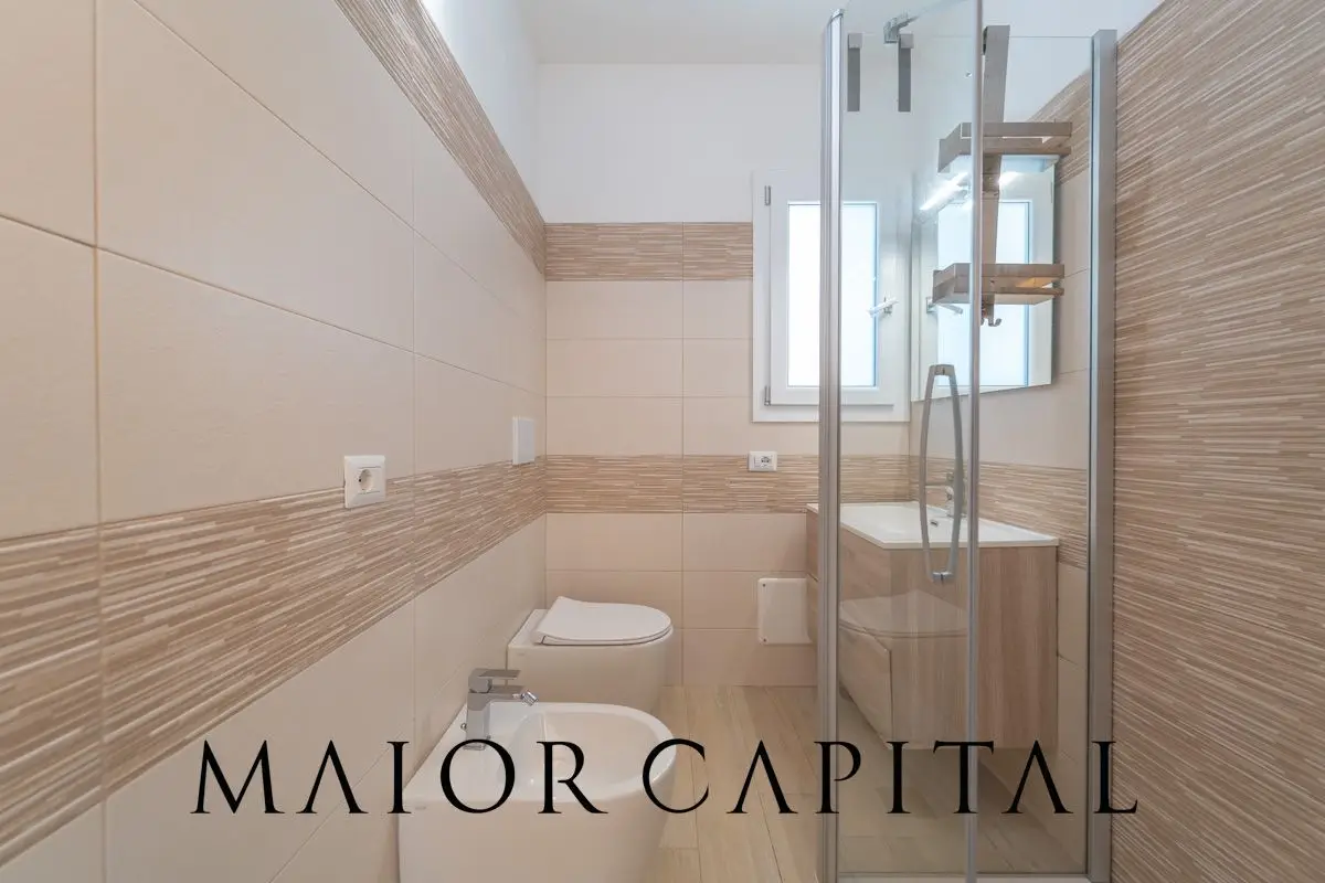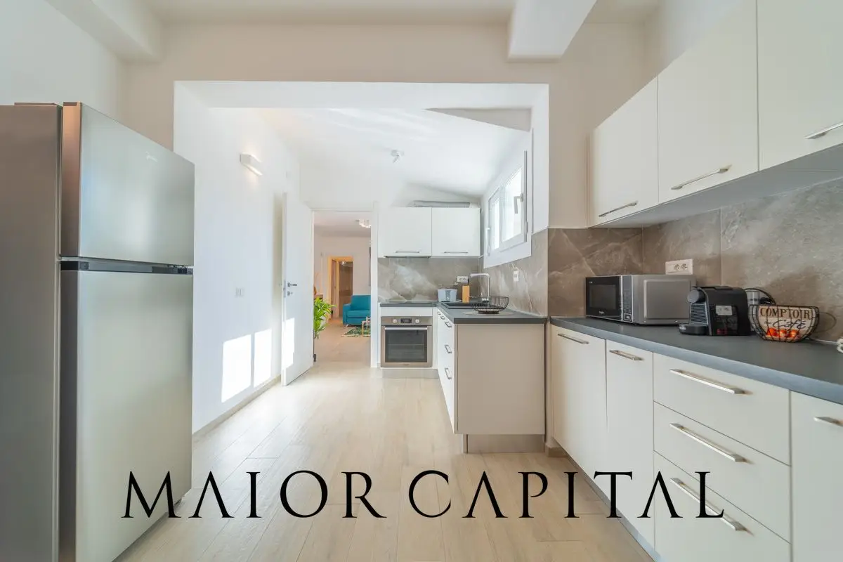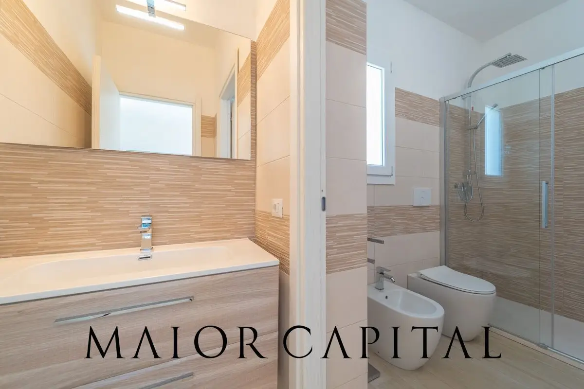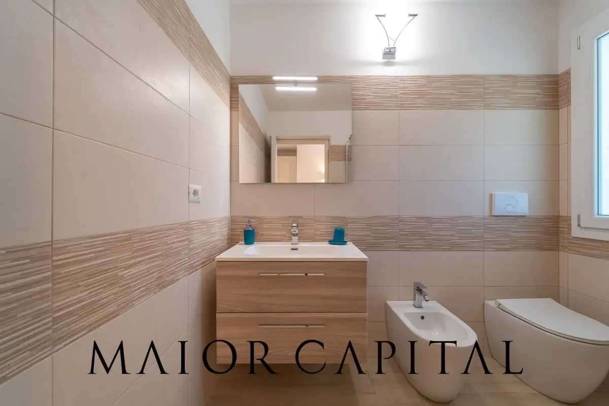 Inside, the rooms stand out for their brightness and harmony. The spacious and welcoming living room, enhanced by elegant finishes and colour details, creates a warm and relaxing atmosphere. The modern kitchen, linear and functional, opens onto the dining area, made even more suggestive by the large panoramic windows that favour continuity between inside and outside.