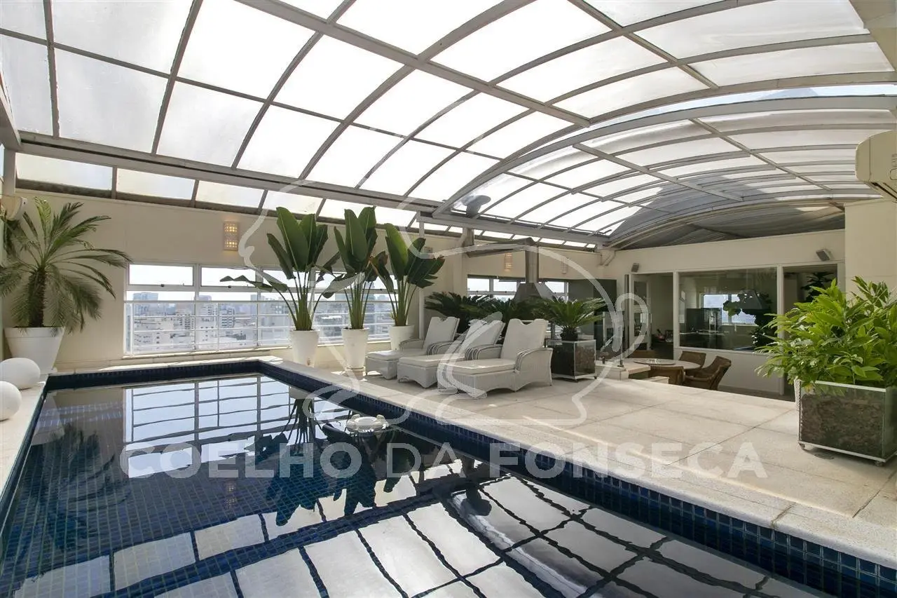 Beautiful penthouse with 360-degree views. From most rooms, you can see the sunrise, sunset and moonrise. Just a few steps from Ibirapuera Park. 2 social elevators that reach the lower and upper floors, providing total privacy. Armored social and service area doors. The lower floor contains the suites, living rooms, terrace with views, kitchen and service area. The upper floor has a home office, heated pool with retractable roof, gourmet space, barbecue, sauna and a small gym. Building with full leisure facilities. Penthouse in the Vila Nova Conceição neighborhood with 649m² of private/useful area, 4 bedroom(s), 4 suite(s), 8 parking space(s), 6 bathroom(s), pool, barbecue, terrace, duplex, air conditioning, maid's quarters, gourmet balcony.