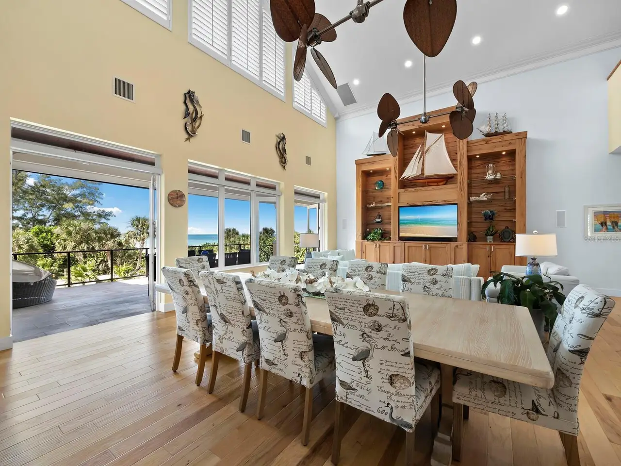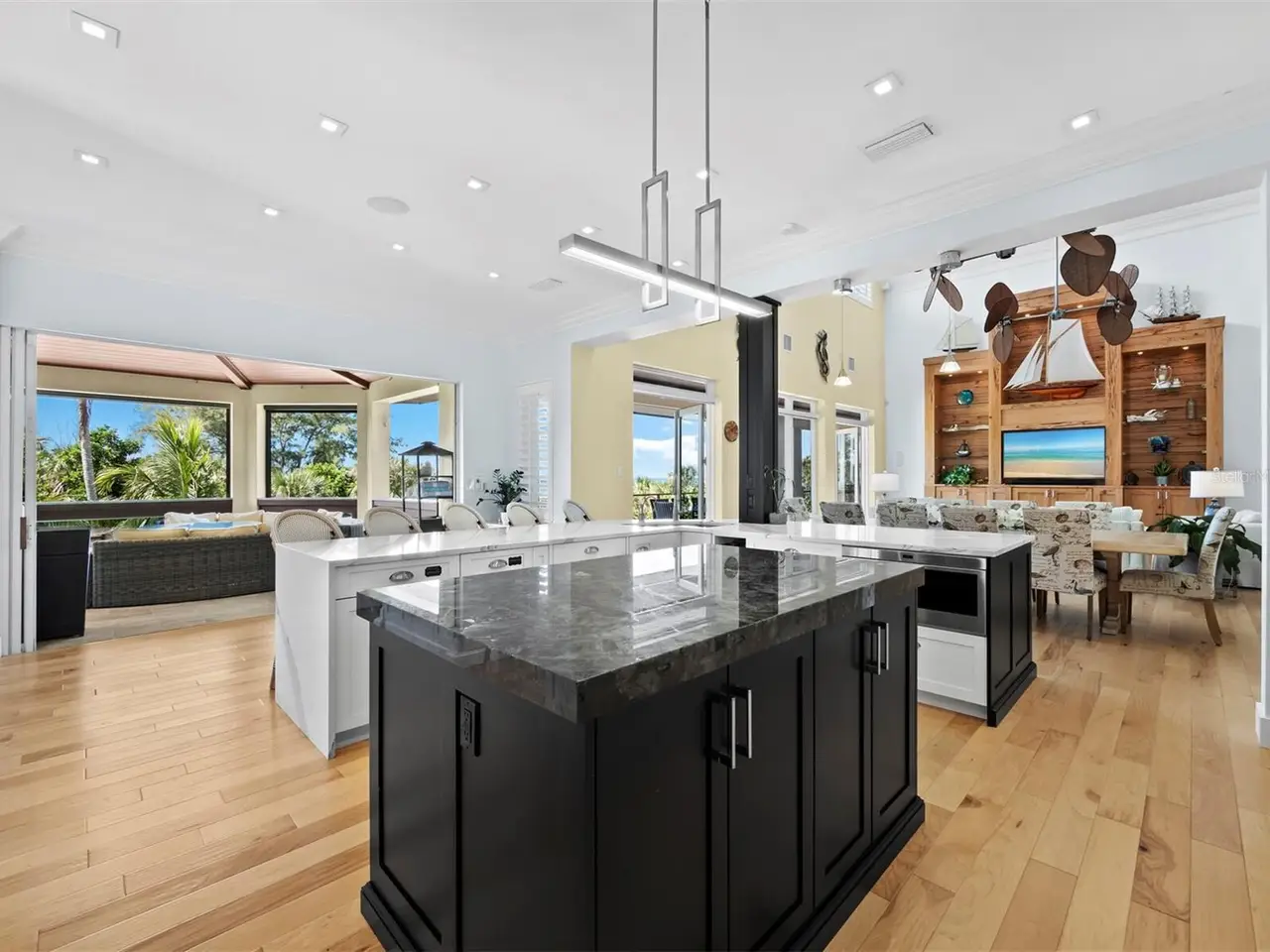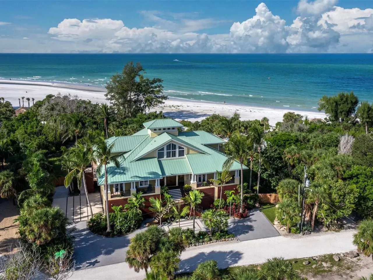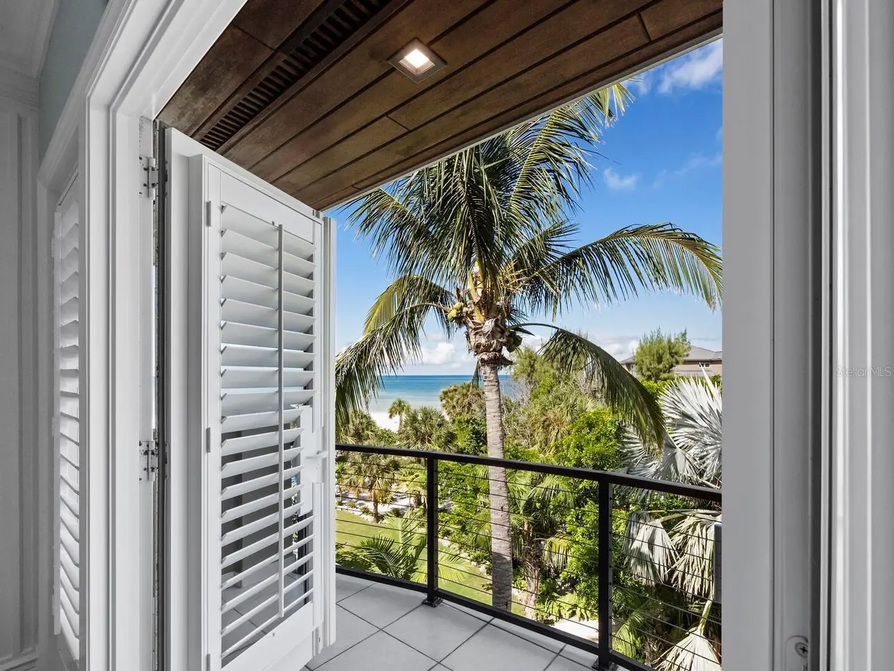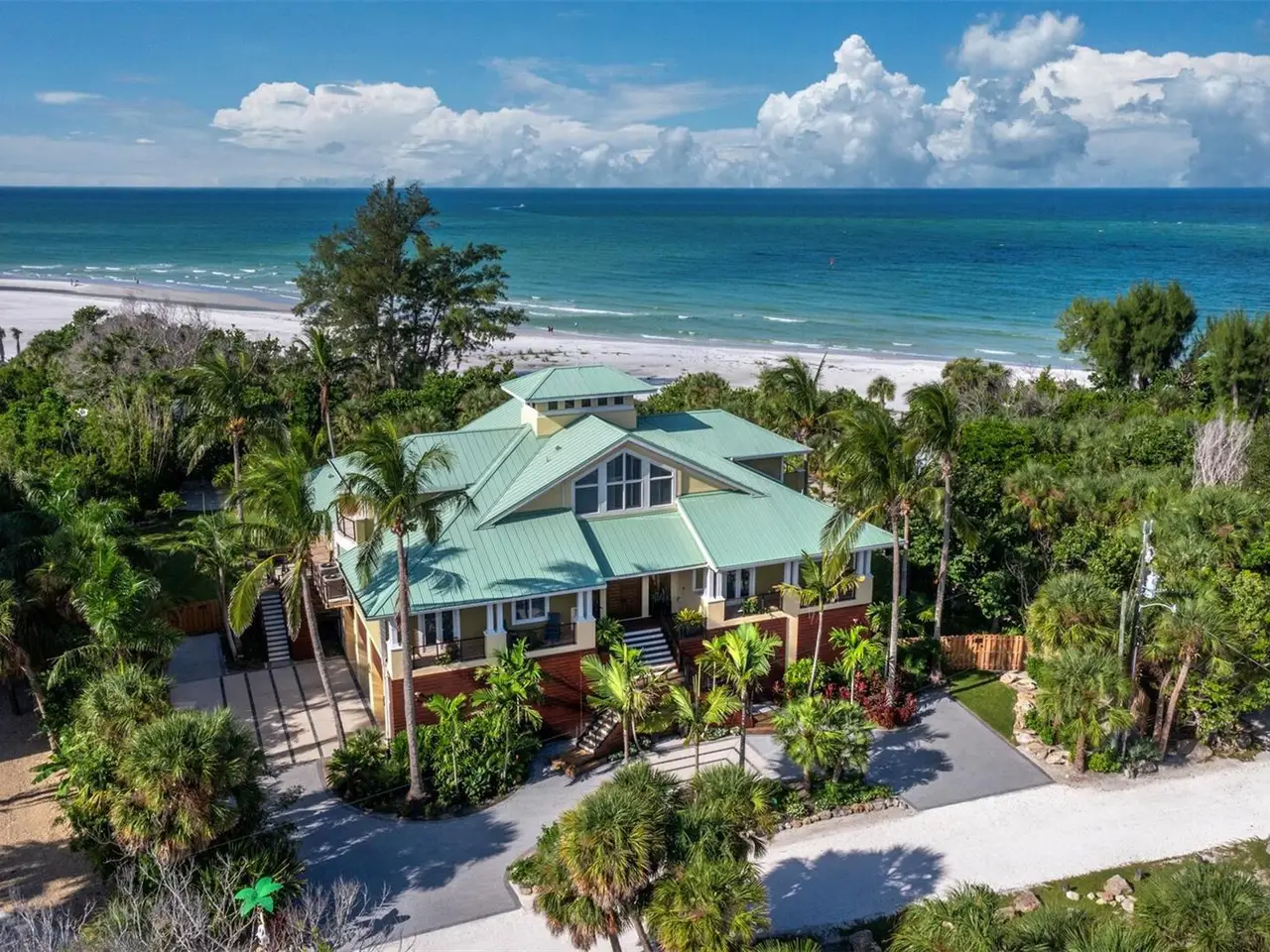 Welcome to this extraordinary Gulf-front estate located in one of Siesta Key’s most exclusive enclaves. Situated on a full acre in the private Sandy Hook community, this fully renovated, turnkey residence offers over 5,000 square feet of refined living space and more than 3,000 square feet of covered outdoor areas, all just a short stroll from Siesta Key Village and with direct access to a private community beach. Inside, the layout features five en-suite bedrooms, two powder baths, a dedicated office, and a three-car garage with beach cruisers and kayaks included. Floor-to-ceiling Andersen impact windows frame panoramic Gulf views, while rich finishes like Sapele mahogany siding, IPE hardwood decking, and a custom Pecky Cypress entertainment system reflect the home’s elevated craftsmanship. The chef’s kitchen is a showpiece, centered around a Labradorite Lumarian Blue granite island imported from Brazil, with Wolf, Miele, and Sub-Zero appliances throughout. The spa-inspired primary suite includes a waterfall feature wall, dual curbless shower, lighted soaking tub, and Toto smart toilets. A private elevator and full smart-home system ensure ease and efficiency. Outdoor living is exceptional, with a heated saltwater pool and Jacuzzi, a fully equipped summer kitchen, a covered outdoor living room with fireplace and TV, a poolside theater with dual fireplaces and TVs, and a sunset-facing gas fire pit. The professionally designed $1M+ tropical landscape includes advanced mosquito-misting and irrigation systems for effortless maintenance. With direct access to a private, resident-only beach and an ideal location just minutes from restaurants, shopping, and entertainment, this one-of-a-kind estate offers a rare opportunity to experience the best of coastal living on Siesta Key. Designed for elevated living and effortless enjoyment, 26 Sandy Hook Road S is more than a home—it is a fully realized Gulf-front sanctuary.