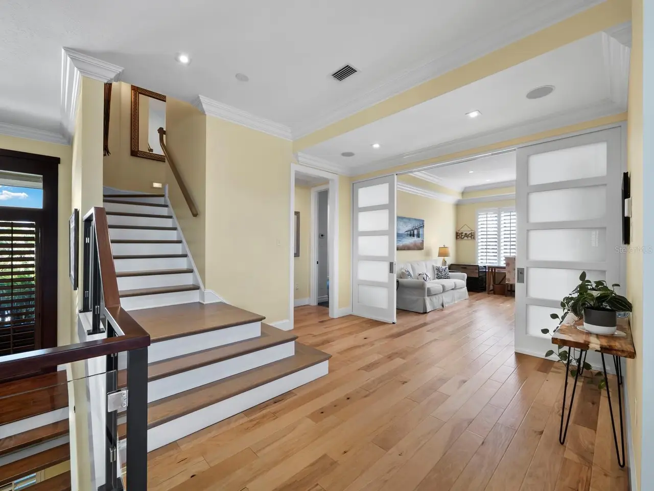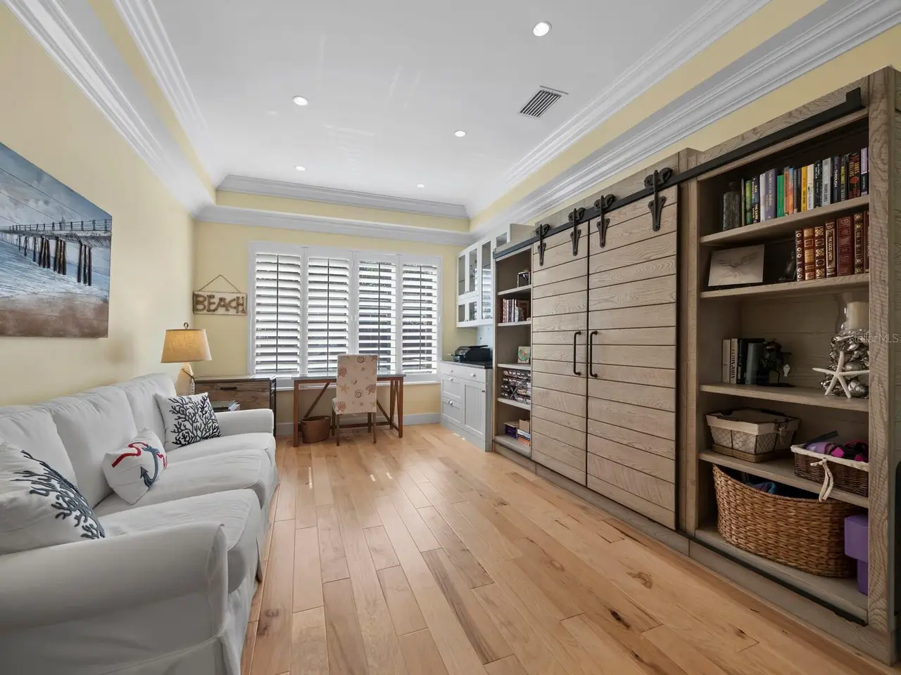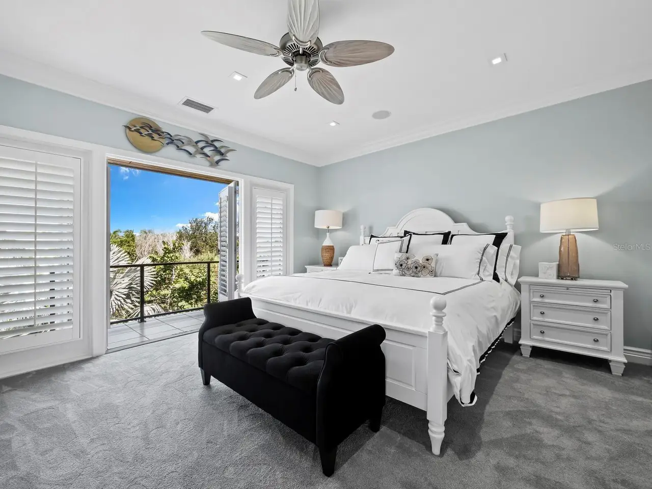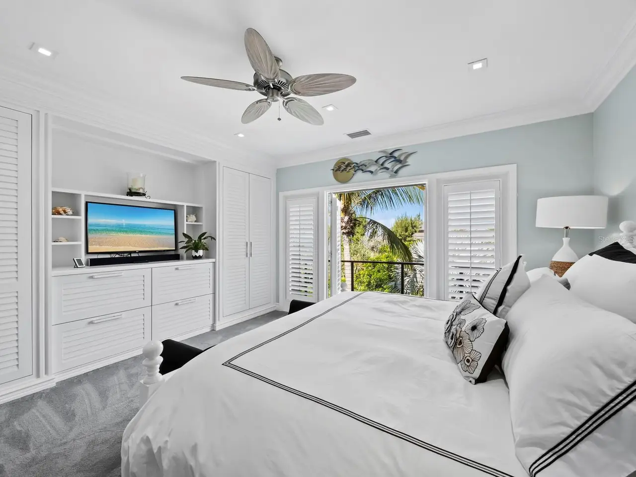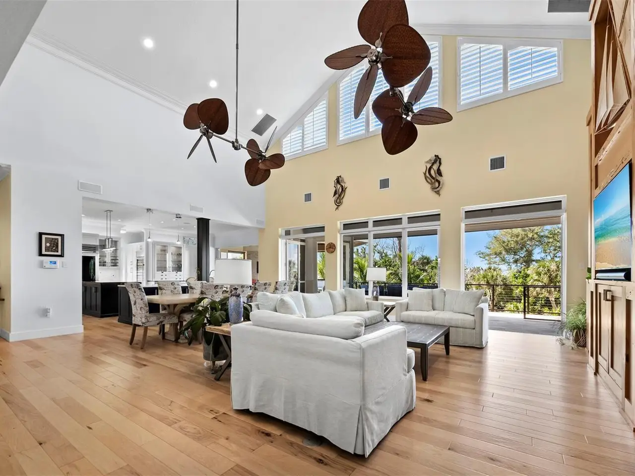 Welcome to this extraordinary Gulf-front estate located in one of Siesta Key’s most exclusive enclaves. Situated on a full acre in the private Sandy Hook community, this fully renovated, turnkey residence offers over 5,000 square feet of refined living space and more than 3,000 square feet of covered outdoor areas, all just a short stroll from Siesta Key Village and with direct access to a private community beach. Inside, the layout features five en-suite bedrooms, two powder baths, a dedicated office, and a three-car garage with beach cruisers and kayaks included. Floor-to-ceiling Andersen impact windows frame panoramic Gulf views, while rich finishes like Sapele mahogany siding, IPE hardwood decking, and a custom Pecky Cypress entertainment system reflect the home’s elevated craftsmanship. The chef’s kitchen is a showpiece, centered around a Labradorite Lumarian Blue granite island imported from Brazil, with Wolf, Miele, and Sub-Zero appliances throughout. The spa-inspired primary suite includes a waterfall feature wall, dual curbless shower, lighted soaking tub, and Toto smart toilets. A private elevator and full smart-home system ensure ease and efficiency. Outdoor living is exceptional, with a heated saltwater pool and Jacuzzi, a fully equipped summer kitchen, a covered outdoor living room with fireplace and TV, a poolside theater with dual fireplaces and TVs, and a sunset-facing gas fire pit. The professionally designed $1M+ tropical landscape includes advanced mosquito-misting and irrigation systems for effortless maintenance. With direct access to a private, resident-only beach and an ideal location just minutes from restaurants, shopping, and entertainment, this one-of-a-kind estate offers a rare opportunity to experience the best of coastal living on Siesta Key. Designed for elevated living and effortless enjoyment, 26 Sandy Hook Road S is more than a home—it is a fully realized Gulf-front sanctuary.