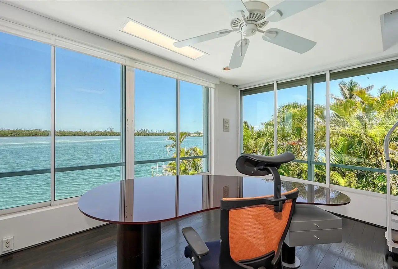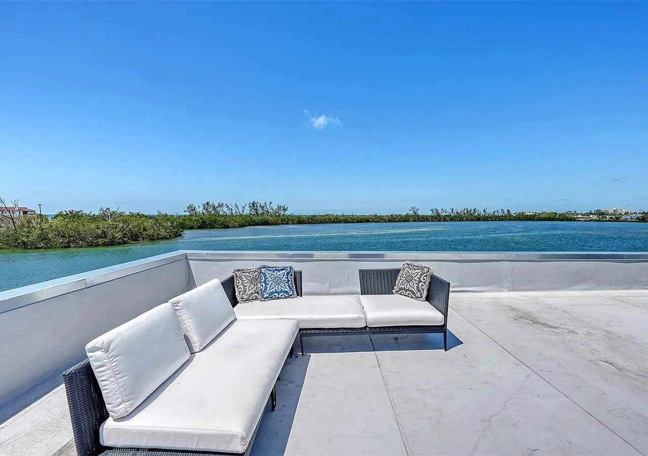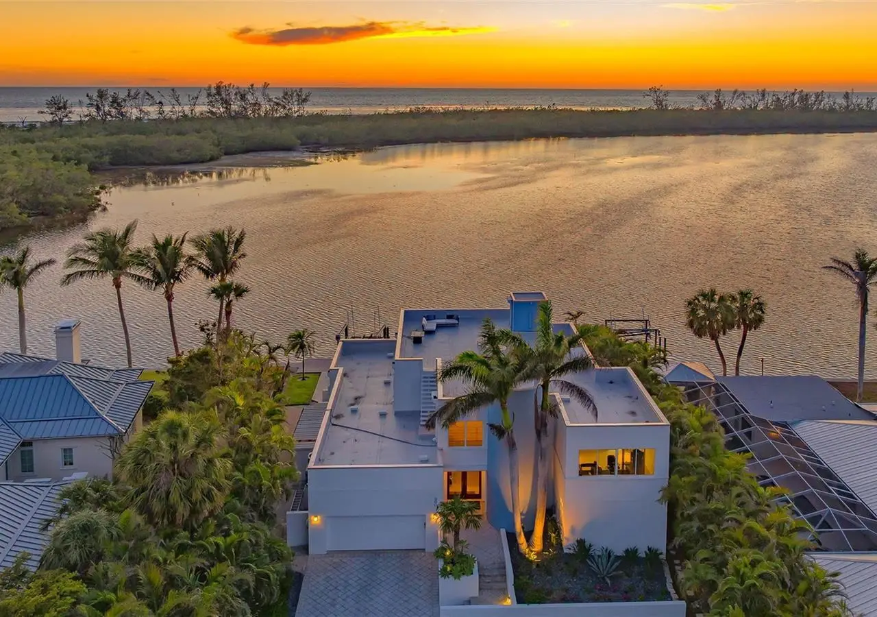 Owner has priced to sell this one-of-a-kind modern masterpiece, ideally positioned on premier boating water with sweeping, unobstructed views of the Bay and Gulf of Mexico. This exceptional residence offers a rare blend of architectural elegance and coastal sophistication, all within walking distance to the fine dining, boutiques, and cultural charm of St. Armands Circle. Floor-to-ceiling windows and soaring ceilings flood the home with natural light, while framing the mesmerizing water vistas from nearly every room. Designed for the discerning buyer, the gourmet kitchen features top-of-the-line Thermador appliances, including a newer refrigerator, wine cooler, and a professional-grade 6-burner gas range. The expansive floor plan includes four bedrooms and four bathrooms, highlighted by a serene upstairs primary suite with a private enclosed sunroom - currently serving as a tranquil home office. Meticulously maintained, the home boasts a brand-new roof (2024), a recently replaced seawall (2017), and dual-zoned Rheem AC systems. Additional features include electric hurricane shutters on most major windows, a whole-home speaker system, and lush, mature landscaping complemented by a secure gated entrance that enhances both privacy and curb appeal. The rooftop terrace offers a breathtaking vantage point for sunset views over the Gulf, completing this unparalleled offering. A true sanctuary for those seeking refined waterfront living.