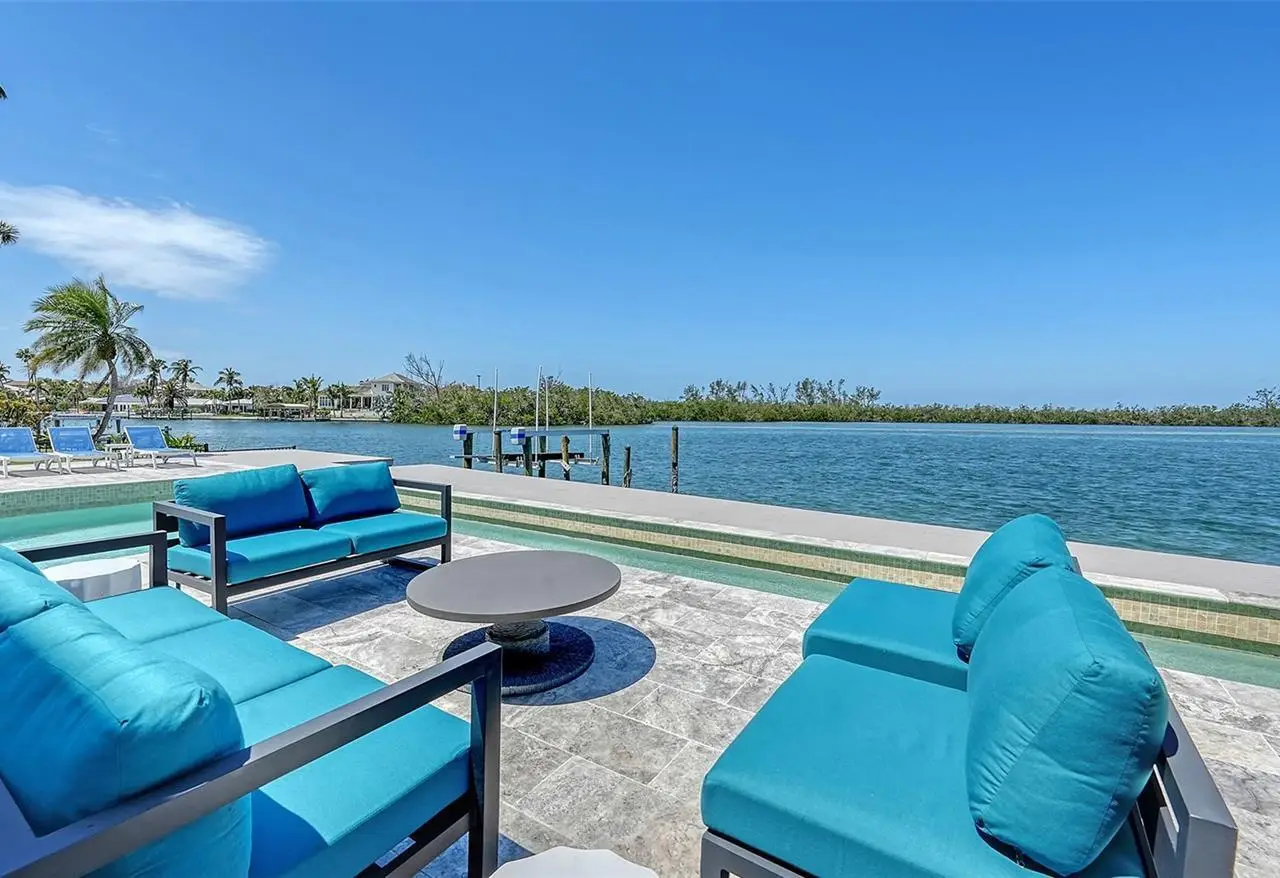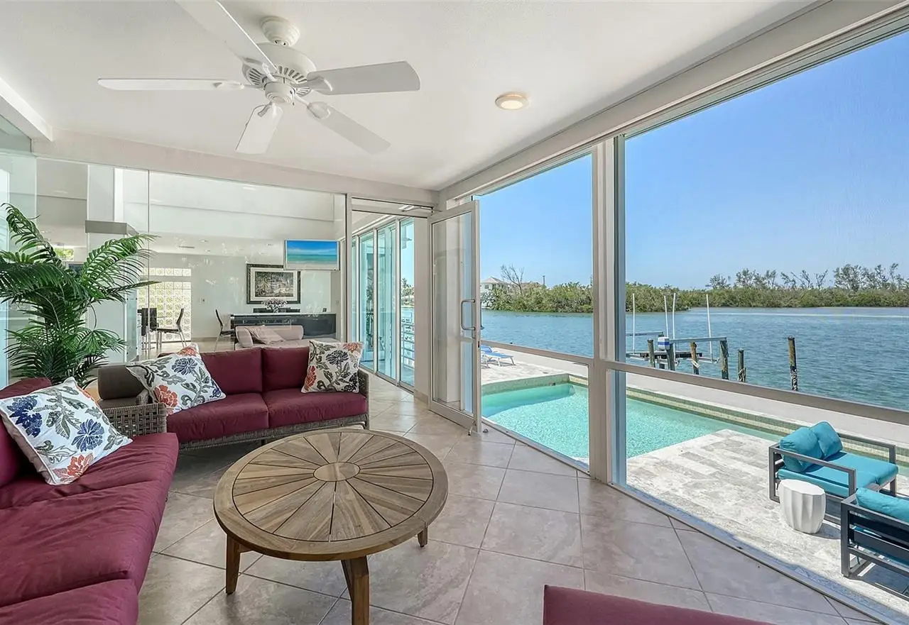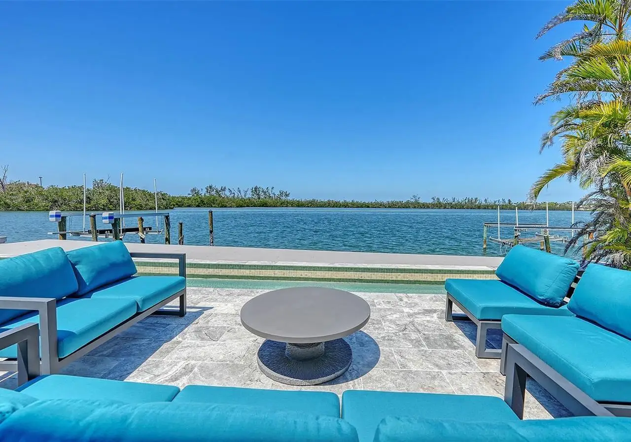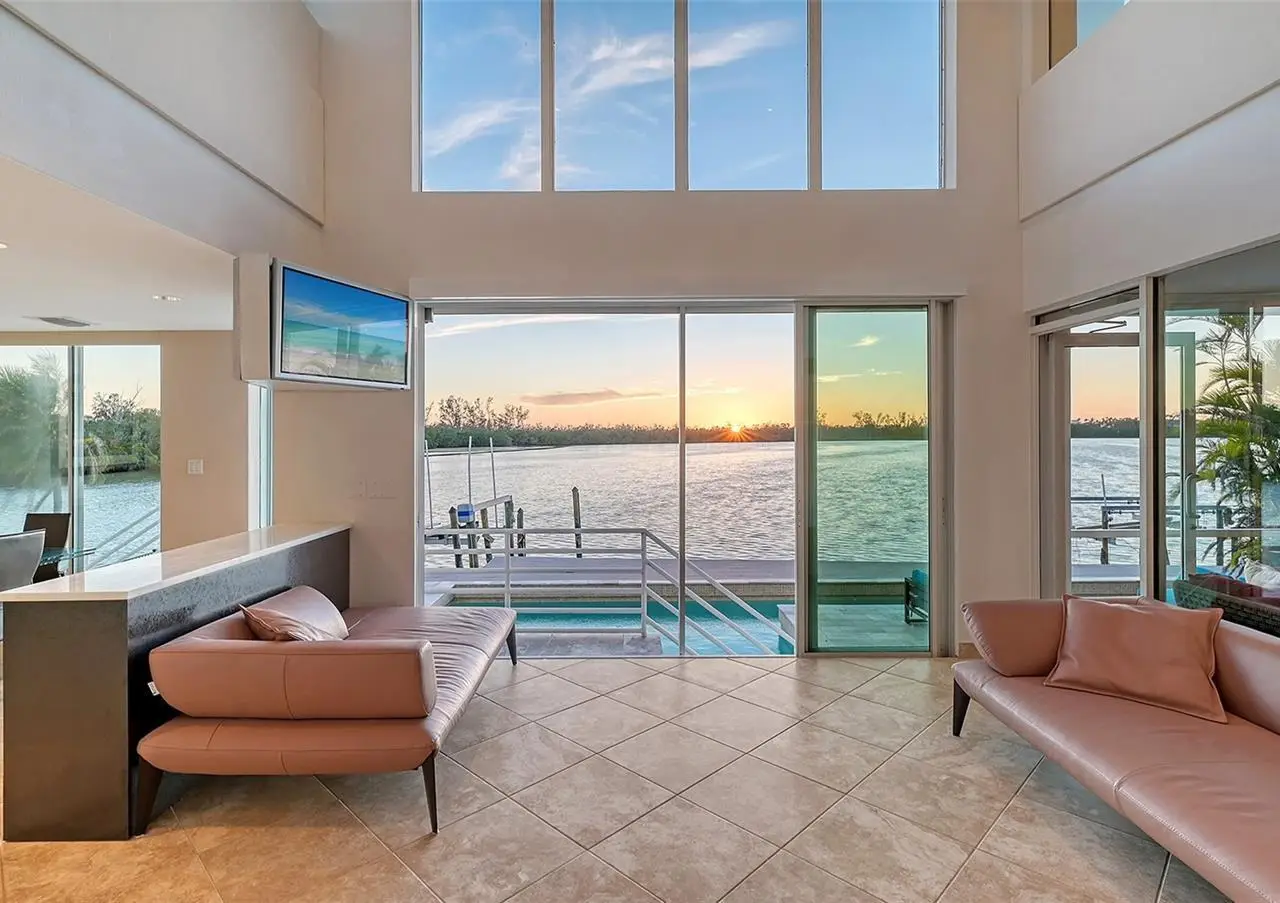 Owner has priced to sell this one-of-a-kind modern masterpiece, ideally positioned on premier boating water with sweeping, unobstructed views of the Bay and Gulf of Mexico. This exceptional residence offers a rare blend of architectural elegance and coastal sophistication, all within walking distance to the fine dining, boutiques, and cultural charm of St. Armands Circle. Floor-to-ceiling windows and soaring ceilings flood the home with natural light, while framing the mesmerizing water vistas from nearly every room. Designed for the discerning buyer, the gourmet kitchen features top-of-the-line Thermador appliances, including a newer refrigerator, wine cooler, and a professional-grade 6-burner gas range. The expansive floor plan includes four bedrooms and four bathrooms, highlighted by a serene upstairs primary suite with a private enclosed sunroom - currently serving as a tranquil home office. Meticulously maintained, the home boasts a brand-new roof (2024), a recently replaced seawall (2017), and dual-zoned Rheem AC systems. Additional features include electric hurricane shutters on most major windows, a whole-home speaker system, and lush, mature landscaping complemented by a secure gated entrance that enhances both privacy and curb appeal. The rooftop terrace offers a breathtaking vantage point for sunset views over the Gulf, completing this unparalleled offering. A true sanctuary for those seeking refined waterfront living.