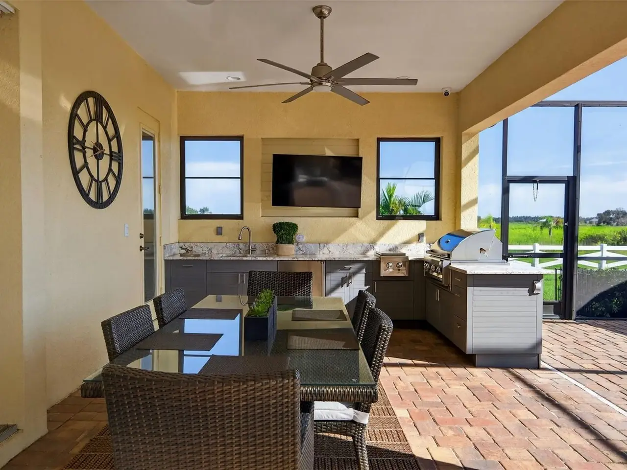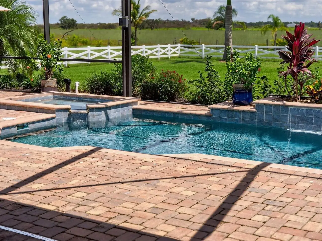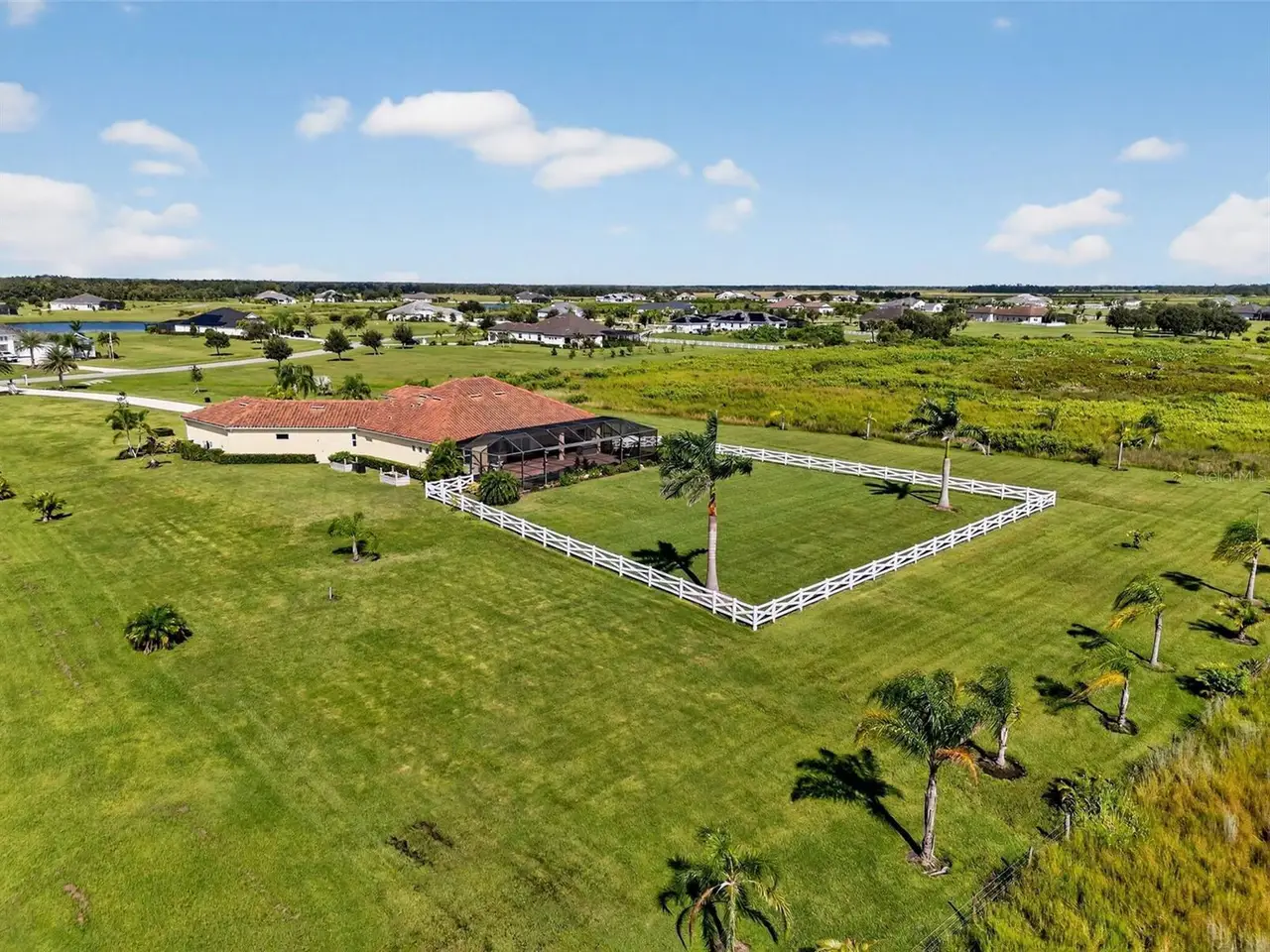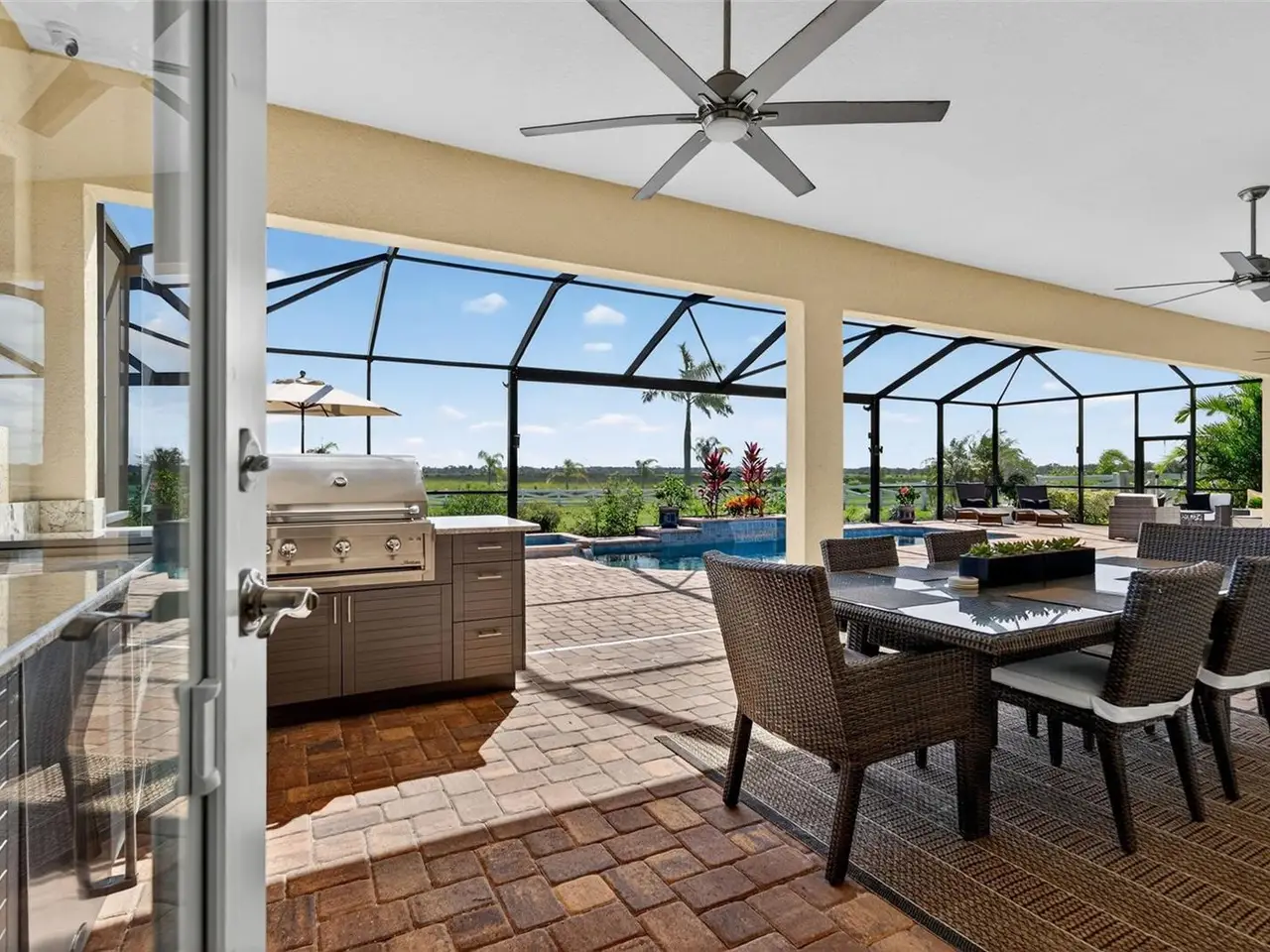 Experience the best of both worlds with this farm-to-table lifestyle — where two gardens, an abundance of fruit trees, and the beauty of rural living meet the convenience of Sarasota’s vibrant urban core just miles away. Set on a sprawling 3.5 acres in the picturesque community of Hampton Lakes, this custom Caicos model home combines refined elegance with everyday comfort. Step through the double glass doors into a spacious open floor plan featuring a formal dining area and a versatile den with double doors, a built-in Murphy bed, and sleek tile flooring. At the heart of the home, the gourmet chef’s kitchen is a showstopper — complete with wood cabinetry, quartz countertops, an induction cooktop, built-in wall oven, stainless steel range hood, corner walk-in pantry, and a central island with bar seating. A charming breakfast nook makes the perfect spot to enjoy the nearby nature. The great room is ideal for entertaining, with soaring tray ceilings, plantation shutters, and crown molding adding to the home’s timeless appeal. Two private bedroom suites provide comfort for family or guests, while the oversized primary suite offers a spa-inspired retreat with walk-in closets, double vanities, and a luxurious walk-in shower. Resort-style living continues outdoors on the expansive lanai, where a heated saltwater pool, fire pit, and state-of-the-art summer kitchen create the ultimate entertaining space. Panoramic screens showcase sweeping views, delivering a serene backdrop of peace and privacy. Additional features include an extended laundry room, oversized four-car air-conditioned garage, whole-house portable generator, outdoor lighting, and a buried 1,000-gallon propane tank. All this, just 10 minutes from I-75, offering unmatched access to Sarasota’s shopping, dining, and cultural lifestyle. This is where farm-to-table living meets refined luxury — a rare opportunity not to be missed.