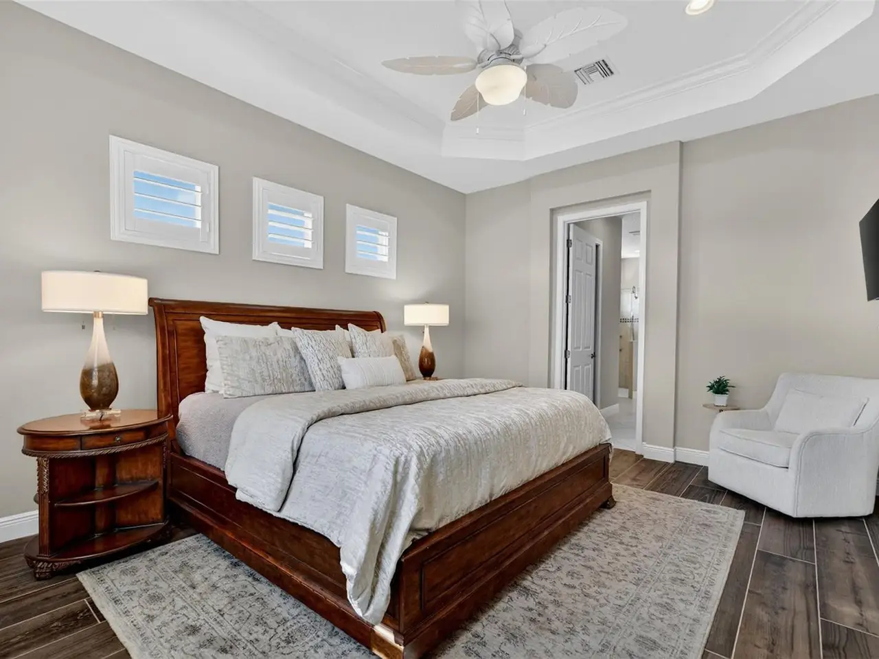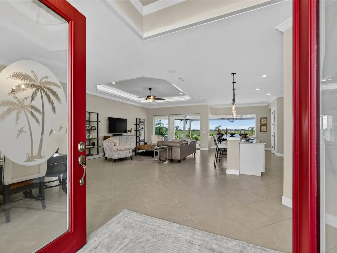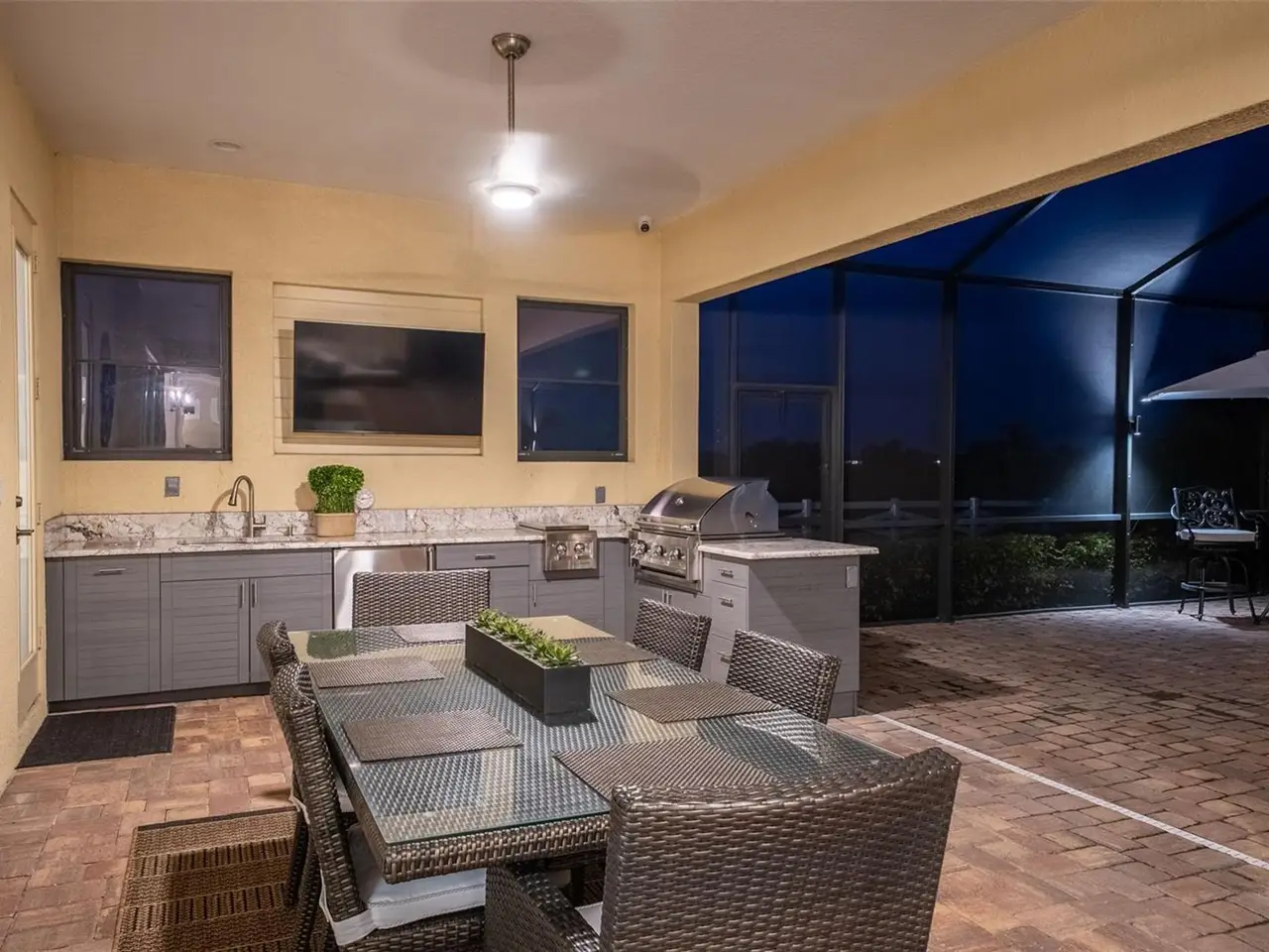 Experience the best of both worlds with this farm-to-table lifestyle — where two gardens, an abundance of fruit trees, and the beauty of rural living meet the convenience of Sarasota’s vibrant urban core just miles away. Set on a sprawling 3.5 acres in the picturesque community of Hampton Lakes, this custom Caicos model home combines refined elegance with everyday comfort. Step through the double glass doors into a spacious open floor plan featuring a formal dining area and a versatile den with double doors, a built-in Murphy bed, and sleek tile flooring. At the heart of the home, the gourmet chef’s kitchen is a showstopper — complete with wood cabinetry, quartz countertops, an induction cooktop, built-in wall oven, stainless steel range hood, corner walk-in pantry, and a central island with bar seating. A charming breakfast nook makes the perfect spot to enjoy the nearby nature. The great room is ideal for entertaining, with soaring tray ceilings, plantation shutters, and crown molding adding to the home’s timeless appeal. Two private bedroom suites provide comfort for family or guests, while the oversized primary suite offers a spa-inspired retreat with walk-in closets, double vanities, and a luxurious walk-in shower. Resort-style living continues outdoors on the expansive lanai, where a heated saltwater pool, fire pit, and state-of-the-art summer kitchen create the ultimate entertaining space. Panoramic screens showcase sweeping views, delivering a serene backdrop of peace and privacy. Additional features include an extended laundry room, oversized four-car air-conditioned garage, whole-house portable generator, outdoor lighting, and a buried 1,000-gallon propane tank. All this, just 10 minutes from I-75, offering unmatched access to Sarasota’s shopping, dining, and cultural lifestyle. This is where farm-to-table living meets refined luxury — a rare opportunity not to be missed.