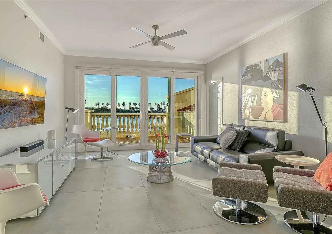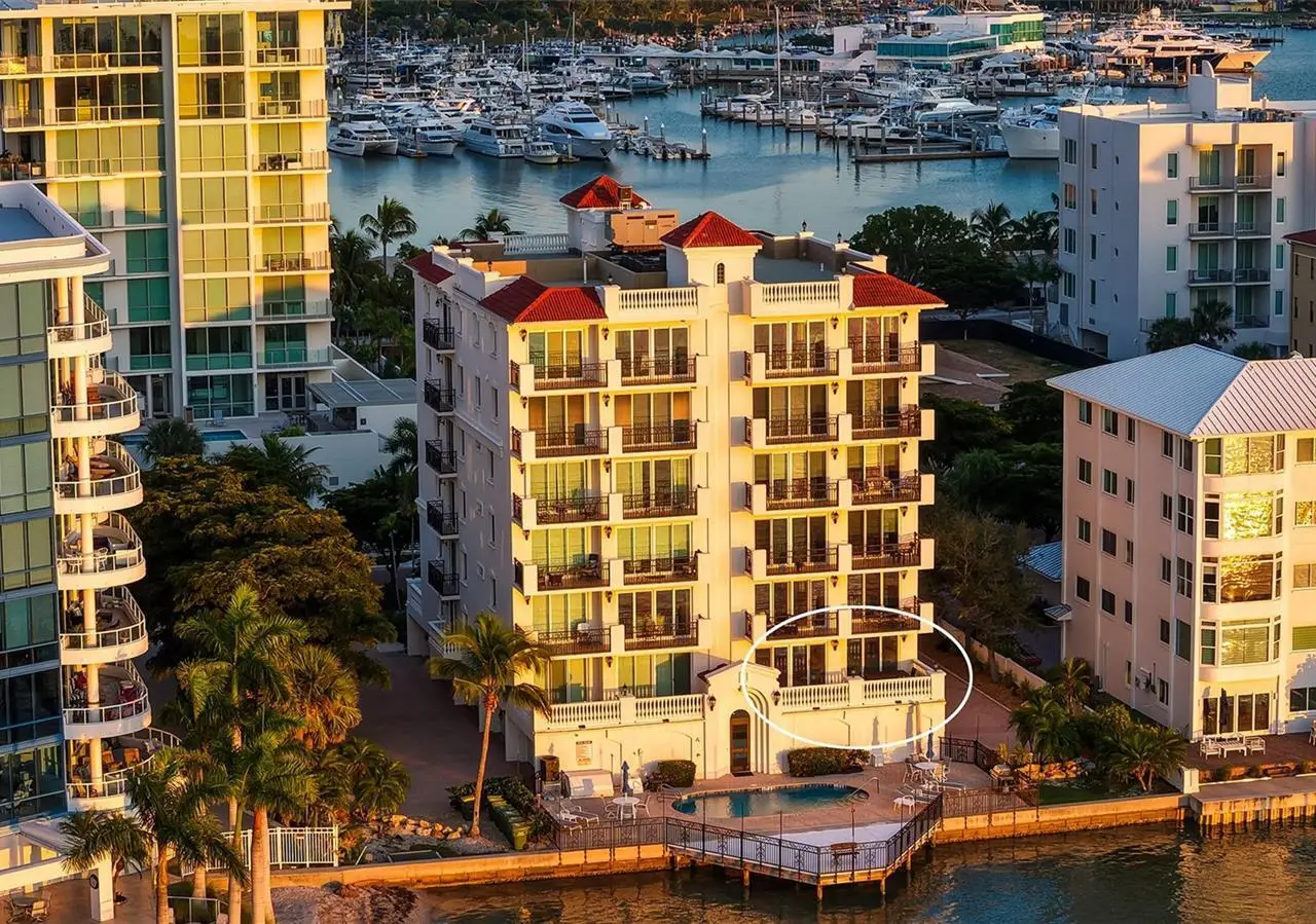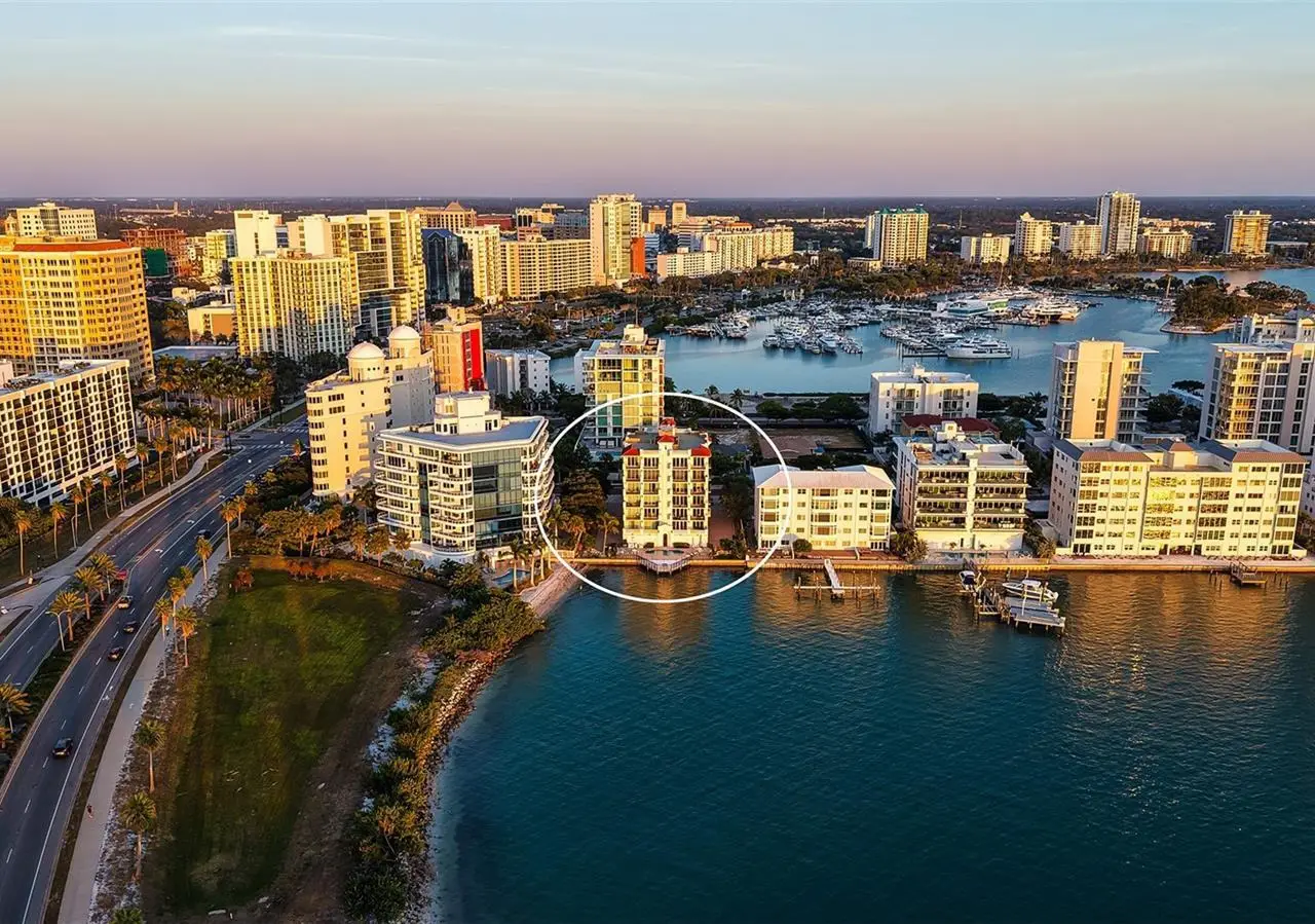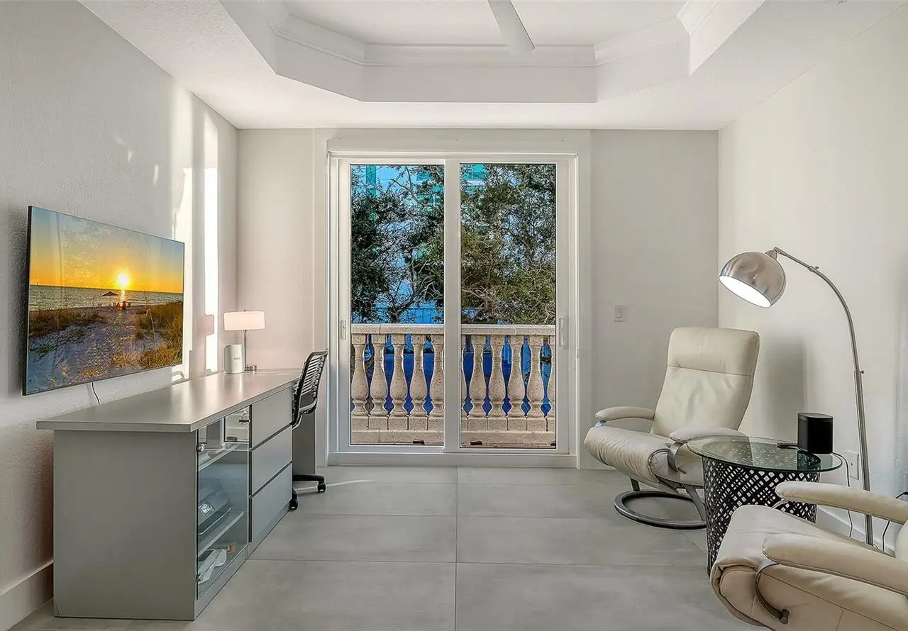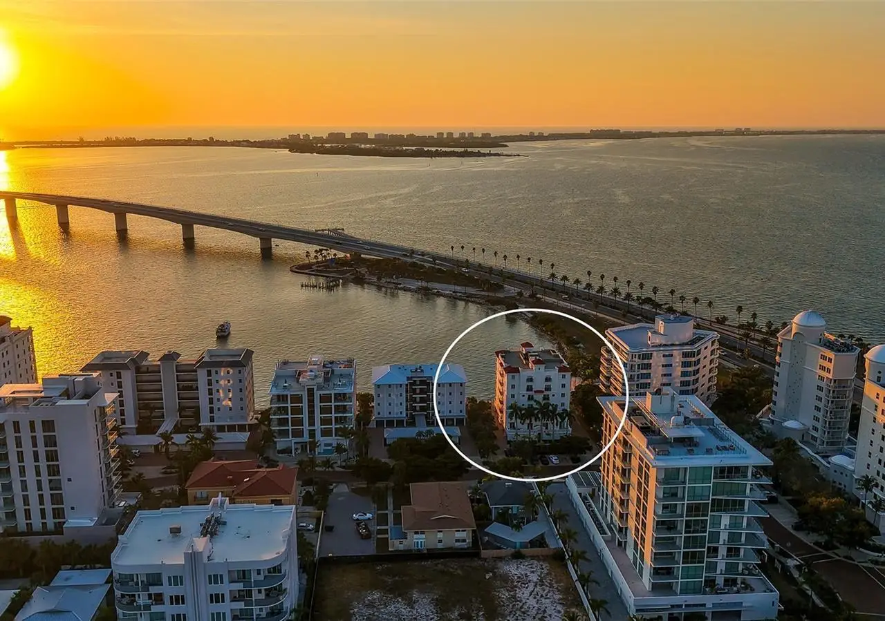 Direct waterfront on Golden Gate Point downtown Sarasota! Golden Bay is a boutique condominium building of only 10 units. You will enjoy the intimacy and peaceful setting of this remodeled residence overlooking Sarasota Bay and Ringling Bridge. An elevator will bring you directly to your private foyer. The sunsets are spectacular! This second-floor corner unit features high ceilings, 3 bedrooms, an office/4th brm, 3 full baths and benefits of two large terraces (27' x 9'). The West sunsets terrace is accessible from the living room and the primary bedroom, and the East sunrises terrace is accessible from the two guest bedrooms. The current owners replaced all the windows and patio doors, updated the entire unit with a 4x2 grey porcelain tiles, redid all 3 bathrooms, and installed custom blinds on all windows. The gourmet kitchen is equipped with stainless-steel appliances including a Sub Zero refrigerator, white cabinetry with lots of storage, beautiful new quartz countertops, and two wine refrigerators. The spacious primary suite, with access to the terrace that overlooks the bay, provides two walk-in closets, an elegant bathroom with two sinks, a walk-in shower, and a comfortable sitting area (plumbing in place for a tub if desired). Both guest bedrooms are en-suite.The large office has a slider door that opens to a Romeo & Juliette balcony, has a double closet and can be used as a 4th bedroom. Well thought laundry room with cabinetry, a sink, and stackable washer/dryer will facilitate your task. There is an additional stairway directly from your unit that goes to your private sizeable 2 car garage 19’ x 25’ and the pool deck where you can grill and enjoy the heated pool and day dock. On the desired Golden Gate Point, this location is a short walk to restaurants, theatres, shops, and minutes to famous St. Armands Circle and sandy Lido Beach.