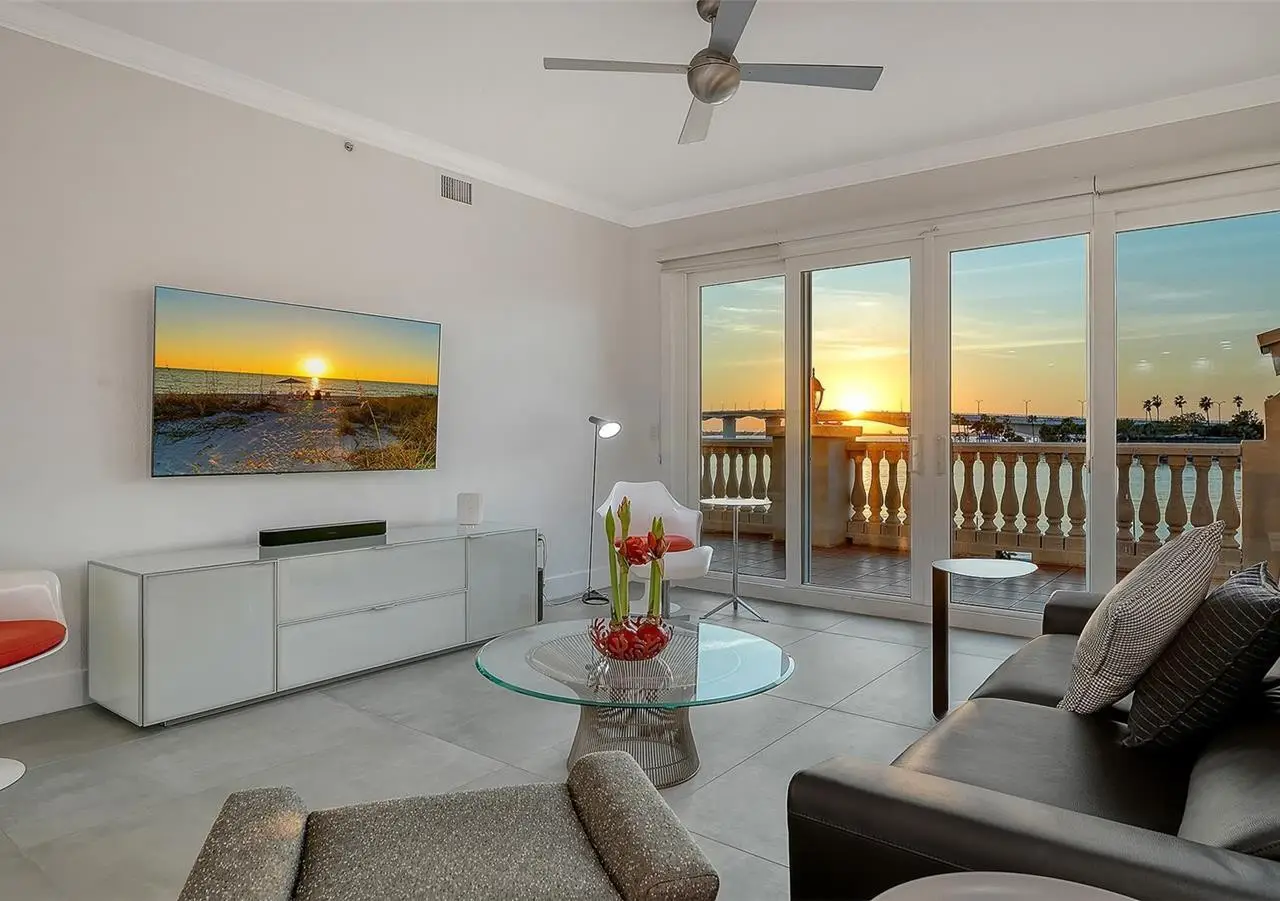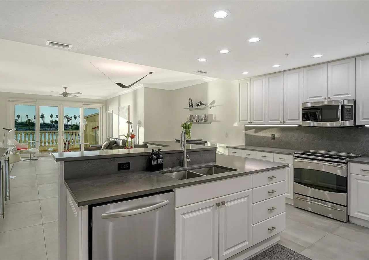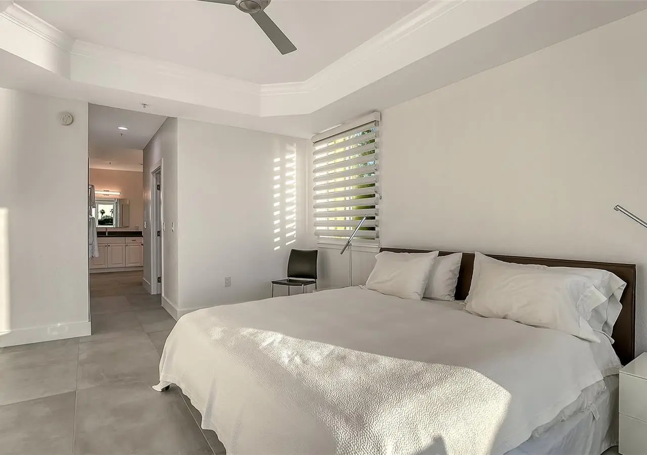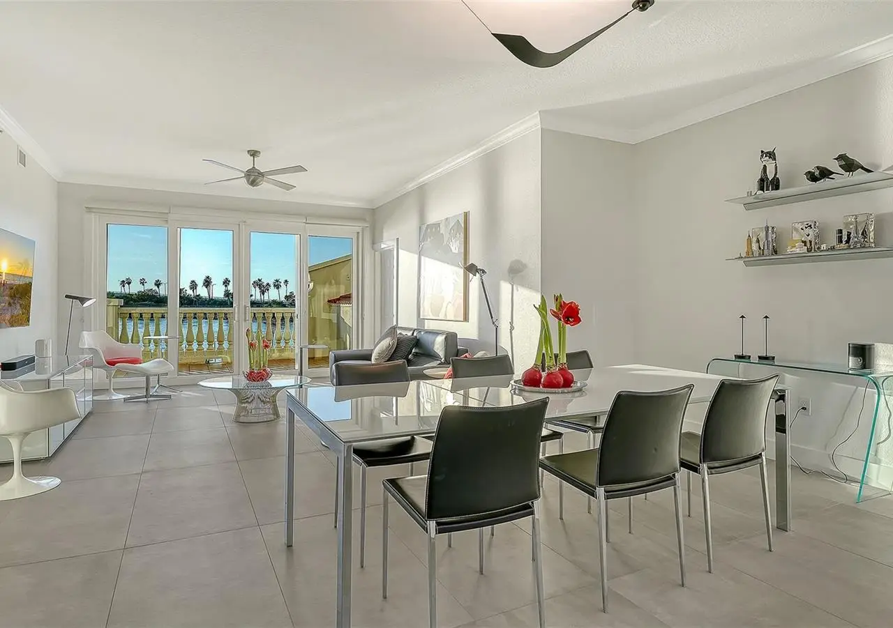 Direct waterfront on Golden Gate Point downtown Sarasota! Golden Bay is a boutique condominium building of only 10 units. You will enjoy the intimacy and peaceful setting of this remodeled residence overlooking Sarasota Bay and Ringling Bridge. An elevator will bring you directly to your private foyer. The sunsets are spectacular! This second-floor corner unit features high ceilings, 3 bedrooms, an office/4th brm, 3 full baths and benefits of two large terraces (27' x 9'). The West sunsets terrace is accessible from the living room and the primary bedroom, and the East sunrises terrace is accessible from the two guest bedrooms. The current owners replaced all the windows and patio doors, updated the entire unit with a 4x2 grey porcelain tiles, redid all 3 bathrooms, and installed custom blinds on all windows. The gourmet kitchen is equipped with stainless-steel appliances including a Sub Zero refrigerator, white cabinetry with lots of storage, beautiful new quartz countertops, and two wine refrigerators. The spacious primary suite, with access to the terrace that overlooks the bay, provides two walk-in closets, an elegant bathroom with two sinks, a walk-in shower, and a comfortable sitting area (plumbing in place for a tub if desired). Both guest bedrooms are en-suite.The large office has a slider door that opens to a Romeo & Juliette balcony, has a double closet and can be used as a 4th bedroom. Well thought laundry room with cabinetry, a sink, and stackable washer/dryer will facilitate your task. There is an additional stairway directly from your unit that goes to your private sizeable 2 car garage 19’ x 25’ and the pool deck where you can grill and enjoy the heated pool and day dock. On the desired Golden Gate Point, this location is a short walk to restaurants, theatres, shops, and minutes to famous St. Armands Circle and sandy Lido Beach.