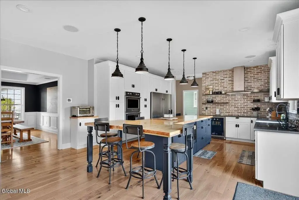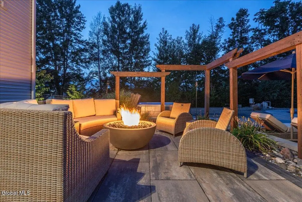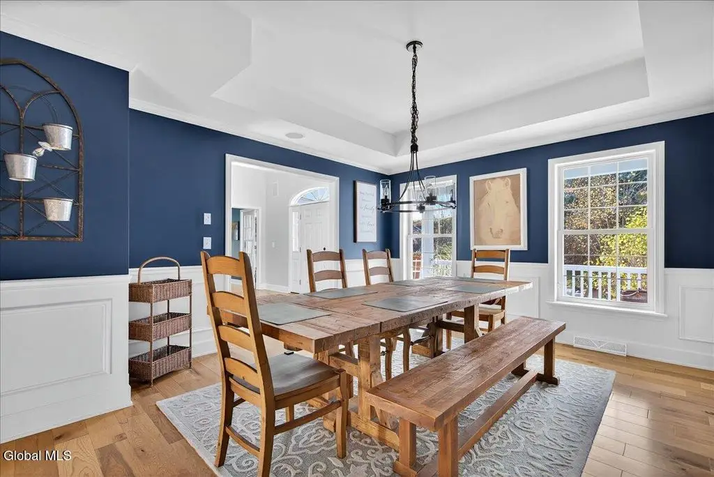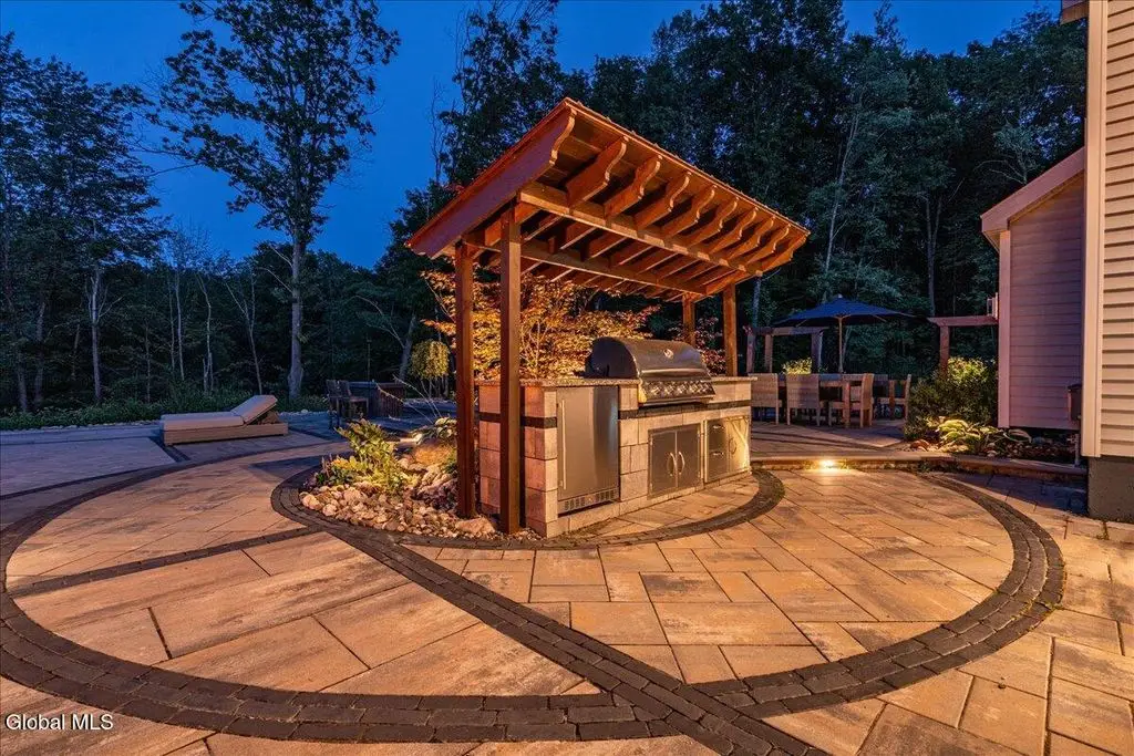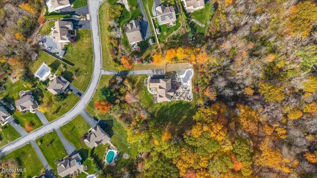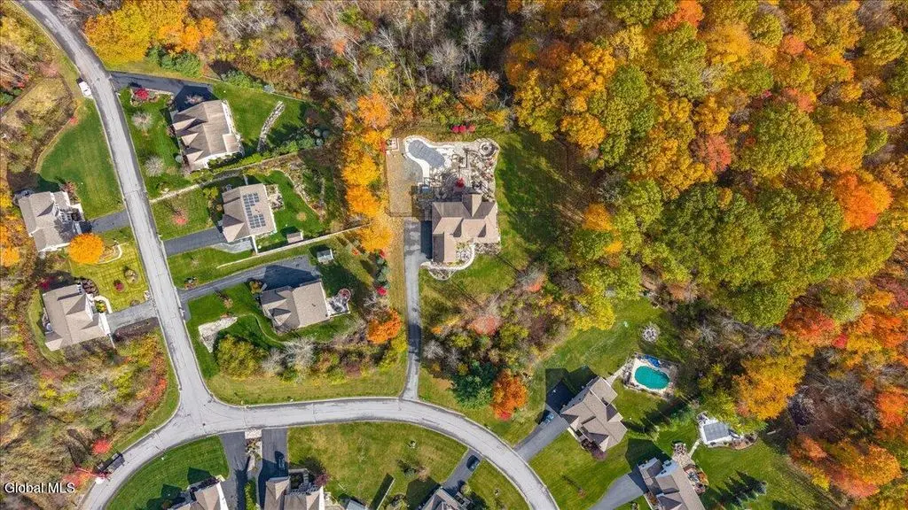 Welcome to this exceptional statement home in the prestigious Winding Brook Estates, where timeless elegance meets modern indulgence. Situated on a beautifully landscaped 1.98 acre lot, this custom-built residence offers unmatched privacy, superior craftsmanship, and resort-style amenities. Property highlights include over 4000 sf of luxury w/ 5 bedrooms, 4.5 baths, hardwood floors and surround sound throughout. Stroll by the beautifully landscaped entry path and serene water feature to the grand two-story entry and expansive open floor plan. You'll appreciate your own corner office, private and stylish. Be amazed by the massive two-story brick accent wall and gas fireplace in the great room. The gorgeous modern kitchen features an incredible butcher block center island w/seating for 8, granite countertops, farmhouse sink, double oven, wine fridge, brick accents and custom cabinetry. The elegant dining room boasts a tray ceiling, wainscoting, and chair rail detailing. First-floor guest suite with full bath. Plus convenient mud room, laundry and guest half bath. Upstairs the spacious primary retreat rewards you with luxury and style. Indulge in the his-and-her walk-in closet or take a spa day in the jetted soaking tub. In addition there's a dual sink vanity, walk-in shower, private throne room and abundant natural light. Three additional upstairs bedrooms; 2 with Jack & Jill bath and generous closet space, one with private bath. Fully finished lower level with granite entertainment bar, home theater, bonus office/den, and egress window. The outdoor oasis features a Saltwater inground pool and hot tub surrounded by lush landscaping. Custom paver patio with multiple seating areas and built-in covered kitchen w/BBQ and fridge. Gas firepit for year-round gatherings. Surround sound system extends seamlessly from inside to outdoors. Lawn sprinklers in front & back for easy maintenance. A short drive from downtown Saratoga Springs, minutes to Saratoga Lake