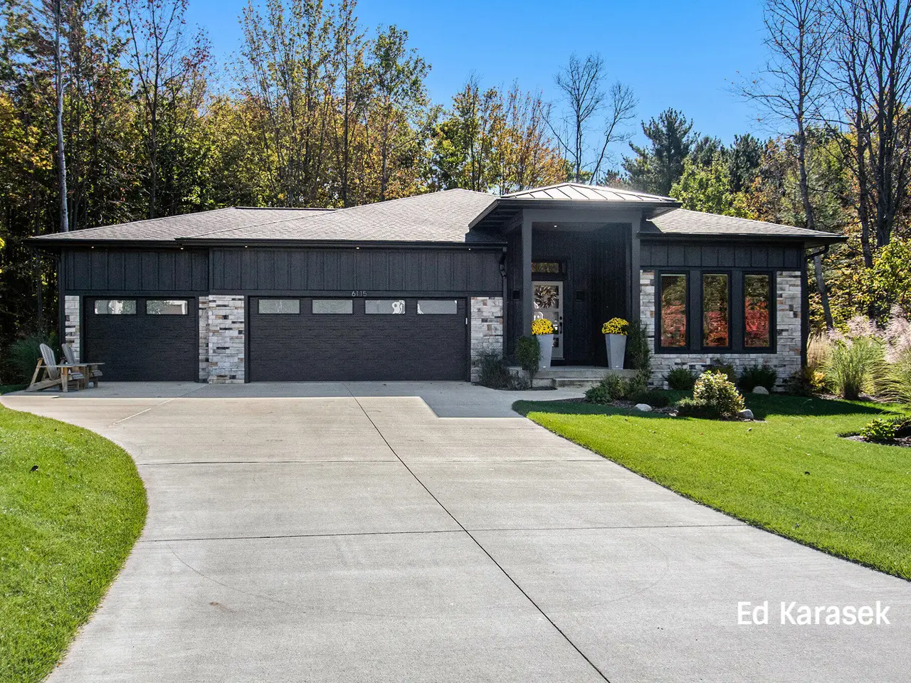 Stunning contemporary ranch in The Ravines, Southwestern Michigan's premier golf community. Set on 1.1 wooded acres, this like-new walkout home offers approx. 3,700 sq ft finished living space with three bedrooms, three full baths, exercise room, and flexible office/bedroom. Enjoy open-concept living, 9' ceilings, engineered hardwood floors, fireplace centered Great Room, a spacious kitchen with custom cabinetry and stainless appliances, and a dedicated pantry accessible from the three-car garage. Ensuite primary bedroom and bath featuring dual sinks and custom tiled shower, with spacious walk-in closet. Lower level features a family room with kitchenette and walkout access, plus a hot tub. Community amenities include private road maintenance, snow removal, trash/recycling, in-ground pool, and sewer infrastructure. Minutes to downtown Saugatuck, Holland, and Grand Rapids--close to beaches, dining, and entertainment. Short-term rentals not allowed, preserving the peaceful setting.