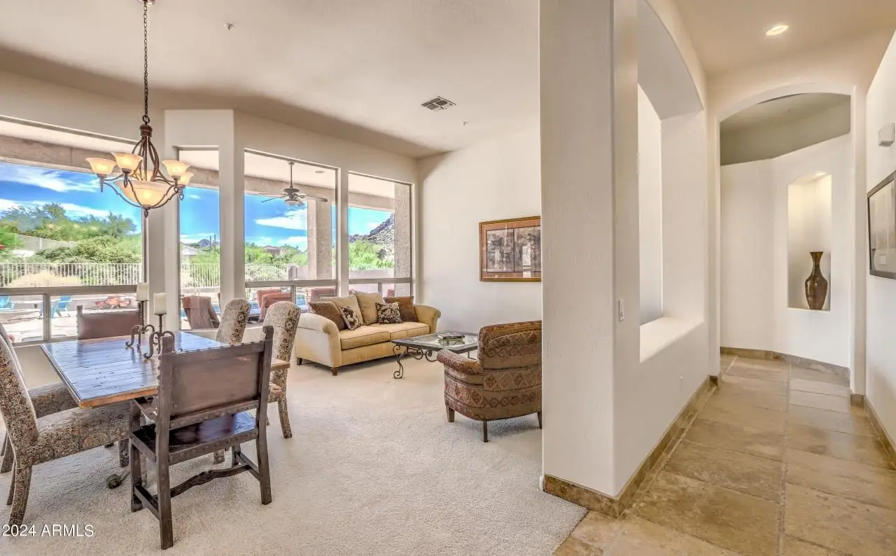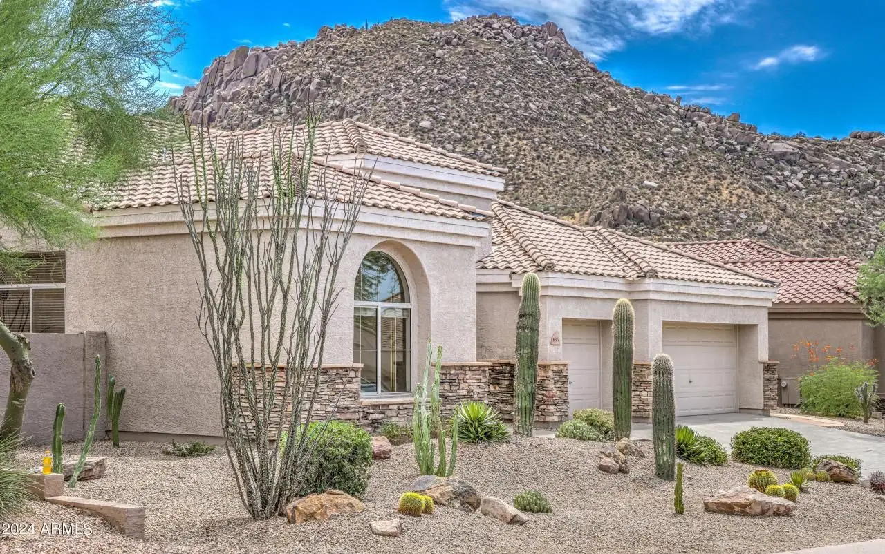 This beautifully maintained home, nestled in the desirable Troon neighborhood, offers a perfect blend of classic charm and modern convenience, set against the breathtaking backdrop of Troon Mountain. Upon entering, you’ll immediately appreciate the expansive windows showcasing picturesque desert landscaping and gorgeous mountain views. The spacious split floorplan ensures privacy and comfort featuring three generously sized bedrooms plus a versatile den, ideal for a home office, playroom, or additional guest space. The open-concept living and dining spaces create an inviting atmosphere for both relaxing and entertaining, while the well-appointed kitchen boasts ample cabinetry, counter space, and modern stainless steel appliances, making meal preparation a pleasure. The highly desirable south-facing yard offers a perfect low-maintenance spot for outdoor dining, gardening, or simply soaking in the stunning scenery. This home is ideally located near a variety of amenities, including world-class golf courses, hiking trails, and vibrant dining and shopping options. Troon is renowned for its natural beauty and outdoor recreational opportunities, ensuring you'll always have something to explore right in your backyard.