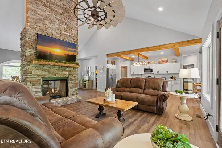 OFFERING FREE APPRAISAL OR DISCOUNTED RATE WITH PREFERRED LENDER Welcome to Summit Trails Sanctuary — A Luxury Mountain Retreat in The Summit on Bluff Mountain Tucked away in the majestic Great Smoky Mountains of East Tennessee, Summit Trails Sanctuary offers the perfect blend of luxury, comfort, and seclusion. Located in the highly desirable The Summit on Bluff Mountain subdivision, this newer-construction home is surrounded by mature trees and natural beauty, offering incredible privacy and a peaceful wooded setting — complete with a creek that touches the property. Step inside and you're welcomed by a gorgeous see-thru stone fireplace that elegantly separates the formal dining room from the cozy living area. The open-concept design connects the chef's kitchen, living room, and eat-in kitchen area, allowing for effortless entertaining and everyday comfort. The home features three private suites, including two true master bedrooms, each with its own bathroom and walk-in closet. A spacious bonus room, currently set up as a game room with a pool table and arcade machines, adds extra versatility and fun. Step outside to the covered back porch and take in the sounds of the creek and rustling trees while enjoying your morning coffee or evening drink. The porch includes a hot tub and lounge seating, while the lower patio offers a fire pit, picnic table, and grill, all inside a fully fenced backyard—ideal for private outdoor gatherings. This property is completely TURN KEY—sold fully furnished and ready for immediate use as a short-term rental, second home, or full-time residence. Whether you're looking for a peaceful retreat or an opportunity to generate rental income, this home is ready for its next chapter. With 2,712 sq ft of heated/cooled space and 3,570 total sq ft including the garage, porches, and deck—this private mountain escape offers beauty, flexibility, and charm in one of East Tennessee's most scenic locations. Privacy. Nature. Possibility. Schedule your showing at Summit Trails Sanctuary today!