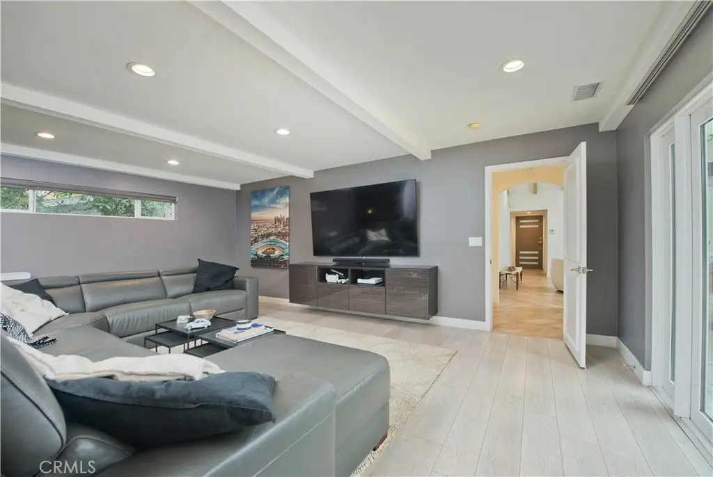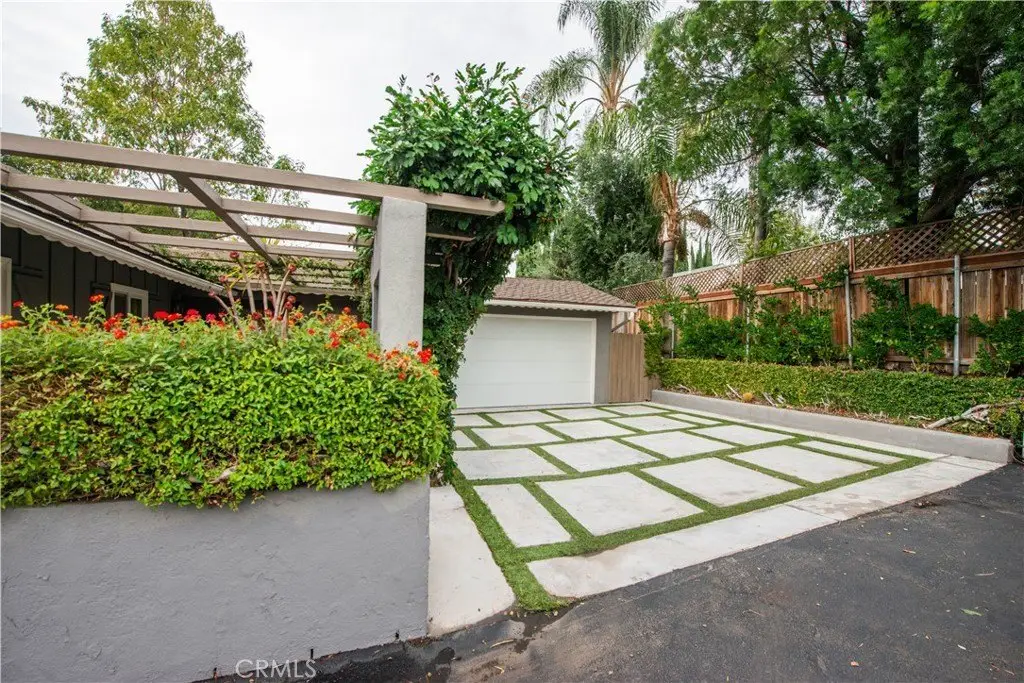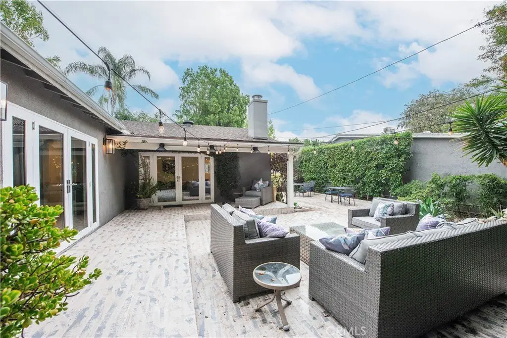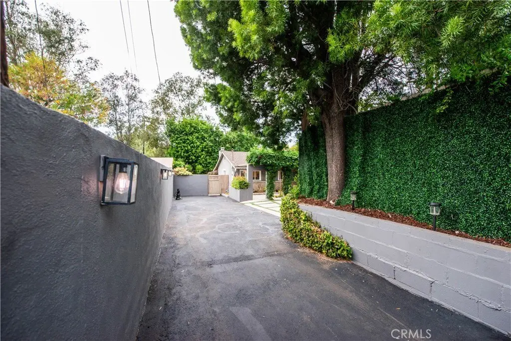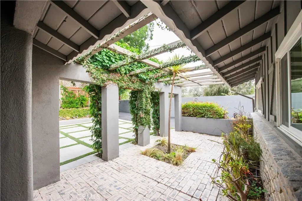 Nestled down a secluded, gated private driveway in the highly desirable Fashion Square district, this exceptional single level residence is highlighted with elegant wood and tile floors, loads of natural light and its timeless designer details. Upon entering the main living area, you are immediately captivated by the dramatic space, enhanced with its soaring ceilings, central fireplace, generous picture windows and French doors that pour in natural light. Opening from the living room is the expansive dining room that flows naturally into the perfectly updated kitchen, equipped with stainless steel appliances, custom cabinetry, and beautiful quartz countertops. Both the primary and secondary bedroom feature updated en-suite bathrooms, both enhanced by their luxurious wood beamed ceilings, with the oversized third bedroom offering direct access to the private rear yard patio. Step outside and decompress in the ultra-private rear yard with expansive entertaining areas surrounded by mature landscape, enhanced by the tranquil sound of its custom water feature, enjoy a round at your private putting green or explore the rear garden set under a canopy of lush trees. This home offers a rare combination of privacy and convenience tucked away from it all, yet moments from premier shopping and dining venues. Don’t miss this opportunity to enjoy a timeless home with distinctive character and beautiful updates in a premier Sherman Oaks location!