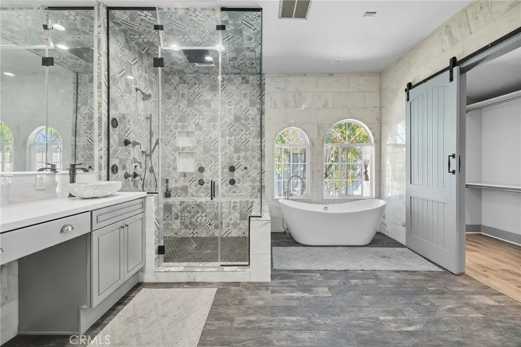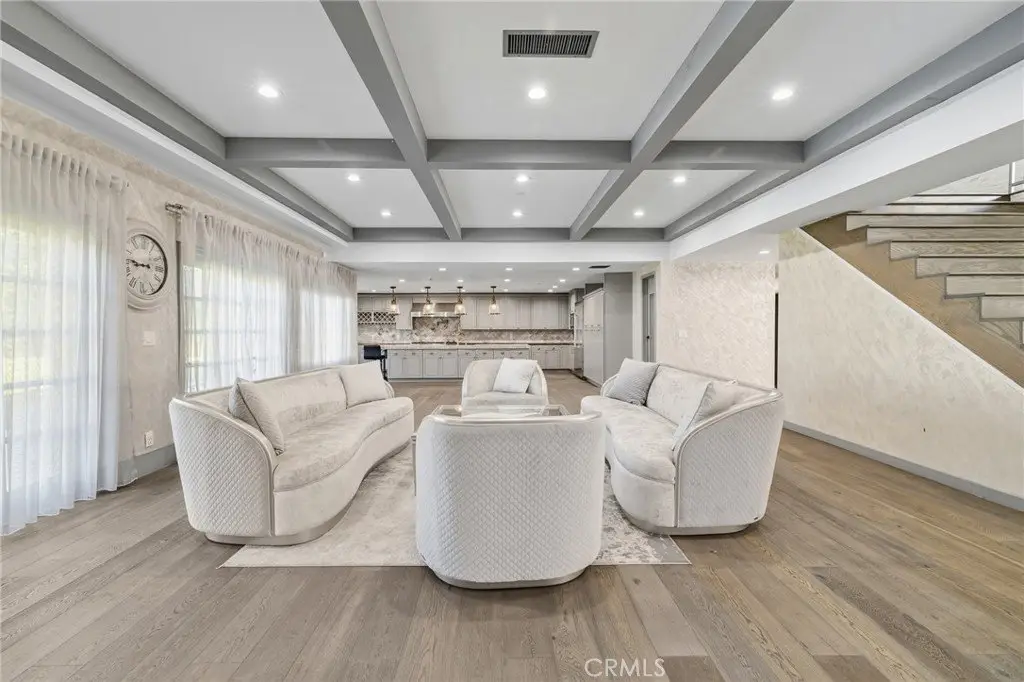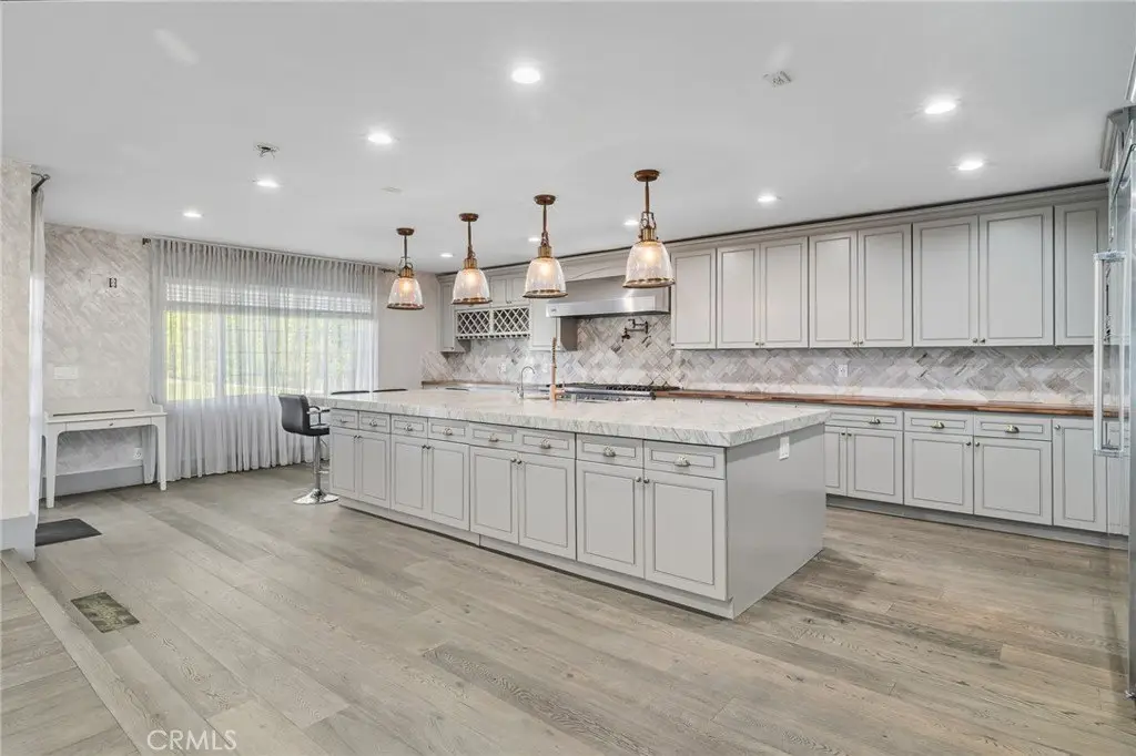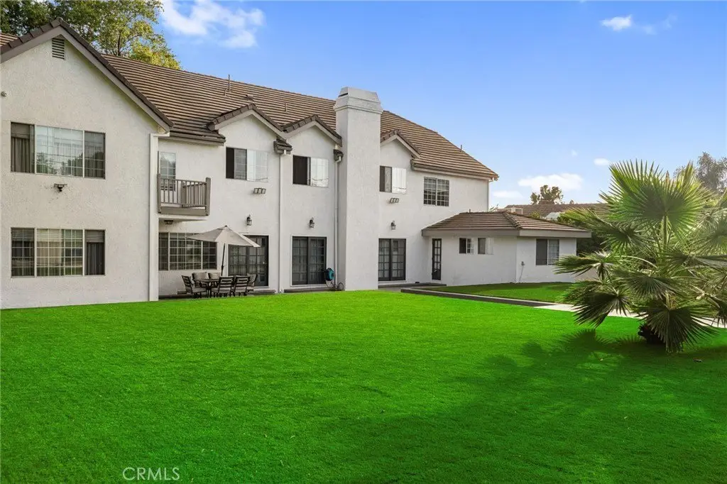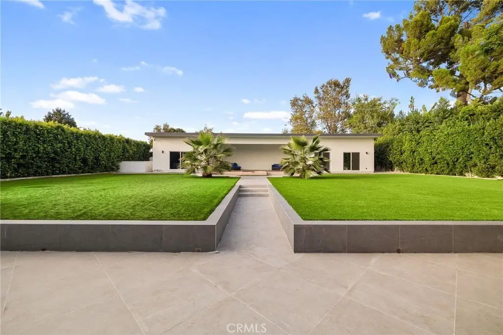 Welcome to this elegantly remodeled estate in the highly desirable community of Sherwood Forest, one of the largest homes in the neighborhood. This 7, 007 square foot residence is situated on a rare 21, 000 square foot lot. As you enter through the automatic gates, you are greeted by an expansive circular driveway and this modern contemporary Tudor home. The wrought iron double entry glass doors welcome you into a vast open floor plan that includes a grand family room, a sitting foyer, a formal dining room, and a remodeled kitchen. The eye-catching, upgraded oversized kitchen island, complete with custom built-in drawers and a breakfast bar, invites you into a chef's kitchen. All stainless steel appliances and custom cabinetry, accented with brass hardware, enhance your cooking experience. This bright open space is perfect for entertaining and welcoming families. The main floor's west wing features a spacious and desirable first-floor bedroom suite with a walk-in closet and private bath, along with one of two laundry areas. The east wing boasts a beautifully remodeled powder room and guest quarters, complete with a bedroom, a private bath, and an additional room with custom built-in cabinets, ideal for an in-home office or gym. The luxurious double-wide staircase leads you to a total of five upper bedrooms. Two spacious bedrooms are located in the upper east wing, accompanied by a remodeled bathroom in the common area. Two additional bedrooms with a Jack and Jill bathroom and vaulted ceilings are situated in the upper middle area, leaving the entire upper west wing dedicated to the primary suite. The primary suite features high vaulted ceilings, perfect for the elegant chandelier that greets you at the double door entrance. Custom built-ins, a retreat area with a fireplace, and a balcony create a cozy atmosphere within this expansive wing. As you enter the barn door-enclosed bathroom, relax in the glass-enclosed mosaic-tiled walk-in shower, complete with multiple shower heads and jets. Alternatively, find sanctuary in the Roman bathtub, perfect for soaking. A specially designed, automatically lit massive walk-in closet offers ample space for clothing, shoes, and accessories. The backyard is an entertainer's dream, featuring a sprawling turfed lawn that leads to a pool, tiled flooring, and lush landscaping. An additional value-added ADU with 1 bedroom and 1 bathroom-17155 Rayen, aprox. add. 800 sq ft offers its own address, making it perfect for in-laws.