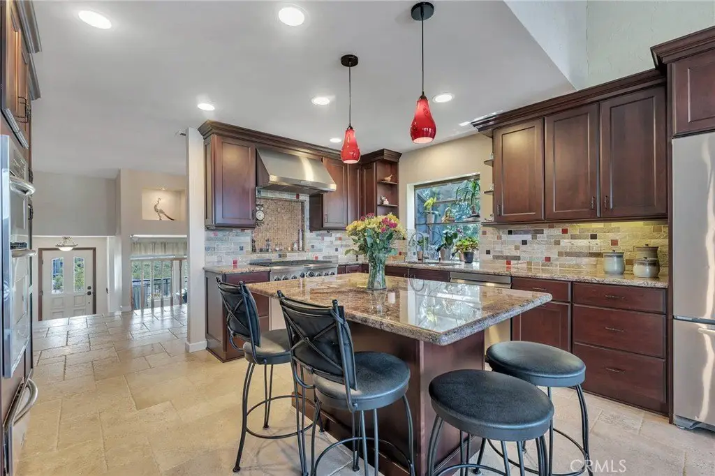 Cálida y acogedora casa personalizada en Santa Susana Knolls con magníficas vistas. Esta hermosa y única casa personalizada fue diseñada para aprovechar al máximo las impresionantes vistas del encantador vecindario de Santa Susana Knolls. Entre en una luminosa y luminosa sala de estar, adornada con una chimenea rústica y con vistas al comedor, la cocina gourmet y la sala familiar. Una zona de estar aislada, a la sombra de la majestuosa roca, ofrece un momento de paz y meditación para relajarse y desconectar. La cocina remodelada es el sueño de cualquier chef, con electrodomésticos de acero inoxidable que incluyen una estufa de gas de gran tamaño, refrigerador, compactador de basura, microondas, vinoteca y cajón calentador. Encimeras de granito, lámparas colgantes, un protector contra salpicaduras personalizado y una encantadora ventana al jardín sobre el fregadero realzan la belleza de este rincón de la casa. La amplia despensa con cajones extraíbles, los gabinetes de cierre automático con detalles de diseño personalizados y la isla central con asientos adicionales añaden beneficios prácticos que todos disfrutan. El estudio/sala familiar está a pocos pasos y ofrece un bar con fregadero y un espacio muy versátil para una oficina en casa, sala multimedia, sala de juegos... ¡tú decides! Las puertas corredizas de vidrio te dan la bienvenida a la espaciosa terraza trasera con impresionantes vistas en todas direcciones. Un lugar ideal para recibir invitados, la terraza ofrece espacio para que muchos se sienten, bailen o jueguen. En el interior, las dos espaciosas habitaciones secundarias tienen un encantador balcón con magníficas vistas a la montaña y al atardecer. El baño compartido ha sido remodelado con gabinetes a medida, encimeras de piedra, lavabos dobles y una bañera profunda. La suite principal se encuentra al final del pasillo, ofreciendo mayor privacidad, un amplio vestidor, un baño principal remodelado con una ducha amplia y serenas vistas a la montaña. Unas puertas corredizas de vidrio conducen a una zona de descanso privada. En la planta baja hay un espacio con muchas posibilidades, con entrada independiente, baño completo, espacio abierto y una habitación adicional. Ideal como suite para suegros, cuarto de servicio, oficina en casa, estudio de arte, biblioteca o sala de música. El lavadero y el conducto de lavandería también se encuentran en la planta baja, con espacio de almacenamiento adicional. Salga a un encantador jardincito y, a la vuelta de la esquina, encontrará el spa con burbujas, una bomba recientemente renovada, una unidad de calefacción mejorada y unas vistas impresionantes. Apartado de la calle, encontrará un amplio jardín delantero y estacionamiento para 6 autos o espacio para una autocaravana. Aunque Susana Knolls es una zona rural con abundante vida silvestre, está a solo minutos de la autopista 118, la estación de tren y los restaurantes y tiendas de Simi Valley.