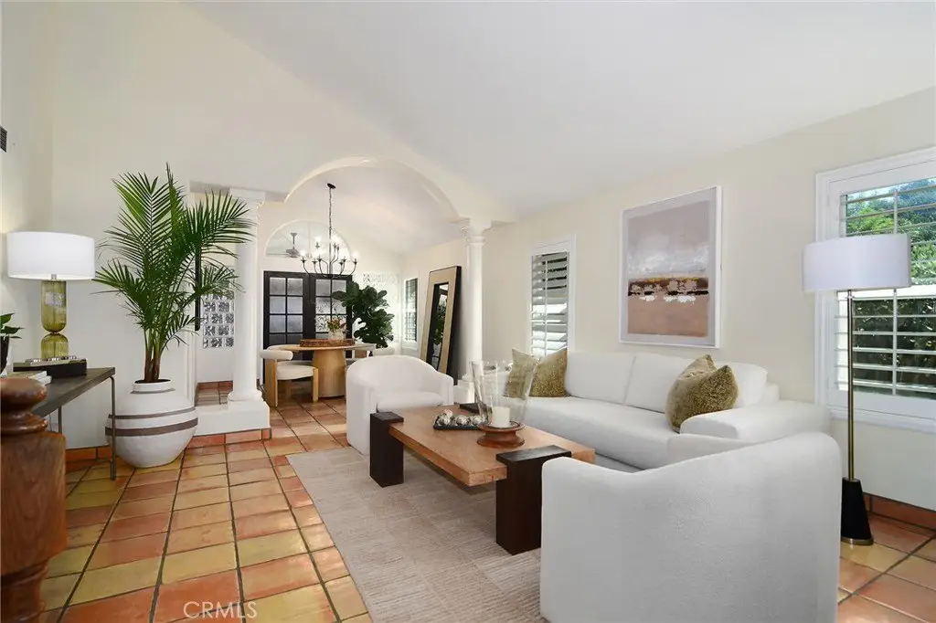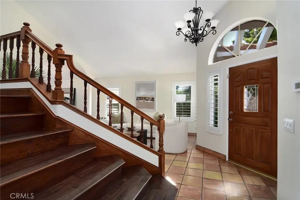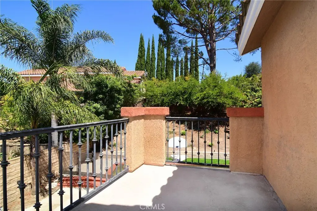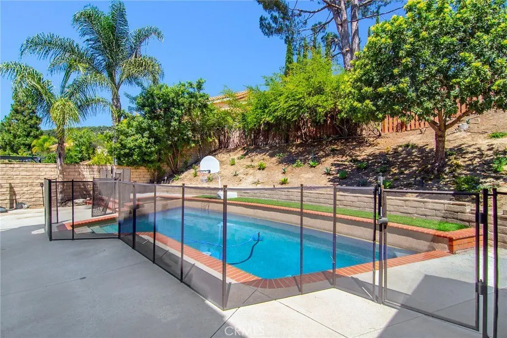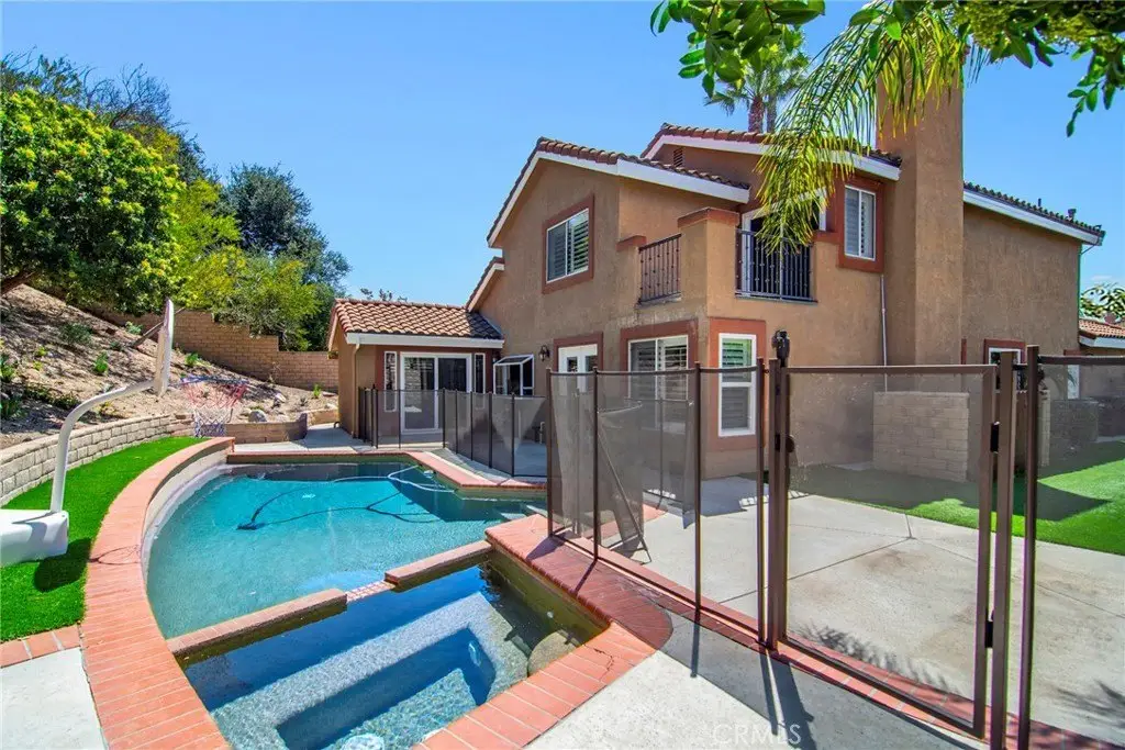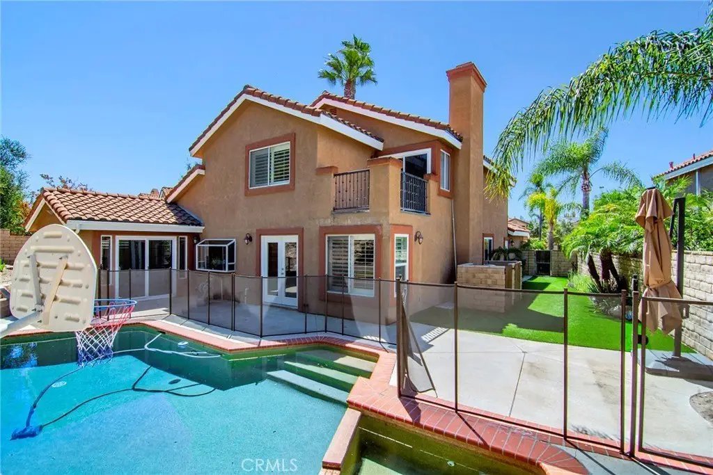 Nestled on a quiet cul-de-sac, this stunning Wood Ranch “Regalia” residence offers soaring ceilings, abundant natural light, and a spacious yet private backyard retreat. Relax by the serene Pebble Tec pool and spa while enjoying the diverse wildlife that call the hillside trees and shrubs home. Inside, you’ll find a rare main-floor multi-purpose bonus room with vaulted ceilings, a wall of built-in cabinetry, a bar sink, and two sets of double doors opening to both the formal dining room and the pool area—perfect as a home office, artist studio, gym, guest suite, or cabana bar. The upgraded kitchen features slab granite countertops, stainless steel appliances (including refrigerator and a back-saving double-drawer dishwasher), breakfast bar, and an oversized walk-in pantry. The downstairs bedroom—currently used as an office—offers soundproofed walls, double French doors, beautiful Acacia wood floors, and built-ins. A full shower bath is conveniently located nearby, along with a laundry room (washer and dryer included). Upstairs, rich Acacia wood floors flow through the hallway and primary suite, with newer carpet in the secondary bedrooms. The primary suite features a walk-in closet, water closet, double-sink vanity, and new decking off its expansive balcony. A second balcony is shared by one of the secondary bedrooms. Both upstairs baths feature newer wood-look tile, and a whole-house fan with timer adds comfort and efficiency. This home also includes solar, providing significant energy savings year-round, along with a large poolside cabana perfect for entertaining. Move-in ready with neutral paint, plantation shutters, and most windows replaced—this is a rare combination of style, comfort, and resort-style living in Wood Ranch.
