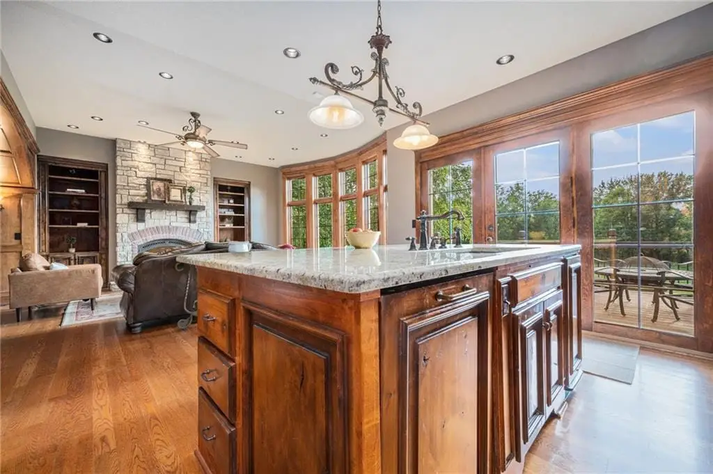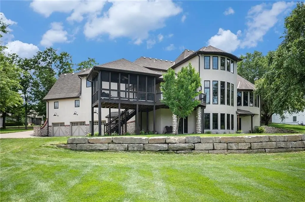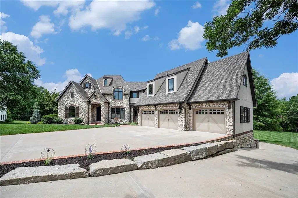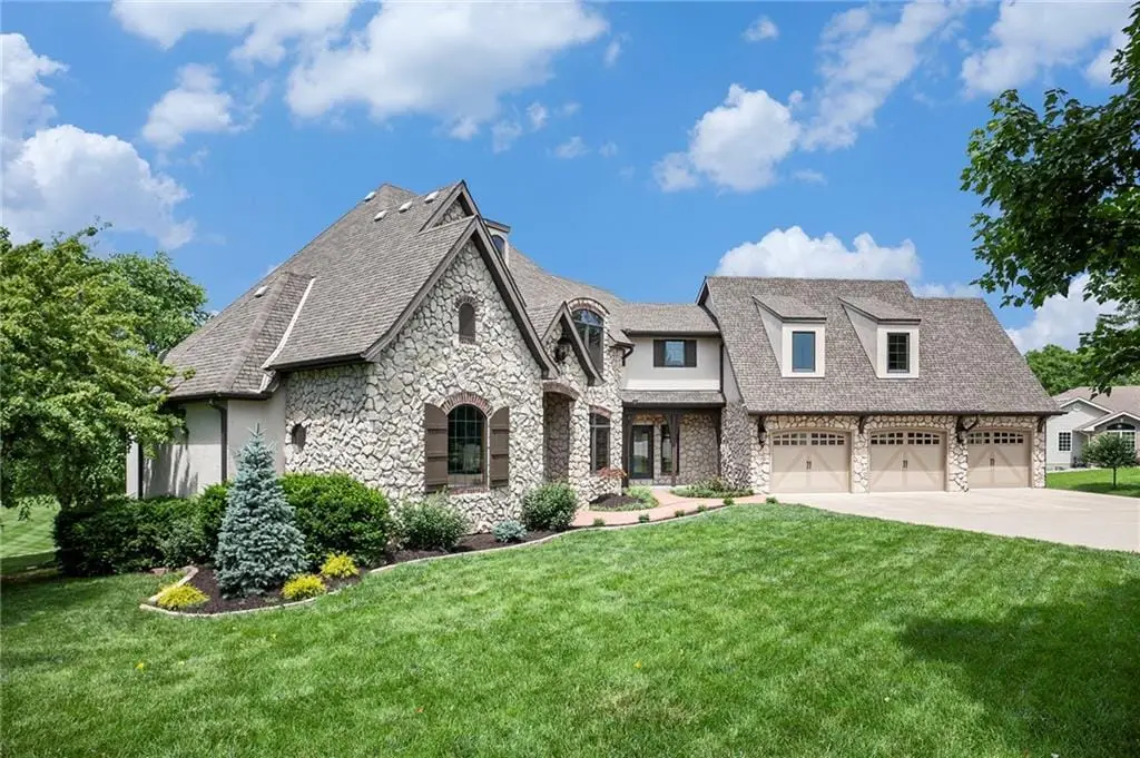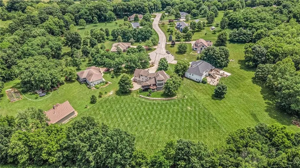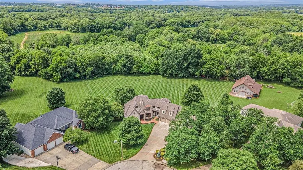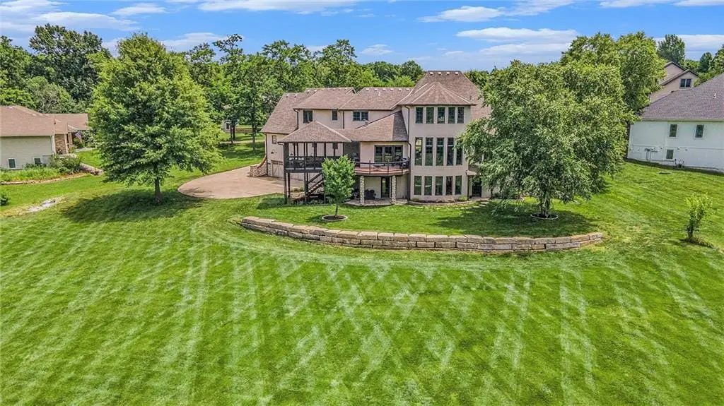 Tucked away on a quiet cul-de-sac in the desirable Strawberry Hill development, this impressive 1.5 story residence rests on a sprawling 1.76 acre lot. With quick access to The Litton Center, scenic walking trails, a play park & nearby Smithville Lake, the location offers both convenience & recreation. From the moment you arrive, the exterior showcases pride of ownership w/timeless curb appeal & meticulous care. Step inside to be greeted by a dramatic foyer featuring a curved staircase, soaring 2-story ceilings & rich, moody-traditional design details. Recently refinished hardwood floors, 2 geothermal HVAC systems (both in ground loop), computer-controlled Vantage Luxury Lighting, structured wiring & thoughtful upgrades throughout set this home apart. The great room makes a bold statement w/an arched wood entry, a striking stacked-stone fireplace flanked by custom built-ins & a wall of windows filling the space with natural light. The gourmet kitchen is designed for the chef at heart, offering knotty alder cabinetry, stone countertops, tile backsplash, built-in refrigerator, gas cooktop, oversized island & an exceptional walk-in pantry. Enjoy meals in the elegant formal dining room or the inviting 3-season room overlooking your private backyard. The main-level primary suite is a true retreat, boasting a coffered ceiling, spa-inspired ensuite w/dual custom vanities, large walk-in shower, jacuzzi tub & an expansive walk-in closet. Upstairs, discover 3 generously sized bedrooms, each with ample closet space & private or jack-and-jill bath access. The finished walkout lower level is designed as a full secondary living space - perfect for guests or multi-generational living. It includes a 2nd full kitchen, bedroom, bathroom, recreation/living areas, garage access & abundant storage. For entertaining, there’s even a theater/media room ready for movie nights or game day. Outside, the expansive backyard is ideal for gatherings, grilling, or tossing the football with friends.