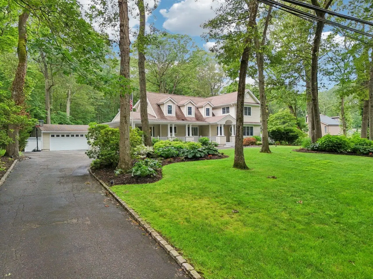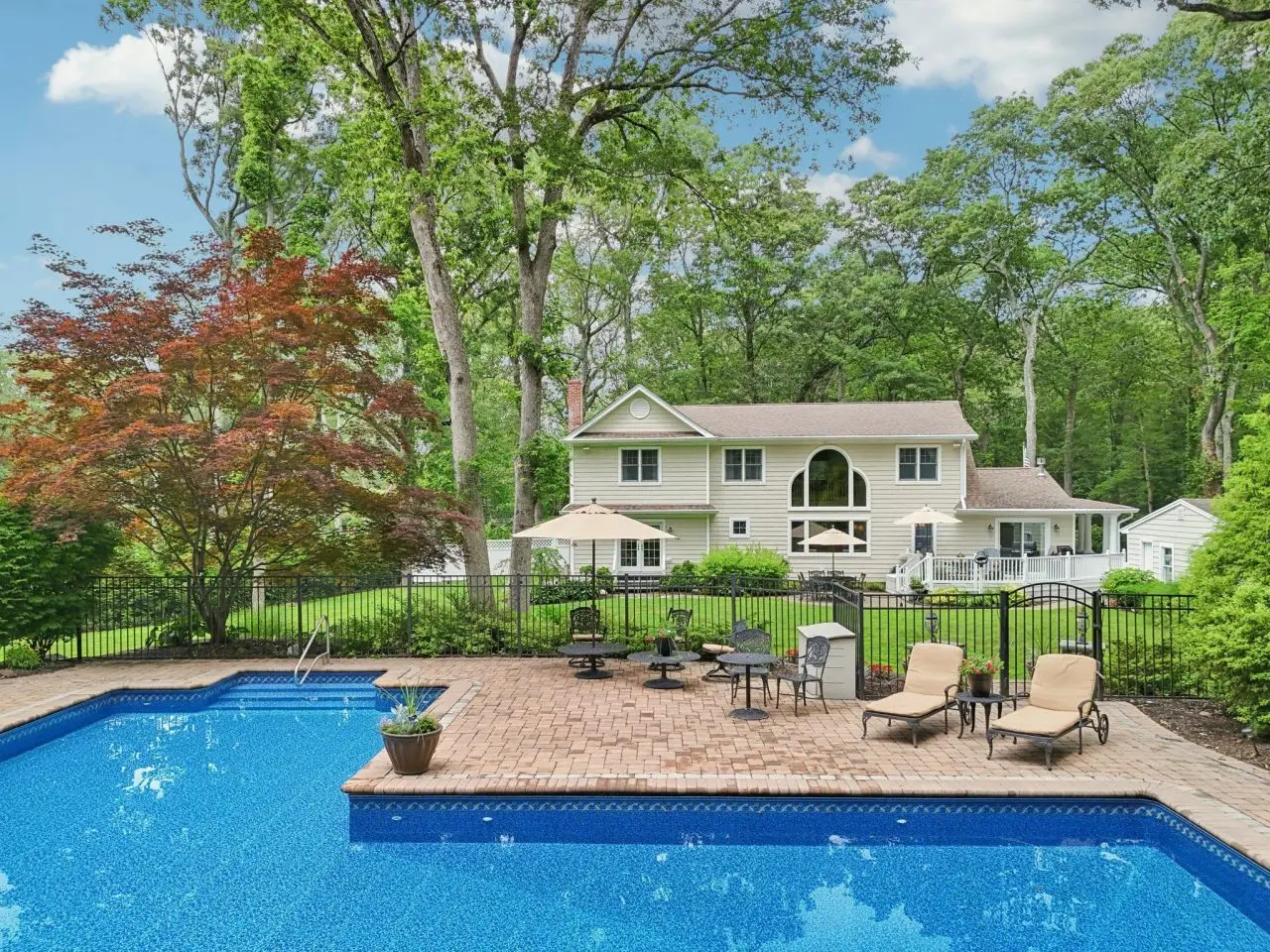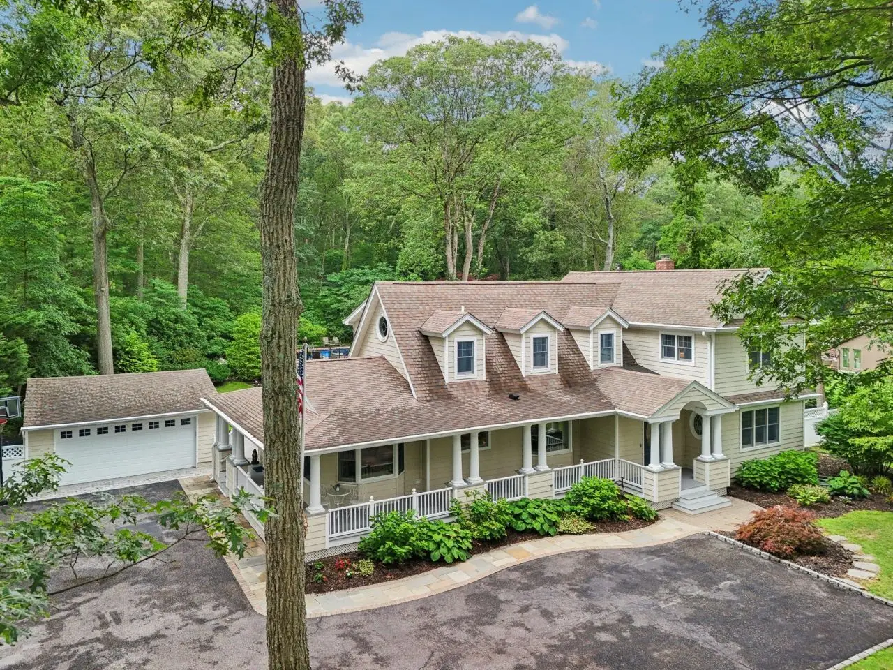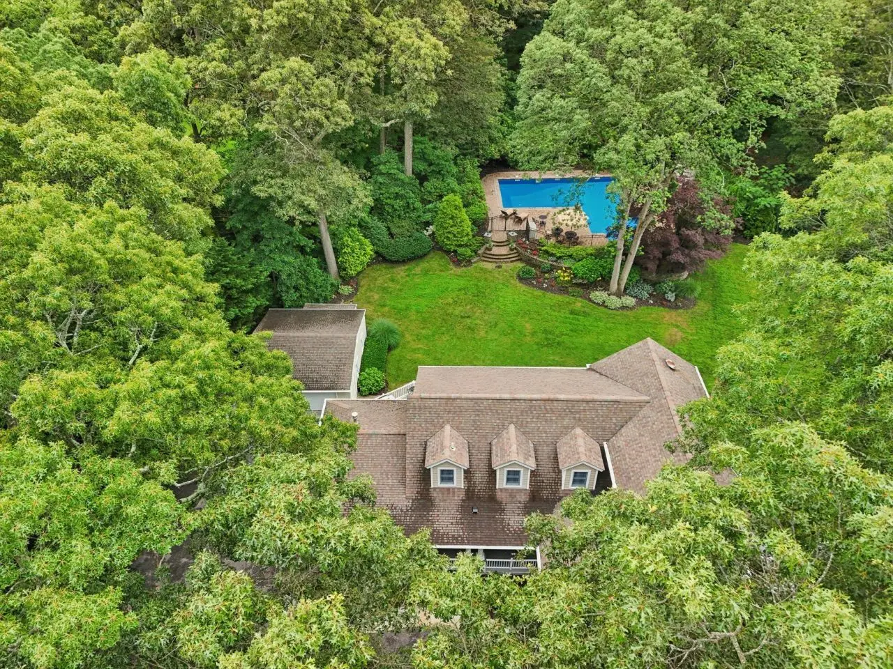 Welcome to this exquisitely expanded Farm Ranch, where luxury meets comfort in every detail. Nestled on 1.12 acres of serene, park-like grounds and set back from a quiet, winding road, this impressive residence offers both privacy and tranquility. Upon entering, you're greeted by a dramatic two-story living room featuring, a striking picture window, and breathtaking views of the expansive backyard-complete with a heated, in-ground saltwater pool. It's a space that invites you to relax, unwind, and take in the beauty of your surroundings. Designed with an open-concept layout ideal for both everyday living and grand entertaining, the home boasts a tastefully done kitchen with a gas range, an oversized L-shaped island with abundant counter space, and a seamless flow into the cozy family room with stacked-stone gas fireplace and dining area. The luxurious first-floor primary suite is a private retreat, featuring French doors that open to the backyard, a spa-inspired ensuite bathroom, and ample space for relaxation. Also on the main level is a sophisticated home office with a convenient laundry closet (versatile enough for a 5th bedroom), along with a stylish powder room. Rich hardwood floors continue throughout, leading upstairs to three additional spacious bedrooms, a full guest bath, and a versatile loft area-ideal for a second family room, home office, or quiet reading nook. Outside, enjoy warm summer evenings on the charming wrap-around porch, rear deck, or patio-surrounded by lush landscaping and the soothing sounds of nature. This premier property combines luxury living with unbeatable convenience-just minutes from major highways and only 3 miles to the LIRR-offering a perfect balance of seclusion and accessibility.Come experience refined living at its finest-where every day feels like a retreat.