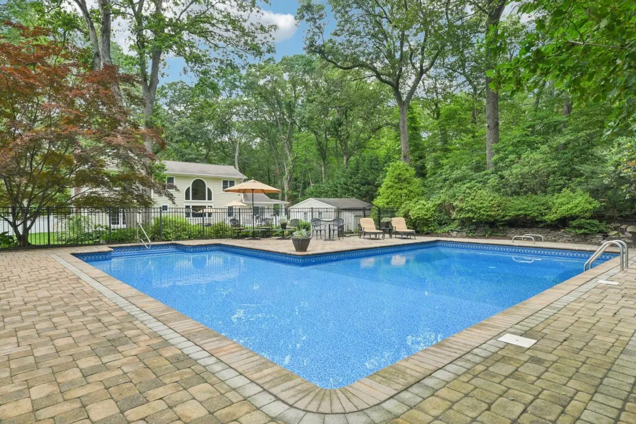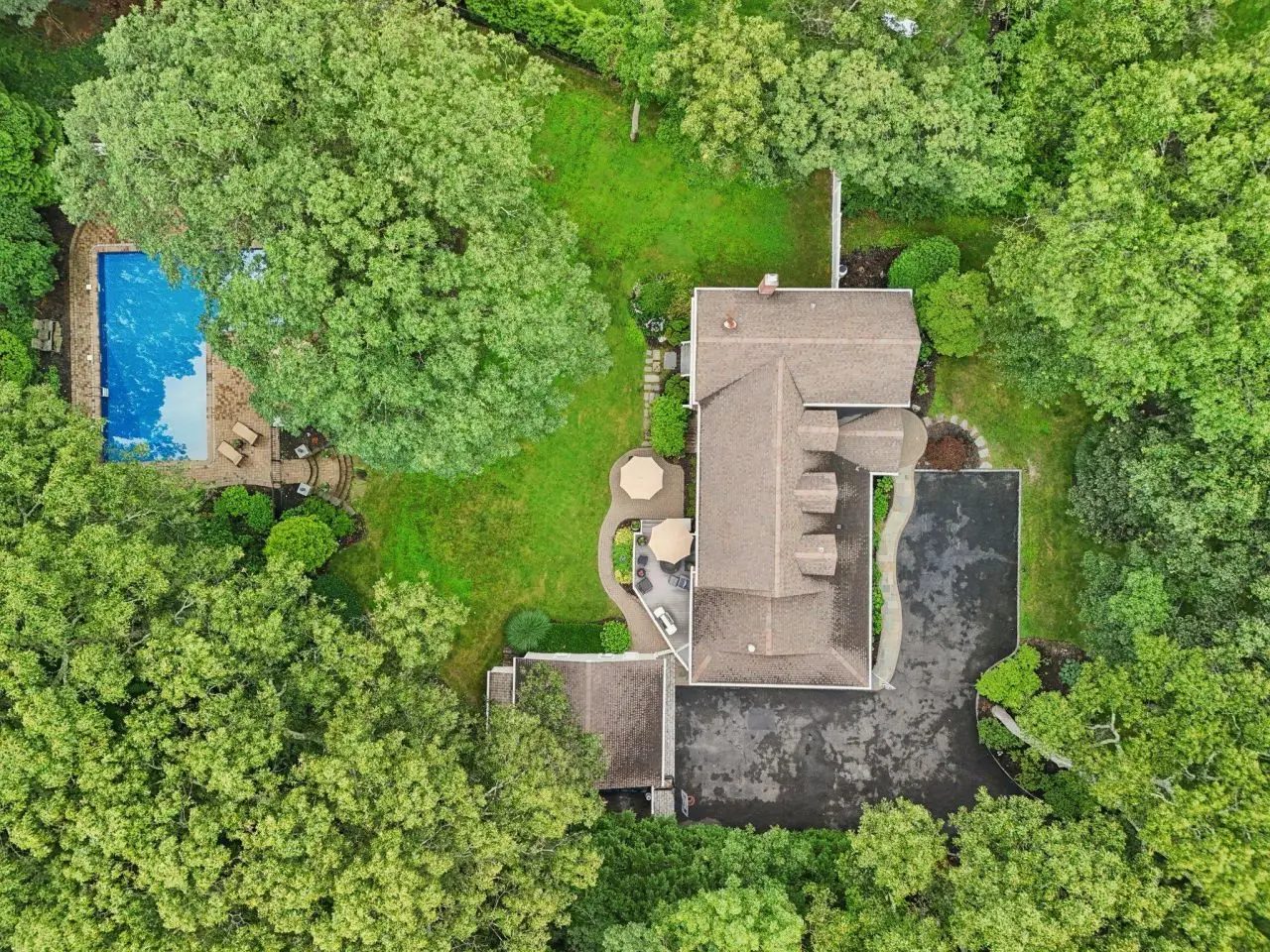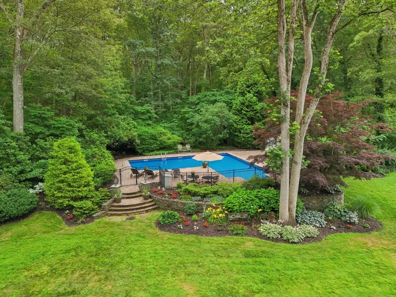 Welcome to this exquisitely expanded Farm Ranch, where luxury meets comfort in every detail. Nestled on 1.12 acres of serene, park-like grounds and set back from a quiet, winding road, this impressive residence offers both privacy and tranquility. Upon entering, you're greeted by a dramatic two-story living room featuring, a striking picture window, and breathtaking views of the expansive backyard-complete with a heated, in-ground saltwater pool. It's a space that invites you to relax, unwind, and take in the beauty of your surroundings. Designed with an open-concept layout ideal for both everyday living and grand entertaining, the home boasts a tastefully done kitchen with a gas range, an oversized L-shaped island with abundant counter space, and a seamless flow into the cozy family room with stacked-stone gas fireplace and dining area. The luxurious first-floor primary suite is a private retreat, featuring French doors that open to the backyard, a spa-inspired ensuite bathroom, and ample space for relaxation. Also on the main level is a sophisticated home office with a convenient laundry closet (versatile enough for a 5th bedroom), along with a stylish powder room. Rich hardwood floors continue throughout, leading upstairs to three additional spacious bedrooms, a full guest bath, and a versatile loft area-ideal for a second family room, home office, or quiet reading nook. Outside, enjoy warm summer evenings on the charming wrap-around porch, rear deck, or patio-surrounded by lush landscaping and the soothing sounds of nature. This premier property combines luxury living with unbeatable convenience-just minutes from major highways and only 3 miles to the LIRR-offering a perfect balance of seclusion and accessibility.Come experience refined living at its finest-where every day feels like a retreat.