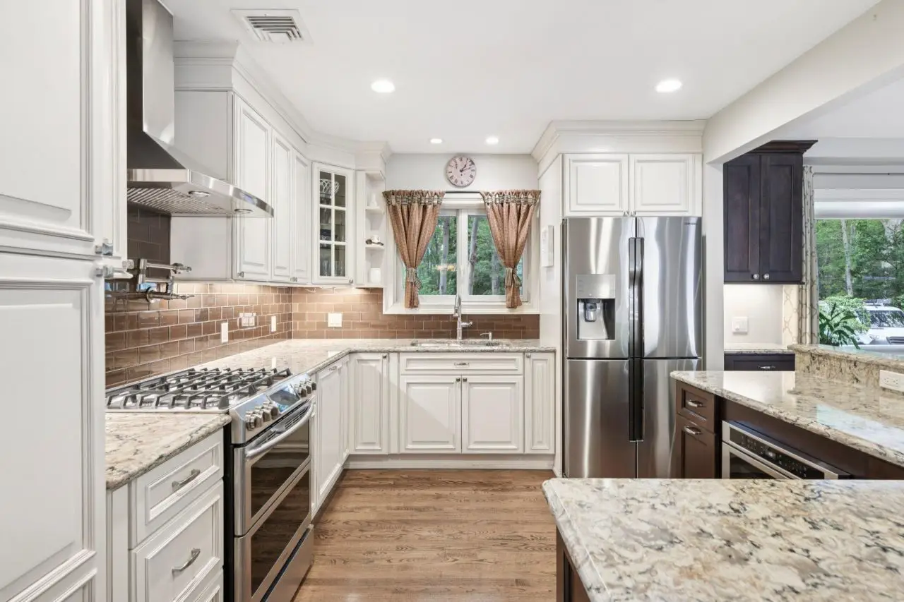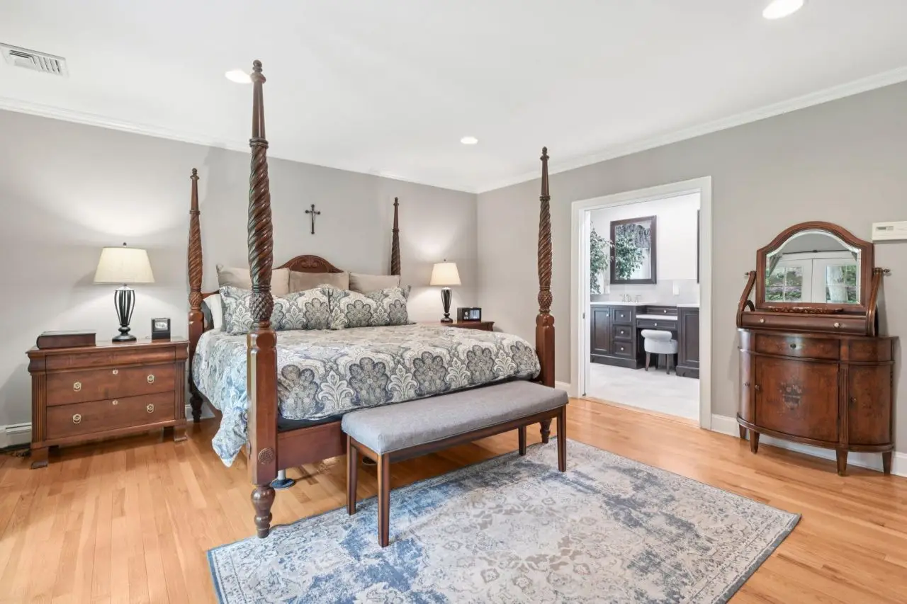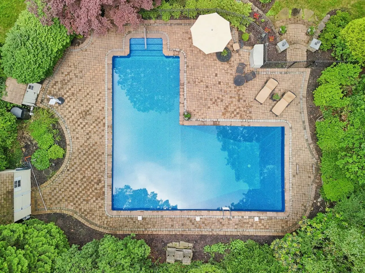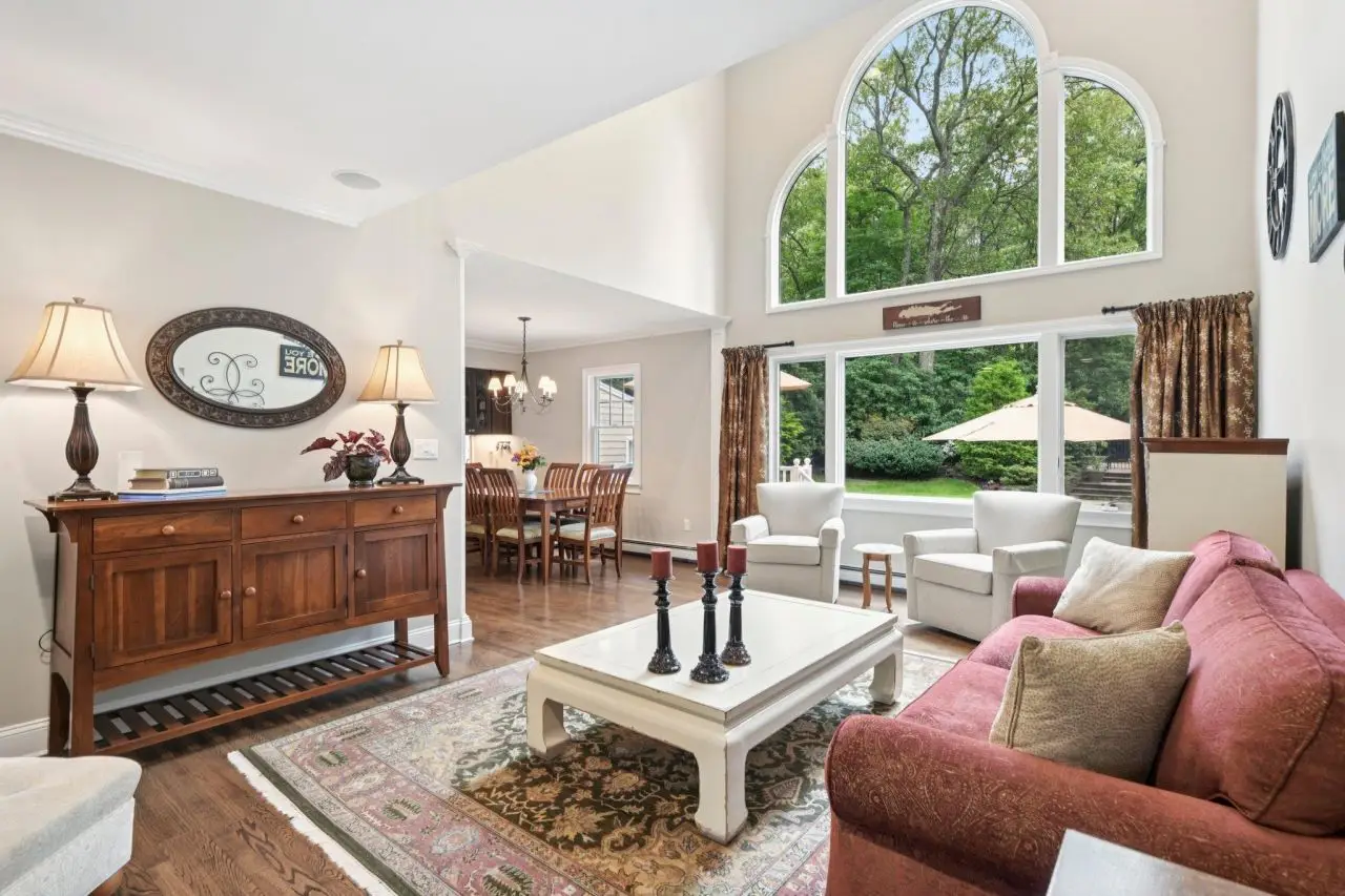 Welcome to this exquisitely expanded Farm Ranch, where luxury meets comfort in every detail. Nestled on 1.12 acres of serene, park-like grounds and set back from a quiet, winding road, this impressive residence offers both privacy and tranquility. Upon entering, you're greeted by a dramatic two-story living room featuring, a striking picture window, and breathtaking views of the expansive backyard-complete with a heated, in-ground saltwater pool. It's a space that invites you to relax, unwind, and take in the beauty of your surroundings. Designed with an open-concept layout ideal for both everyday living and grand entertaining, the home boasts a tastefully done kitchen with a gas range, an oversized L-shaped island with abundant counter space, and a seamless flow into the cozy family room with stacked-stone gas fireplace and dining area. The luxurious first-floor primary suite is a private retreat, featuring French doors that open to the backyard, a spa-inspired ensuite bathroom, and ample space for relaxation. Also on the main level is a sophisticated home office with a convenient laundry closet (versatile enough for a 5th bedroom), along with a stylish powder room. Rich hardwood floors continue throughout, leading upstairs to three additional spacious bedrooms, a full guest bath, and a versatile loft area-ideal for a second family room, home office, or quiet reading nook. Outside, enjoy warm summer evenings on the charming wrap-around porch, rear deck, or patio-surrounded by lush landscaping and the soothing sounds of nature. This premier property combines luxury living with unbeatable convenience-just minutes from major highways and only 3 miles to the LIRR-offering a perfect balance of seclusion and accessibility.Come experience refined living at its finest-where every day feels like a retreat.
