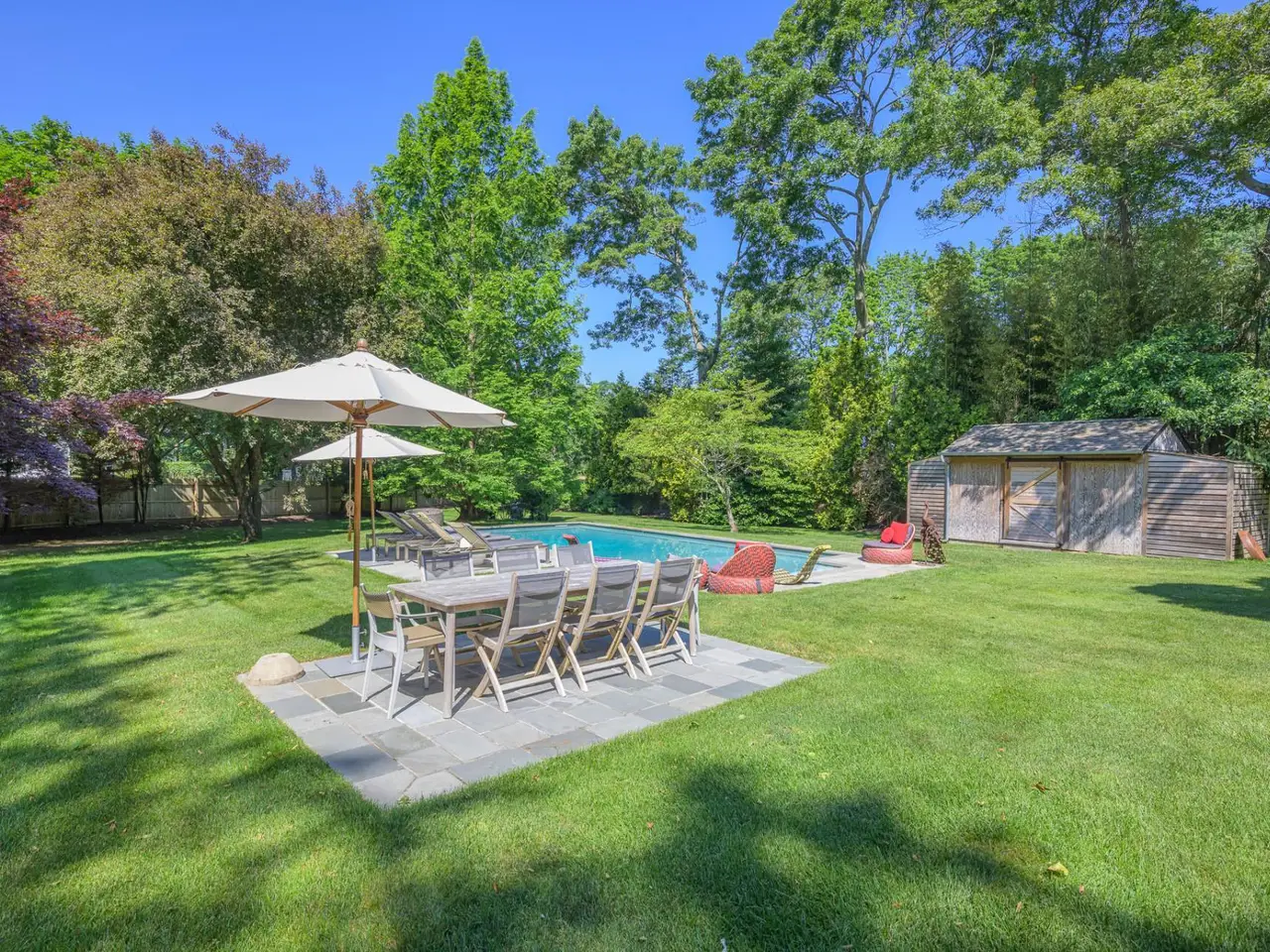 A rare opportunity with great charm in Southampton, sits this updated and well-appointed contemporary with a separate accessory apartment. Conceptualized by world-renowned designer, Elsa Soyars, the single-story four bedrooms and two full baths main house offers charm, style and timeless elegance on 1.03 acres. The bright foyer with vaulted ceilings, opens to a lovely living room and dining area with a wood-burning fireplace. The open floor plan includes a stylishly-renovated kitchen with French doors leading to the outdoor space, which is secluded and tranquil, featuring a deck overlooking the heated swimming pool, multiple entertaining areas and a broad lawn with beautifully mature landscaping. The cottage offers an additional approximately 600 square feet of living space, which has two floors and separate from the main house, has a renovated kitchen and full bath, central air conditioning with a second floor studio, as well as a spacious private outdoor patio and parking area. This gem presents a great potential investment or an opportunity to create a serene Hamptons retreat, conveniently located just outside Southampton Village and world-class shopping, restaurants, bay and ocean beaches. Listing ID: 914528