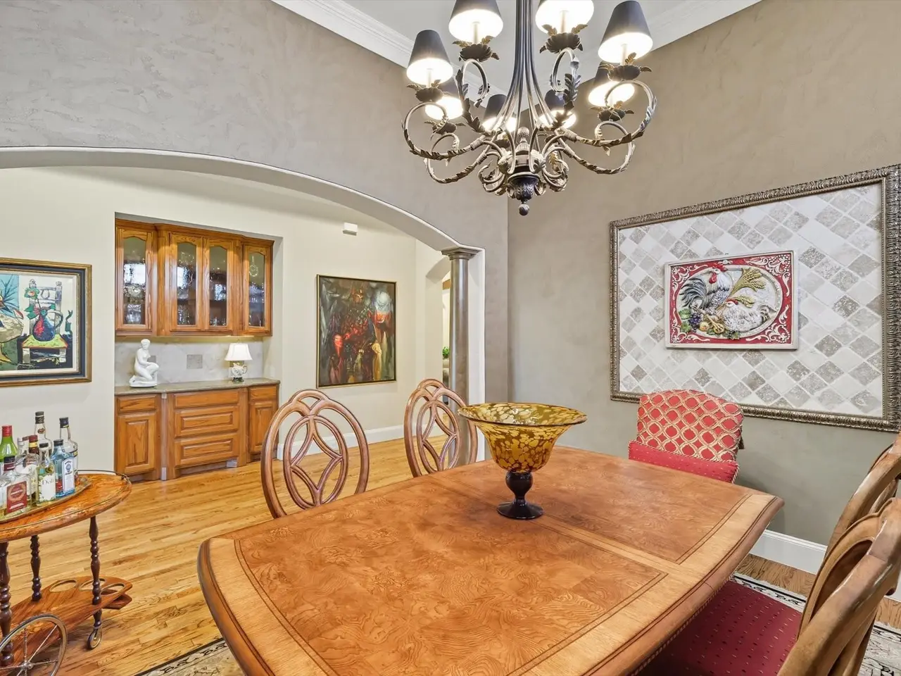 Immaculately maintained one-story home with fabulous curb appeal in the highly desirable Crescent Royale addition in Timarron. Hardwood floors throughout living areas, extra tall ceilings, and large living areas. Three bedrooms, three baths, two living areas and two dining areas. One bedroom currently being used as office. Lots of storage throughout. Spacious primary suite with huge bathroom, separate vanities, and large dual closets. Enjoy relaxing evenings in the stunning outdoor space with living area that includes summer kitchen with grill and burners, pergola, and soothing sounds of the rock waterfall and pond. Backyard features lush landscaping and easy maintenance and backs to green space for privacy. HOA maintains front yard. Roof replaced 8-25; water heaters replaced 2024, new fireplace 8-25.
