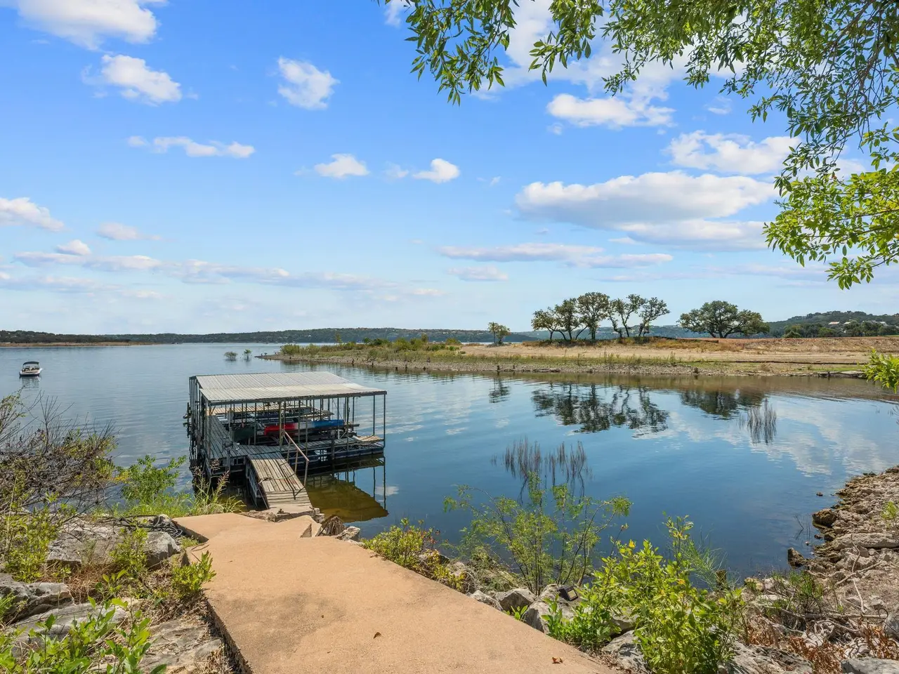 This exquisitely designed home on Lake Travis offers sweeping water and Hill Country views from its elevated perch on ~1.53 acres. The double-height living room amplifies the views through a rounded wall of windows that illuminate the open-concept floorplan with natural light. A stone fireplace anchors the space, while warm, hardwood floors and exposed timber ceilings create a refined yet relaxed ambiance perfect for both everyday living and entertaining. The kitchen boasts high-end stainless steel appliances and a generous center island where you can cook with a lake view. This level also features an ensuite bedroom, laundry, and a powder room for guests. On the upper level, there are three bedrooms, two with terrace access, as well as an additional sitting area which offers the highest elevation to take in the stunning vistas. Practical considerations include the attached 2-car garage and a smartly designed lift that reaches the second floor. Outside, enjoy an expansive covered porch, a true extension of the living space, that's ideal for morning coffee or evening stargazing thanks to the peaceful surroundings. The backyard oasis features a private boat dock for convenient water adventures. Designed with both comfort and style in mind, this home captures timeless elegance by honoring its natural setting in the Spicewood countryside. Tax and assessed values are estimates for illustration purposes only. All figures should be independently verified.