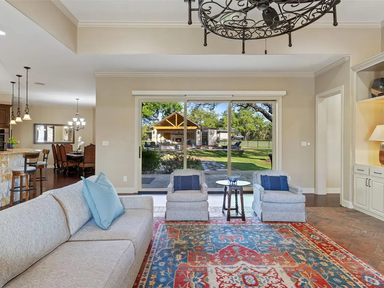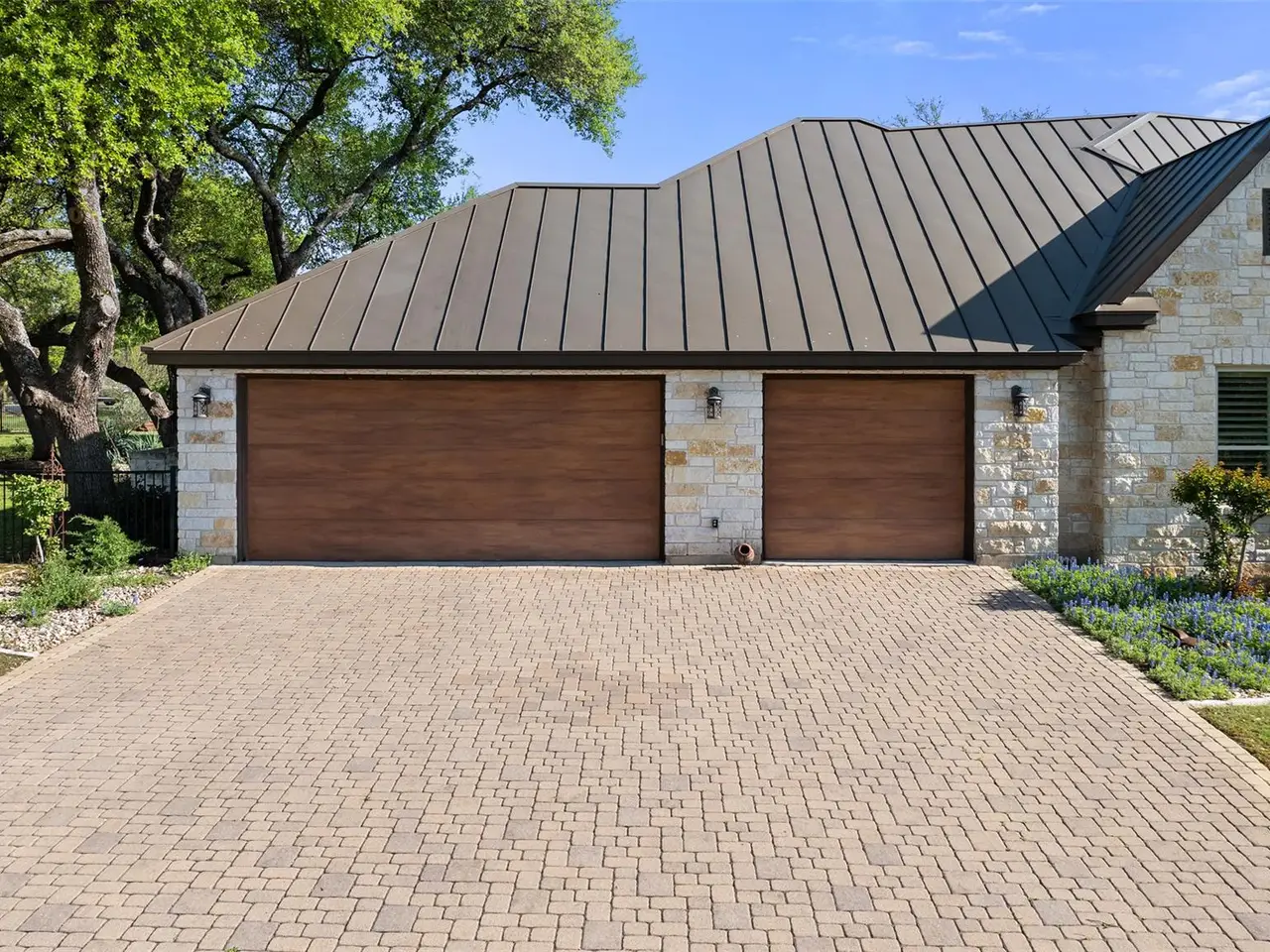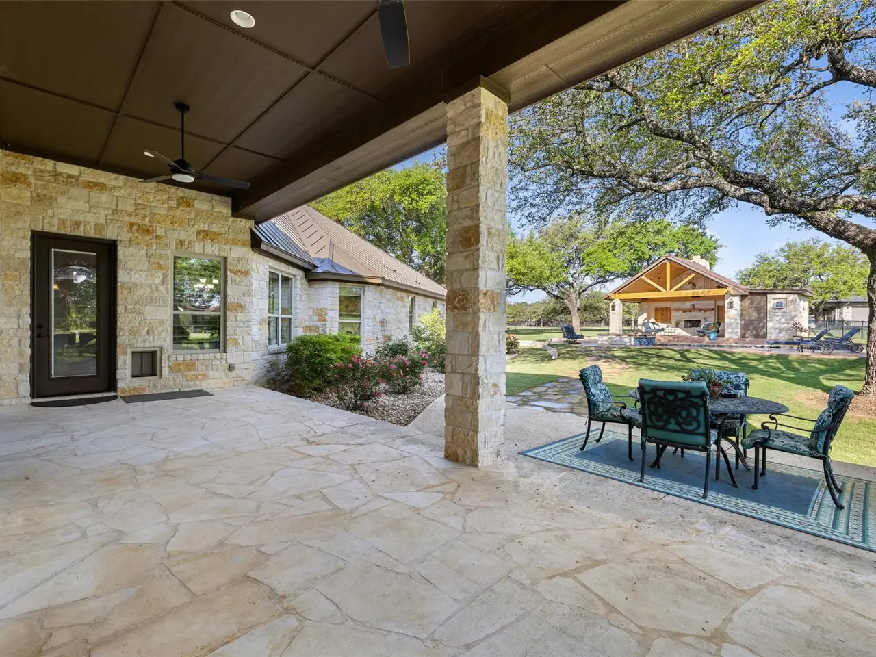 Located in the prestigious gated and guarded Barton Creek Lakeside community, this single-story custom home offers a seamless blend of Hill Country charm and modern comfort. Situated on a large 0.68-acre corner lot, the property is surrounded by mature oak trees and features a wide paver driveway and spacious covered patios perfect for outdoor living. The open-concept living and kitchen area is highlighted by a large center island, granite countertops, and wood shutters throughout. With an in-law floor plan and wide entryways, the home is designed for accessibility and ease of living. One of the bedrooms, located privately at the rear of the home, is ideal as a guest suite, office, or hobby space and includes its own bathroom & outdoor patio. Additional features include a 3-car attached garage, plantation shutters, a laundry room with utility sink, and beautiful wood and brick flooring. The expansive covered back patio and fenced yard provide a tranquil setting to enjoy the peaceful Hill Country surroundings. Barton Creek Lakeside offers access to a private country club with an 18-hole Arnold Palmer-designed golf course, fitness center, tennis courts, Olympic-sized pool, and Lake Travis access. Just a short drive to Spicewood and the surrounding Hill Country, this home combines quality construction, generous space, and resort-style amenities in a quiet, upscale community.