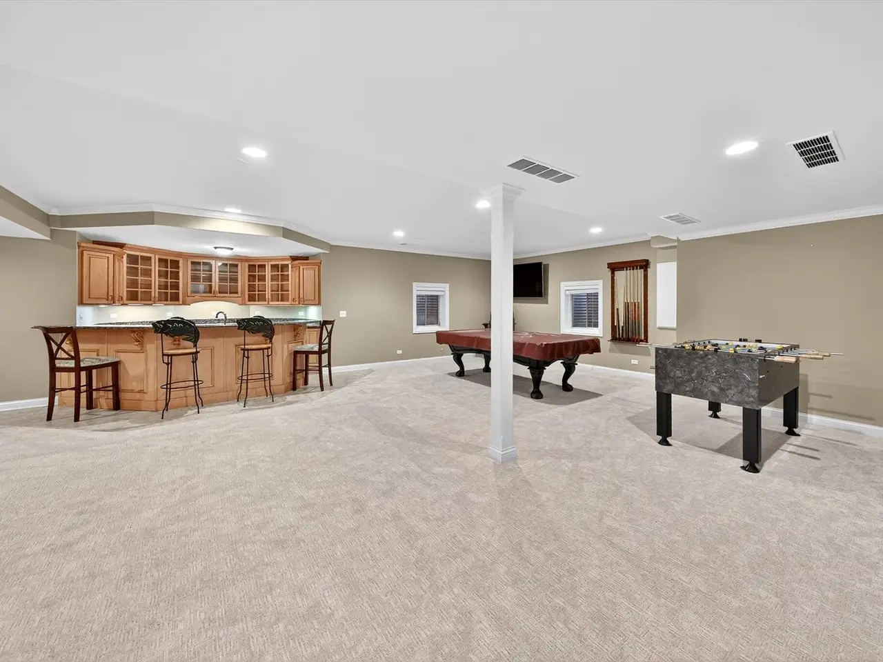 Welcome to your next chapter in this stunning five-bedroom, four-and-a-half-bathroom home that perfectly balances sophistication with everyday comfort. Located in the sought-after Fox Mill Subdivision, this custom model residence sits on a premium lot where mature landscaping meets thoughtful design. Every detail, from the professional-grade kitchen to the opulent bathrooms, reflects meticulous craftsmanship and upscale finishes. The interior spaces exude gracefulness and sophistication, offering a harmonious blend of comfort and style. Every detail has been meticulously designed to create an atmosphere of grandeur and extravagance. Enter through the formal entry and discover flowing living spaces that invite both quiet moments and lively gatherings. The completely remodeled kitchen takes center stage with refined finishes, a modern layout, and gleaming high end stainless-steel appliances that enhance the cooking experience. Adjacent casual dining and entertaining zones create the perfect backdrop for everything from morning coffee to dinner parties. Fresh paint throughout provides a crisp, clean canvas ready for your personal touch, while new carpet and luxury vinyl plank flooring in the bedrooms offer the perfect blend of comfort and durability. The luxurious primary suite serves as your personal retreat, featuring an elegant wet bar perfect for evening nightcaps and morning refreshments. Step into the spa-like primary bathroom where a full body spray shower system delivers a resort-quality experience, while the indulgent whirlpool tub transforms daily routines into relaxation rituals. Additional bedrooms feature thoughtful appointments that create restful retreats. Throughout the home, a whole house speaker system with surround sound creates the perfect ambiance for any occasion. The finished basement takes this home to the next level with its own kitchenette, home theater space with surround sound system, home gym with equipment, and ample storage. The entertainment possibilities are endless in the state-of-the-art finished basement! Recent updates demonstrate exceptional care and provide peace of mind. The new roof installed in 2020 protects your investment, while dual air conditioning units from the same year work in perfect harmony with two new furnaces also installed in 2020 to create a complete, modern heating and cooling system that ensures year-round comfort throughout every corner of the home. Updated water heaters from 2019 mean reliable hot showers for everyone, and fresh exterior paint from 2022 boosts curb appeal effortlessly. The cutting-edge smart sprinkler system brings technology to your fingertips, allowing you to control and monitor your lawn care from anywhere using your smartphone app. Fox Mill's community amenities include a clubhouse, pool, mature landscaping, scenic open spaces, and convenient walking trails. Located near downtown St. Charles and Geneva, you'll enjoy small-town charm with easy access to shopping, dining, and recreation. This turnkey home represents the ideal intersection of luxury and livability, where quality upgrades meet comfortable living in one of the area's most desirable neighborhoods.