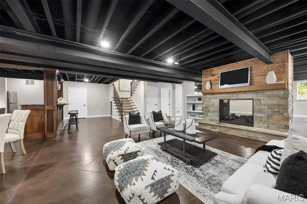 • Floor-to-ceiling stone fireplace