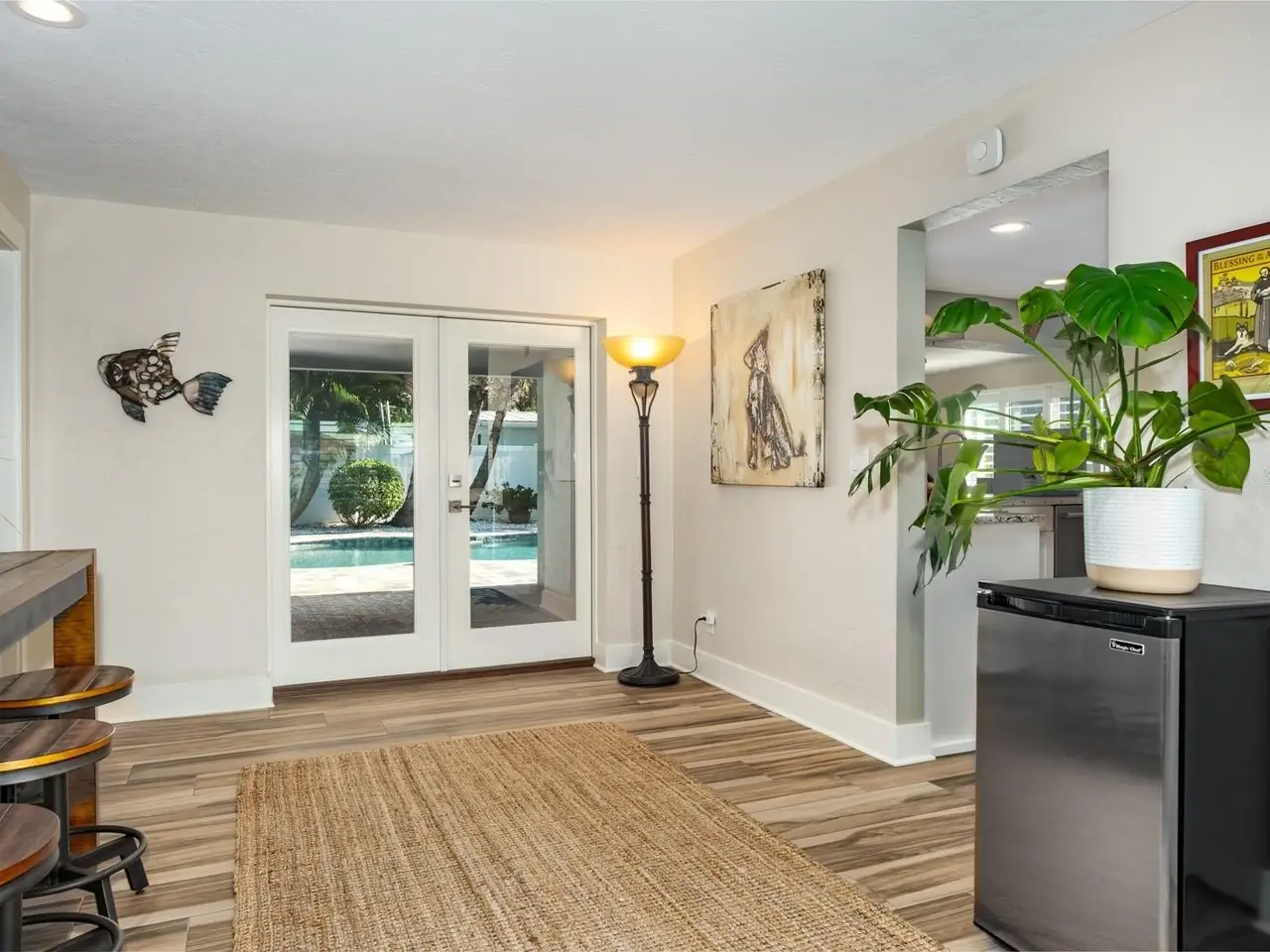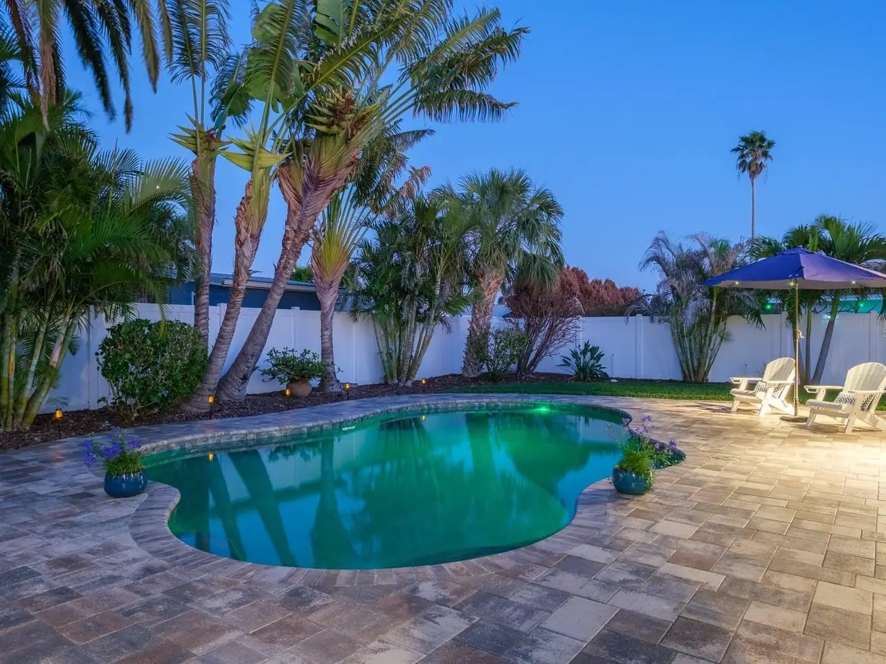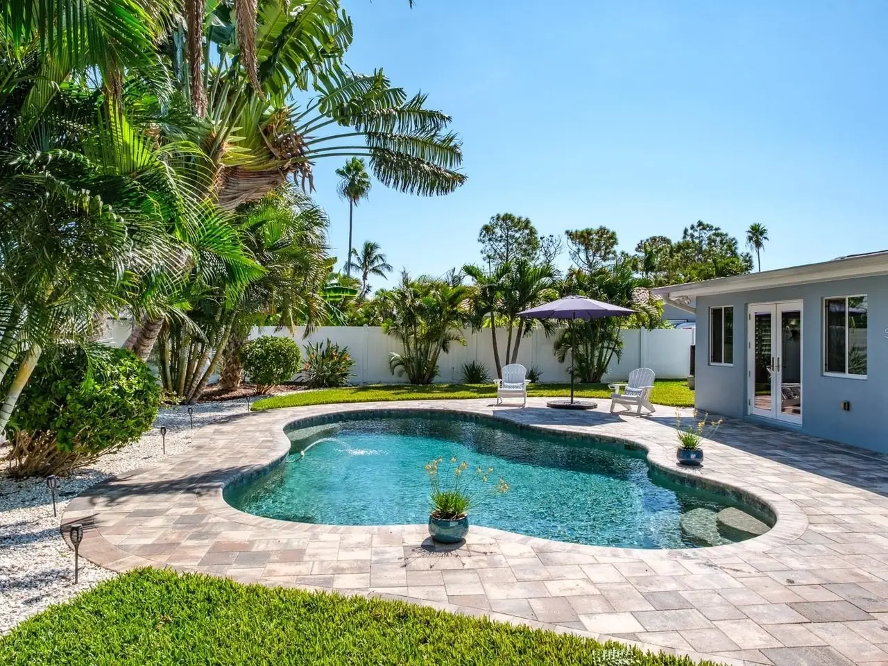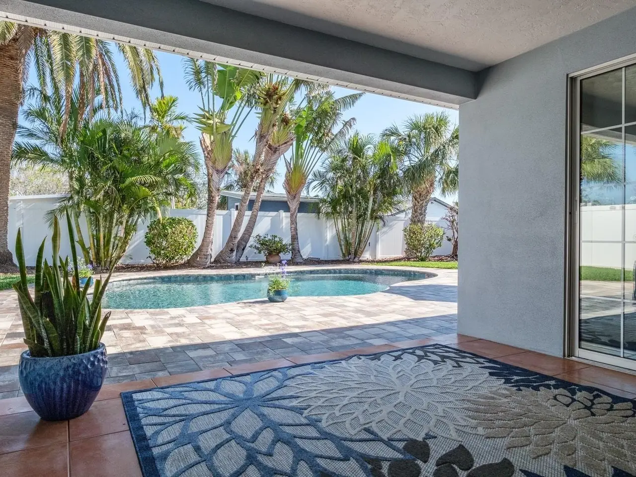 Welcome to the secluded Island of Vina Del Mar! This 2BR/2BA coastal-inspired home in the coveted Vina Del Mar neighborhood offers light-filled, open-concept living with views of the landscaped backyard and saltwater pool. The updated kitchen features custom quartz countertops, all-wood cabinetry & pantry with soft-close drawers, and a striking 100-year-old cypress beam with matching accent trim. The split floor plan includes a spacious primary suite with an en suite bath, a walk-in closet with custom shelving, and a versatile office/den/nursery space with pool access. The guest suite offers a built-in closet and adjacent bath, with a custom pocket door for added privacy. Two distinct living areas provide flexibility—one for larger gatherings, the other is open to the kitchen with direct pool access. The covered lanai offers shade while overlooking the private backyard, with an adjacent lounge area ideal for cooling off indoors. Meticulously upgraded and kept, the home features a new roof (2025), pool pump (2024), water purification & filtration system (2022), water heater (2020), Air Knight purification system (2017), custom Pebble-finish saltwater pool (2017), wood plank-style porcelain flooring, plantation shutters, Nest smart thermostat & smoke/CO detectors, updated electrical panel, newer windows and doors, fresh paint, and more. The two-car garage provides additional storage, while underground power lines preserve unobstructed views. Nearby Vina Del Mar Park offers a playground, dog park, pickleball, tennis, and basketball courts. Cruise down to the beach, restaurants, shops and entertainment in famous Pass-A-Grille or even a short drive to the vibrant Downtown St Pete for nightlife and the St Pete Pier. Don’t miss your chance to live the Salt Life!