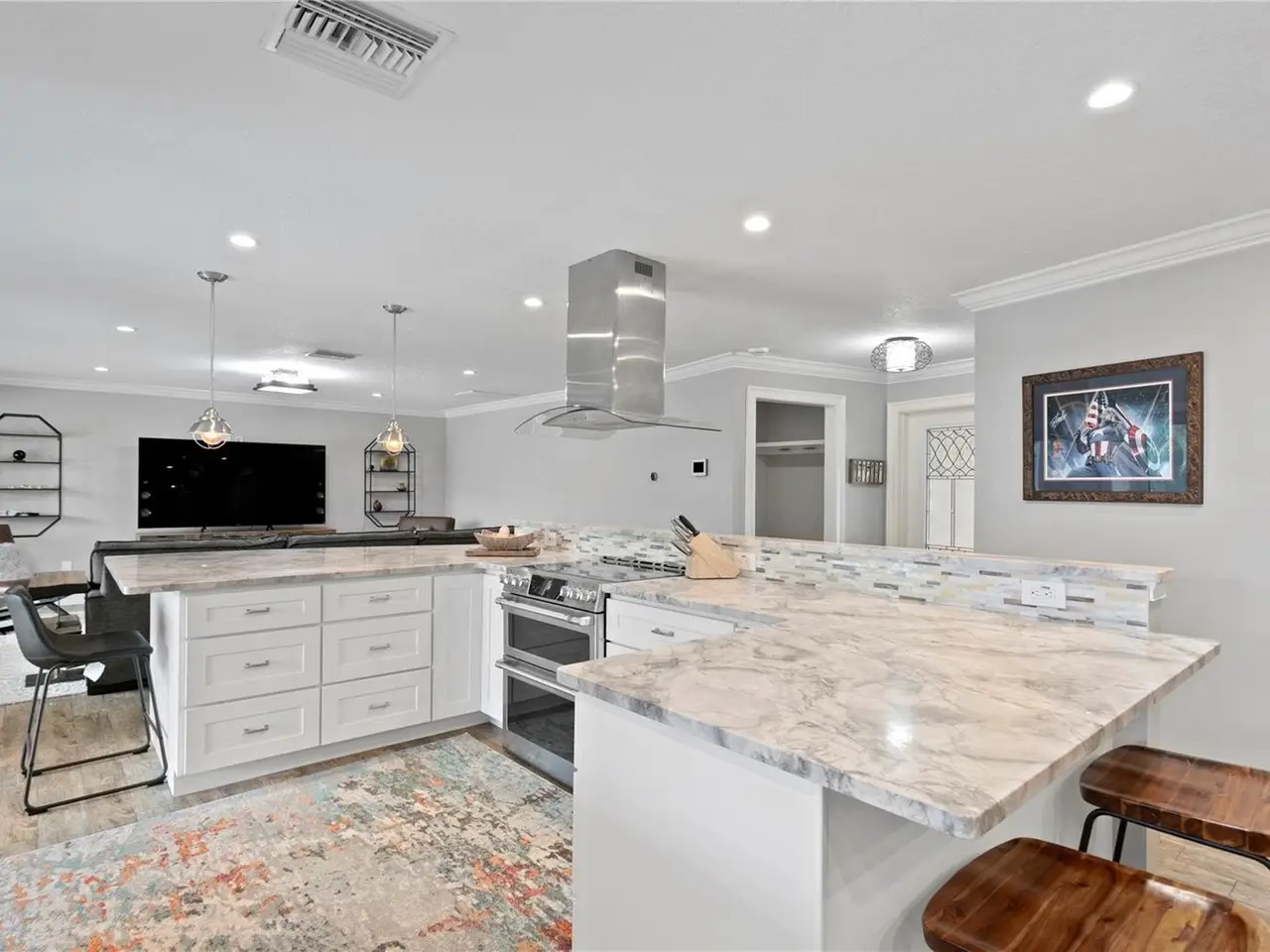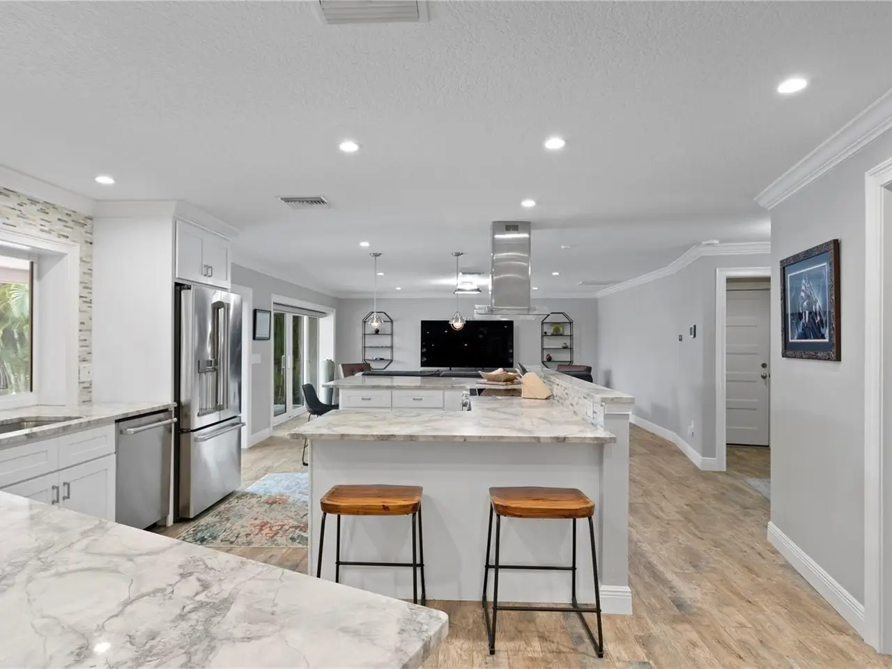 Don’t miss your opportunity to own this stunning home in the highly sought-after waterfront community of Venetian Isles! This beautiful 4-bedroom, 3-bath residence offers the perfect blend of luxury, comfort, and modern coastal living. Step inside to an expansive open-concept layout where the family room, kitchen, and dining area flow seamlessly into a screened lanai and beautifully landscaped backyard—perfect for effortless indoor-outdoor entertaining. The home welcomes you with a spacious foyer or a convenient mudroom entrance from the two-car garage. Throughout the living spaces, wood-look ceramic tile creates a warm, elegant ambiance. At the heart of the home, the chef’s dream kitchen features a large U-shaped eat-in island with marble countertops and backsplash, high-end Café series stainless steel appliances, and stylish custom cabinetry. The interior laundry room is as functional as it is beautiful, complete with Whirlpool Cabrio washer and dryer, built-in cabinetry, utility sink, and marble tile accents. Thoughtfully designed for privacy, the home offers a split bedroom layout. The first guest bedroom enjoys a beautifully appointed full bath, while two additional bedrooms in a separate wing share a spa-like bathroom with Danze fixtures and designer finishes. The private master suite is a true retreat, showcasing a luxurious marble bathroom and a generous walk-in closet. Enjoy true Florida living with hurricane-rated sliding glass doors that fully pocket back, connecting your main living spaces to the screened lanai and creating a seamless indoor-outdoor experience. Whether you're relaxing by the heated saltwater pool and spa, or enjoying tranquil canal views from the cozy firepit corner, this backyard oasis has it all. Boaters will appreciate the composite dock with electric, water, a 10,000 lb. boat lift, and updated seawall (2017). The lush landscaping provides ample privacy and is enhanced by elegant outdoor lighting for evening ambiance. Best of all, this home has experienced no water damage from any hurricanes—a testament to its strong construction and elevated location. Homes like this in Venetian Isles don’t come around often—schedule your private showing today!