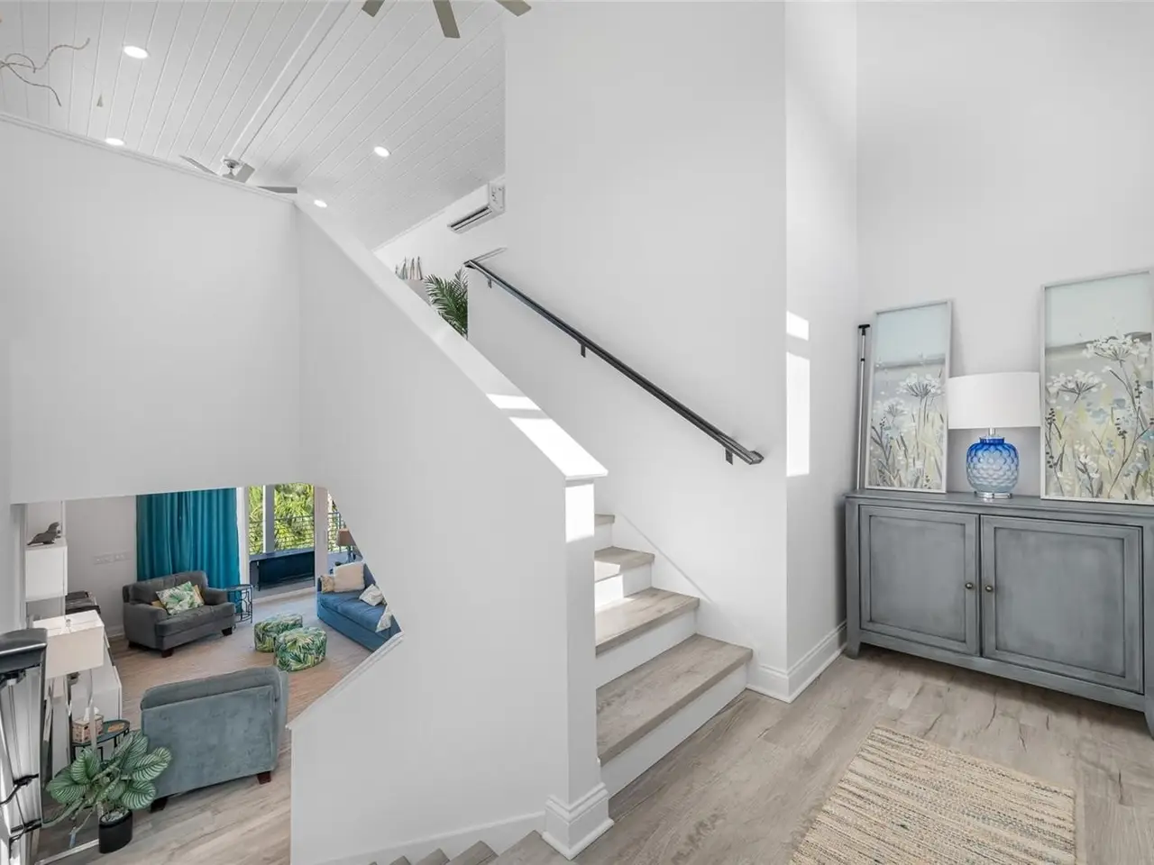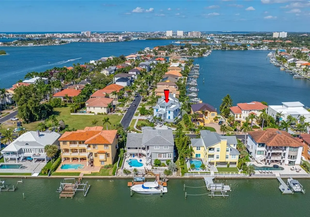 Welcome to this exceptional elevated Key West style 4-bedroom, plus rooftop bonus room, 4-bathroom, 4 car garage custom-built residence with breathtaking views of Boca Ciega Bay, in the prestigious gated Pasadena Yacht & Country Club. The home was completed December 30th 2021 to the highest coastal construction standards and thoughtfully designed to capture the panoramic and coastal views, while offering luxurious living across four levels, which are all serviced by a residential elevator. The grand staircase leads to the main entry with double front doors, setting the tone for the elegance and craftsmanship found throughout. On the first living level, you'll find three spacious bedrooms, including one with its own ensuite, a shared bathroom, a family room or study, and a laundry room. The 2nd living level features a large master suite with ensuite, an open-concept great room with surround sound, dining area, chef’s kitchen with pantry, and a guest bath. Crowning the home is a versatile Cupola on the 3rd level, perfect as an office, guest room, or entertainment area to soak in coastal views, spectacular sunsets, and holiday firework displays. This top-floor retreat is cooled by a dedicated mini-split AC unit. All floors have large balconies. The epoxy-coated garage level accommodates 4 cars plus a golf cart, includes a workshop area, hanging storage shelves, and is pre-wired for EV charging (3 vehicles). This home is packed with high-end features, including but not limited to: York high efficiency, low decibel cooling and heating pump, Lorex security cameras system, all house generator 22kw Generac (propane), 4 level residential elevator, all custom build wood cabinetry with Quartz countertops, automatic rainbird irrigation system via inground well, smart appliances, 250 gl inground propane tank and so much more. The home sustained NO flood damage during the 2024 hurricanes, underscoring its superior construction and resilience. Located within the serene, park-like Pasadena Yacht & Country Club, residents enjoy exclusive access to a world-class golf course, junior Olympic-sized pool, poolside bar/cafe, clubhouse restaurant, fitness center, tennis & pickleball courts, and private marina with boat slips (membership required). The charming coastal town of Gulfport is just a 15-minute walk away, offering boutique shopping, dining, and a popular weekly market. The home also enjoys convenient access to I-275, connecting you quickly to Tampa or Sarasota airports, Fort De Soto National Park, and the pristine beaches of St. Pete, Madeira, and Clearwater. This is more than a home, it's a lifestyle of coastal luxury, comfort, and community, perfect for families, retirees, and anyone seeking the best of Florida living.