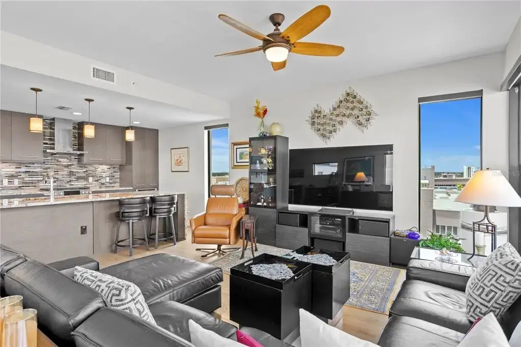 Experience breathtaking, sweeping views of downtown St. Pete, the Pier, Tampa Bay, the Dali Museum, and Albert Whitted Airport from the 12th-floor balcony of this spacious residence at The Salvador. A welcoming Gallery entry sets the tone, offering space for artwork, artistic expression and a direct line of sight to the stunning vistas beyond. This 1,555 sq. ft., 2-bedroom, 2-bath home features a unique open floor plan with windows on three sides—ensuring abundant natural light, dramatic views, and complete privacy with no adjacent units. The expansive living and dining areas are framed by floor-to-ceiling windows, with motorized blackout shades on the East and West exposures. The contemporary kitchen has been thoughtfully upgraded with custom waterfall-edge countertops, a deep single-basin sink with modern faucet, natural gas range, Samsung 28 cu. ft. French door refrigerator with food showcase panel and filtered ice/water, and a wine cooler. Design upgrades continue throughout: premium sinks and Moen faucets in both bathrooms, Cat 6 wiring from a centralized Ethernet switch, and sunshade blinds in both bedrooms, double-hung with blackout layers. The primary suite features a generous walk-in closet and a spa-inspired bath with a deep soaking tub, a large walk-in shower with a custom glass enclosure, dual Moen fixtures (rainhead and handheld), each with individual thermostatic controls, and a dual-sink vanity. The guest bedroom includes a custom queen-size Murphy Bed with swinging bookshelf doors. A laundry closet between the bedrooms includes Samsung front-loading washer and dryer with added storage. This residence includes two adjacent second-floor parking spaces and a substantial climate-controlled storage room. The Salvador, a LEED-certified building with only 74 units, offers an array of amenities including a pool and spa, a state-of-the-art fitness center, a social room, grilling area, dog park with wash station, sculpture garden, and outdoor fire pit. Concierge service and on-site management ensure effortless living in this tranquil yet centrally located oasis, just blocks from downtown attractions like the Dali Museum, Mahaffey Theater, Albert Whitted Airfield, and the vibrant Saturday Morning Market. Elevate your lifestyle with a private tour of this exceptional residence at The Salvador and discover unparalleled luxury living in the heart of St. Pete. Schedule your visit today to immerse yourself in this unparalleled blend of privacy, luxury, and location.