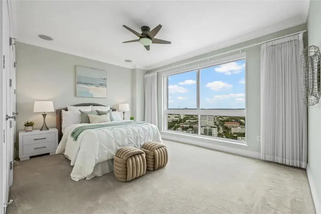 Sweeping Tampa Bay Views greet you from the moment you step through the private foyer into this 23rd-floor 400 Beach Drive condo! This beautifully designed 2-bedroom, 2-bath residence offers 2,203 sqft of comfortable, upscale living with unobstructed views of Tampa Bay. From sunrise to sunset, take in the stunning backdrop of water and beautiful northeast views from nearly every room. Step off the elevator into your private foyer, offering a quiet and secure entrance that leads directly into your residence. As you walk into the main living area, you're immediately greeted by wall-to-wall windows framing breathtaking water views, filling the space with natural light and a calming coastal feel. In addition to the two spacious bedrooms, this home features a generously sized office that offers flexibility as a media room or den—perfect for guests or working from home. The open layout is perfect for both everyday living and entertaining, and features Crestron electric shades and lighting throughout. Step out to the balcony—accessible from both the kitchen and the primary suite—for your morning coffee or an evening glass of wine while watching fire works on Spa Beach. This well-maintained residence is offers the ease of a low-maintenance with a lock-and-go lifestyle—ideal for full-time or seasonal living. The unit includes two side-by-side, covered, and secured parking spaces with an EV charging station, along with access to the building’s resort-style amenities, including 24/7 concierge service, a heated lap pool and spa, fitness center, social rooms, fire pit, and outdoor grilling stations. Set in the heart of Downtown St. Pete on iconic Beach Drive, you’re just steps from parks, the St. Pete Pier, waterfront trails, top-rated restaurants, boutique shopping, and world-class museums. Whether you're enjoying the vibrant downtown energy or relaxing at home with a view, this residence offers the best of both worlds.