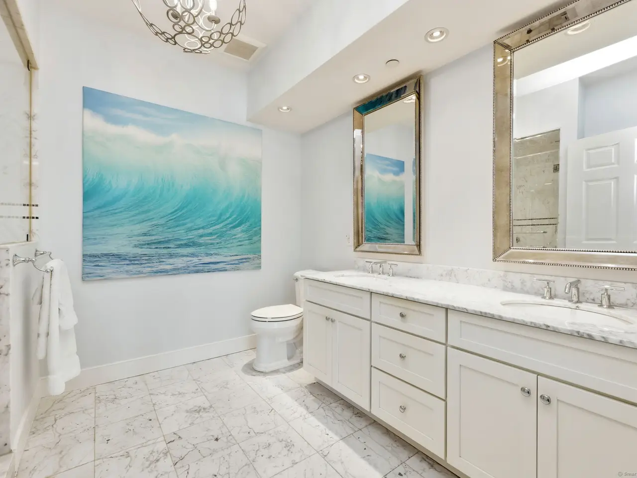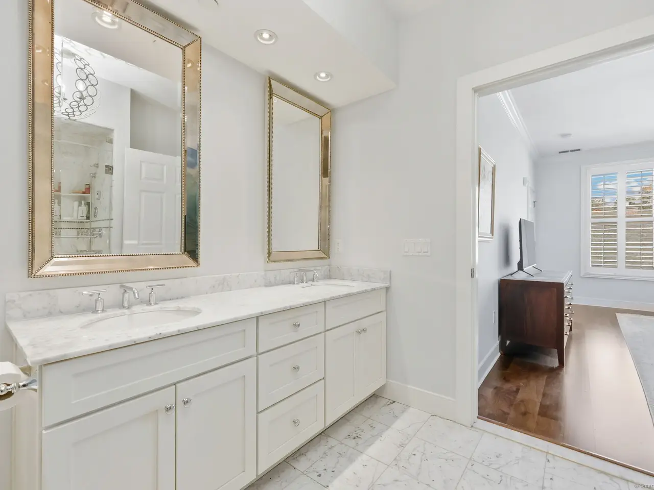 Spa-inspired primary suite bath Marble-clad bath in second suite