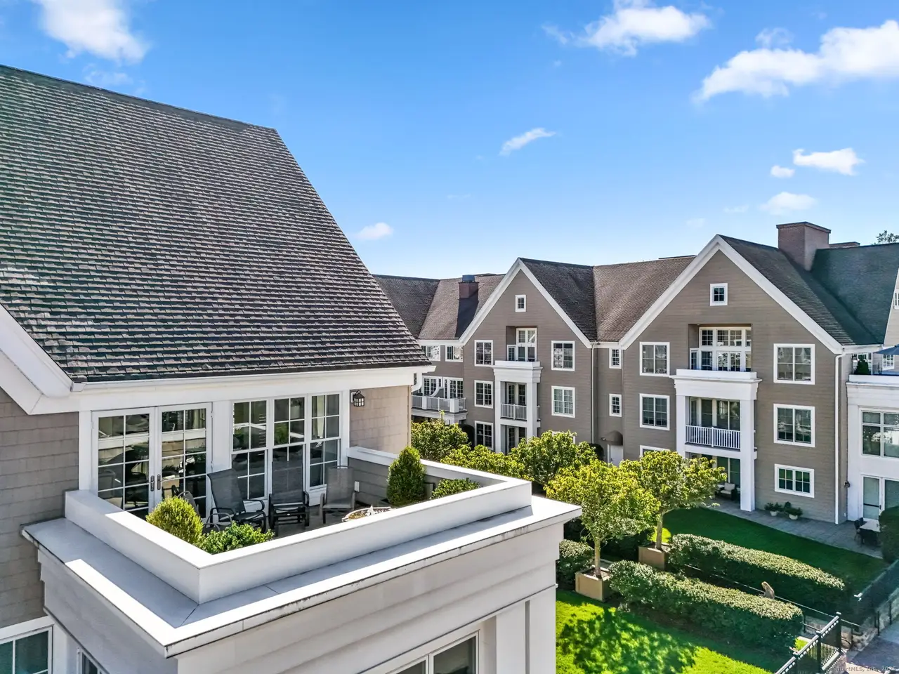 Penthouse Duplex with Dual Private Terraces. This exceptional 2,077 sq. ft. penthouse duplex offers a rare opportunity within Palmer Hill, the premier gated community on the Greenwich/Stamford border. Soaring ceilings, floor-to-ceiling windows, and abundant natural light create an elegant, airy retreat. The home features two spacious primary suites and two-and-a-half baths, each with refined finishes and custom craftsmanship. A gracious foyer opens to the expansive living and dining area anchored by a fireplace and framed by French doors leading to two private terraces one with a tranquil fountain for seamless indoor-outdoor living. The gourmet kitchen is appointed with a large eat-in island, six-burner range, Liebherr refrigerator with dual freezer drawers, wine refrigerator, and a walk-in pantry. The first-floor primary suite includes a spa-inspired bath with a steam shower and dual vanity. The second suite offers its own marble-clad bath and walk-in closet. A flexible loft space is ideal for an office or lounge. Two indoor garage spaces and a private storage unit complete this offering. Residents enjoy resort-style amenities including a newly renovated clubhouse, fitness center, yoga room, outdoor pool, and fire pit all moments from downtown Greenwich and Stamford. Metro-North, Downtown Old Greenwich, Stamford, and Greenwich. Welcome to the easy life.