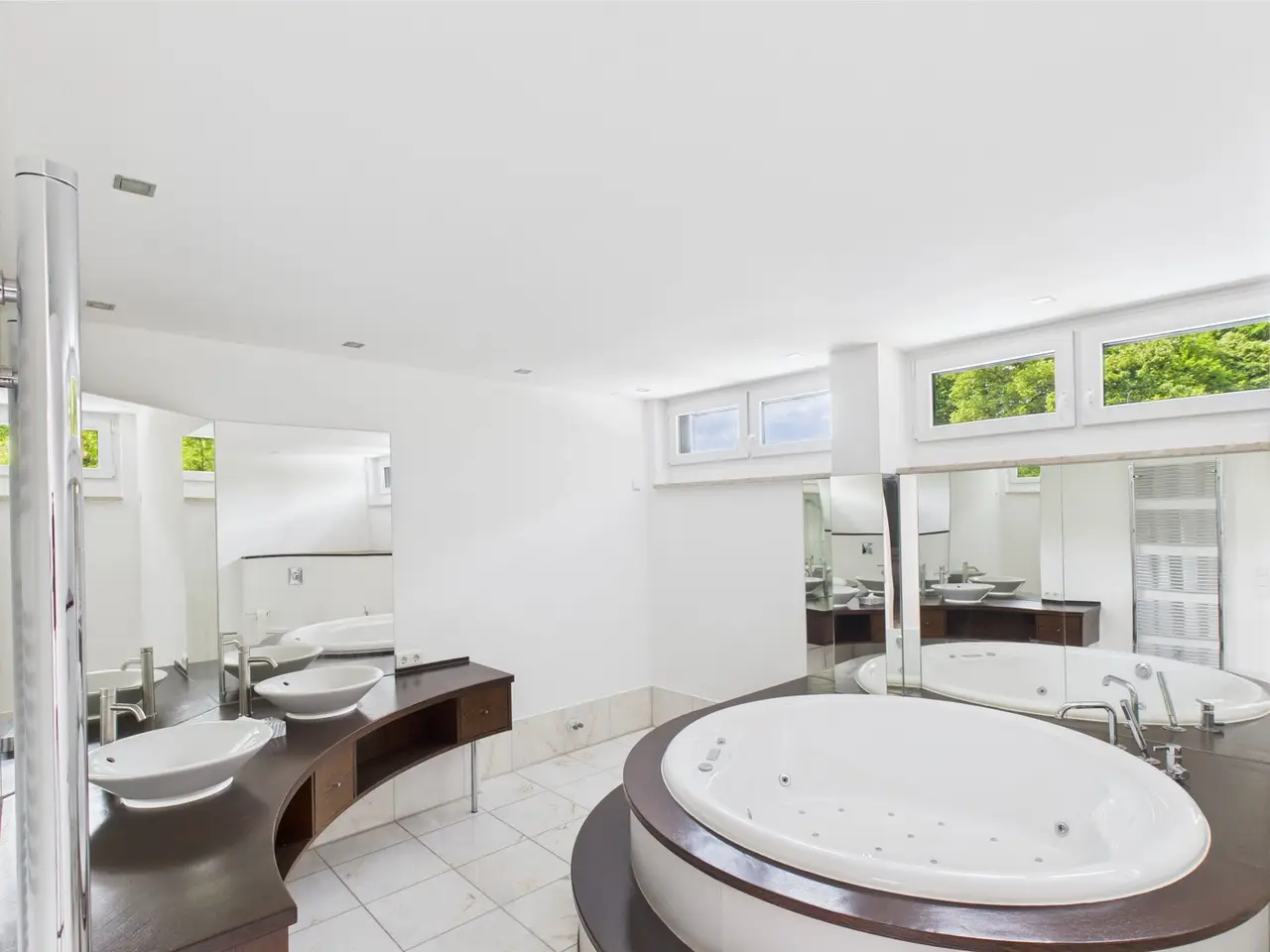 Exclusive luxury property in a quiet location - your dream home in Stein near Nuremberg Welcome to this exceptional and stylish property that leaves nothing to be desired. The house is located in a very quiet cul-de-sac right next to the town park in Stein near Nuremberg, creating an idyllic and private atmosphere. The spacious plot of 2,763 m² offers plenty of room for relaxation, leisure and individual design options. The main house extends over approx. 415 m² and has a total of nine rooms, which are ideal for families, multi-generational living or as a prestigious home. The rooms are flooded with light and generously proportioned, with a room height of around 2.70 meters, which creates a pleasant feeling of living. The high-quality natural stone floors on the first floor and the parquet floors on the upper floor underline the exclusive character of the house. The future kitchen with cooking island and dining area invites you to enjoy convivial cooking evenings and meals together. The open fireplace inside creates a cozy atmosphere and makes living particularly comfortable. The house has a full basement and offers a wellness area with sauna, a bunker, a safe and various cellar rooms for storage. Other amenities include a shower room, a master bathroom and a separate bathroom with access to the children's room. The room heights in the house are pleasantly generous, which further emphasizes the feeling of living. The outdoor area impresses with a large south-facing terrace of approx. 30 m² with an open fireplace in the outdoor area, which is perfect for enjoying the sun, as well as a further outdoor seating area of approx. 15 m² and an inner courtyard with approx. 40 m² of open space. An approx. 88 m² granny apartment is available for guests or as additional living space. It has a partial basement and is equipped with natural stone floors, a fitted kitchen and a bathroom with bath and shower. The well-kept garden with a fountain and a large area invites you to relax and linger in the greenery. The garden offers space for a possible swimming pool. The property has a double garage with adjoining utility room, which provides ample space for vehicles and storage. The corresponding plan is available for an additional double carport. The house is technically state of the art: it is equipped with underfloor heating and radiators that provide cozy warmth. The windows are made of wood and aluminum and are double-glazed, which ensures good insulation. A gas connection is provided and a modern oil heating system was installed in 2024. The property is also connected to the fiber optic network, which ensures fast internet connections. Security features such as an alarm system with connection to the police ensure a high level of security. The house has been continuously renovated and maintained over the last 10 to 15 years, so the property is in excellent condition. This exceptional property offers a perfect combination of tranquillity, privacy, high-quality furnishings and generous space. It is currently vacant and therefore ready for immediate occupancy. If you are looking for an exclusive home in a quiet location with plenty of space and high-quality furnishings, then this property in Stein near Nuremberg is just right for you. We look forward to showing you this special home in person during a viewing. Please contact us for further information!
