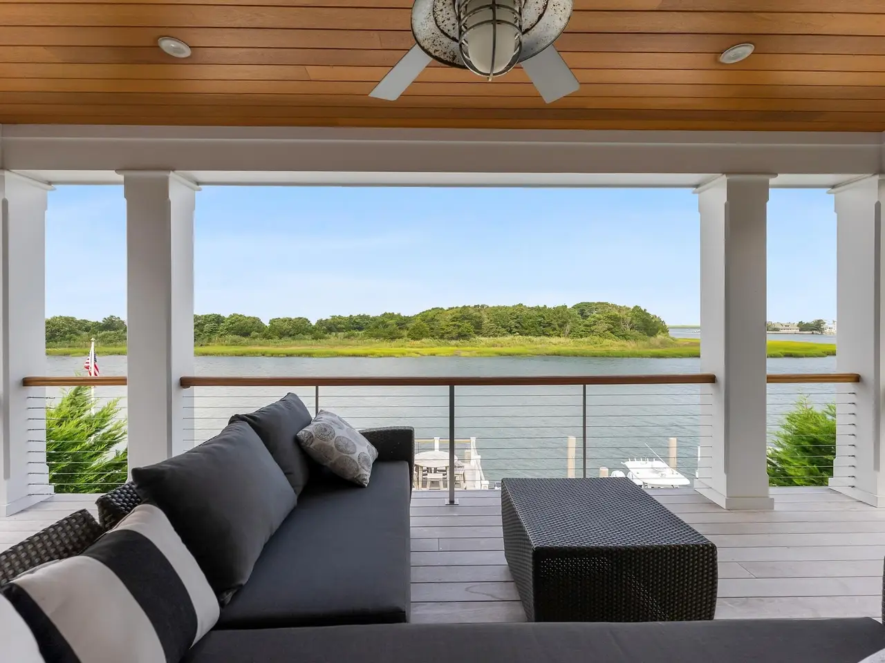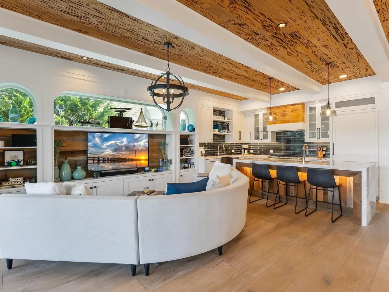 Vino Su l'acqua ("Wine on the Water") - Coastal Elegance Meets Bayfront Luxury. Welcome to Vino su l'acqua, a name that perfectly captures the essence of this peaceful, luxurious escape fabulous unobstructed views of the bay, wetlands and waterfowl habitat. This well thought out home was designed by the architectural firm of Asher Slaunwhite with much influence from Mark Asher. The home was constructed by renowned custom builder D.L. Minor and is positioned gracefully on a premier, quiet street, offering the ultimate in privacy, design, and waterfront living. From the moment you enter, you're greeted by masterful design and craftsmanship, including gorgeous, reclaimed wood accents and custom millwork throughout the home, pecky cypress wood and beamed ceilings, engineered wide plank hardwood floors, and thoughtfully curated high-end finishes throughout. The second-floor primary suite spans the full width of the home, offering breathtaking panoramic bay views through an oversized sliding glass door leading to a massive, covered deck-complete with a private wet bar and Sub-Zero wine fridge, perfect for sipping wine on the water. The spa-inspired en-suite bathroom features dual sinks, a custom open vanity, shower/tub combination with a rain head, barn-style glass doors, separate water closet, and custom open shelving. Additional interior features include a spacious custom bunk room with built-in storage, custom built-in cabinetry framed by large picture windows for abundant natural light, striking iron and wood pantry doors, and a designer kitchen with top-tier paneled appliances, multiple sinks, a cascading waterfall island with refrigerator drawers, a custom hood vent, and a luxury glass tile backsplash. The rooftop deck offers sweeping, elevated views of the bay and intracoastal waterway and serves as a true private oasis. An integrated alarm system offers peace of mind. Indoor-outdoor living is elevated by a show-stopping NanoWall that seamlessly opens the interior to an expansive screened-in porch with a brick gas fireplace, automatic hurricane shutters, and motorized screens-blurring the lines between indoor comfort and outdoor serenity. Step onto the one-level bayfront deck, adorned with elegant outdoor lighting, leading to a custom ramp and floating dock with two private boat slips-perfect for fishing, boating, or simply soaking in the sunsets. Smart home features include a fully integrated Control4 Smart Home System that has sonos speakers in every room can be operated from your phone via app with fully customizable remote access. The system controls deck screens and shutters, climate (heating and air conditioning), lighting, and music in every room of the home-including the front porch, back porch, and outdoor deck-with seamless efficiency using Lutron lighting and intuitive design. After a day on the water, rinse off in your own luxurious brick-walled outdoor shower-a private, elegant touch that enhances your coastal lifestyle. Additional features include a welcoming full front porch, two off-street parking spaces, and built-in wine moments around every corner-fitting for the home's namesake. Vino Su l'axqua is not somply a home-it's a lifestyle on the water, where every detail is a testament to thoughtful design, timeless quality, and refined coastal living. Don't miss the opportunity to own Vino Su l'acqua, your own personal paradise-a true waterfront sanctuary where luxury meets tranquility, and every sunset is a masterpiece.