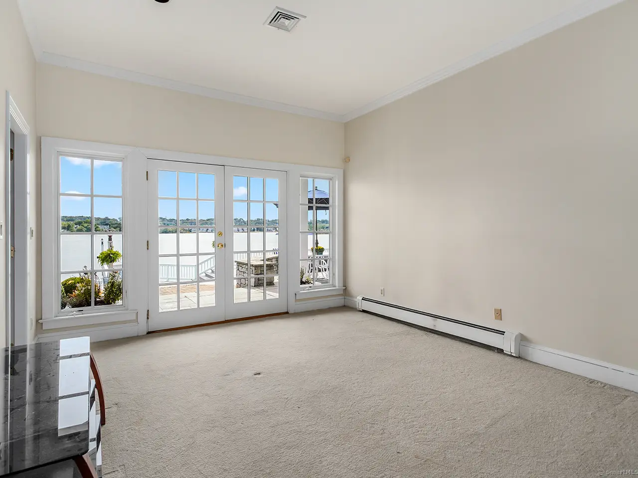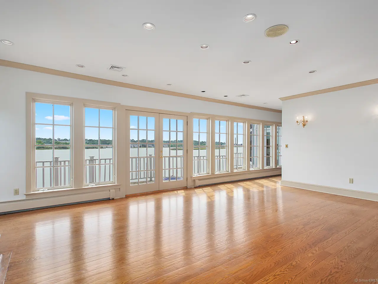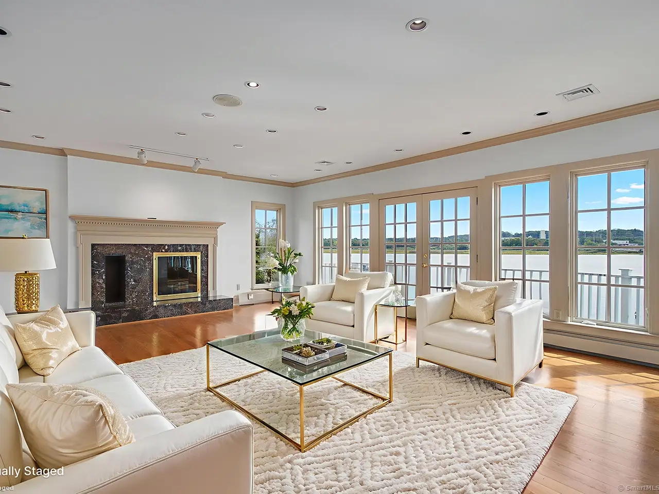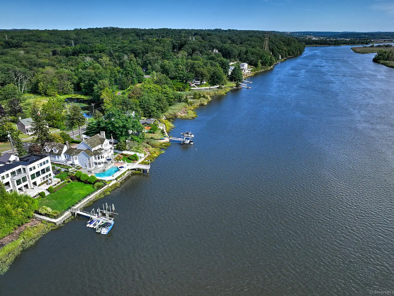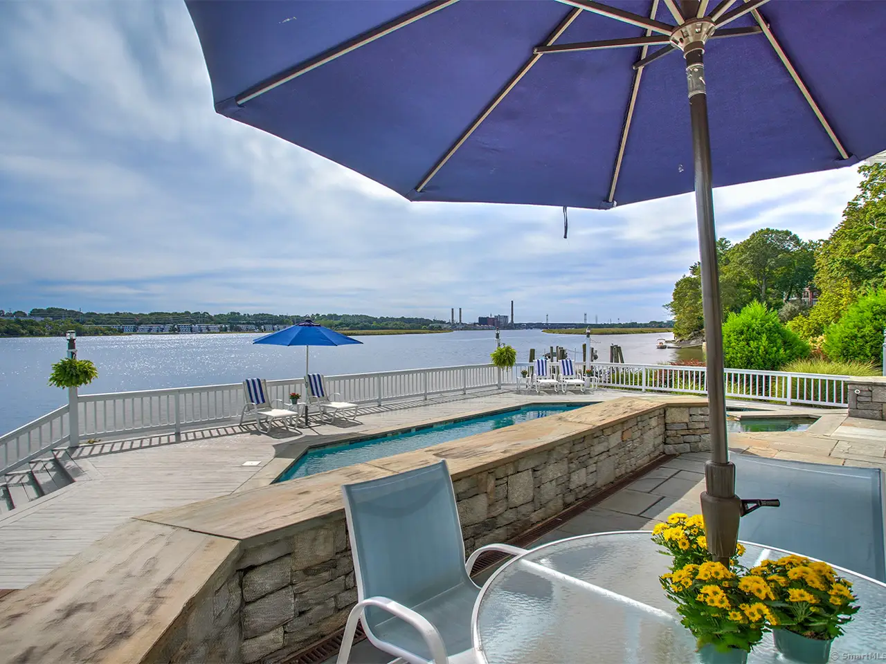 Welcome to this stunning waterfront retreat on the scenic Housatonic River, offering panoramic views, luxury, and comfort. Perfect for relaxing or entertaining, this home features 3 spacious bedrooms, 3.5 baths, and a finish able bonus room above the 2-car garage-ideal for a guest suite or office. Elevator to all three levels provides added convenience. A stone wall and gated entry lead to a paver driveway, setting the stage for what's inside. The main floor boasts a sunlit living room with a fireplace and deck overlooking the pool and river. The kitchen, dining room, family room, solarium, and home office all offer beautiful water views. The lower level is an entertainer's dream: a second kitchen, stone fireplace, sauna, steam room, Jacuzzi, two bedrooms, two full baths, and a gym. Walk out to your private pool, hot tub, and dock for direct river access. The entire upper level is dedicated to the luxurious primary suite with two walk-in closets, a cedar closet, fireplace, private balcony, and a spa-like en-suite bath. Whether hosting summer gatherings, enjoying quiet nights by the fire, or taking in the serene river views from nearly every room, this exceptional home offers the ultimate in waterfront living.