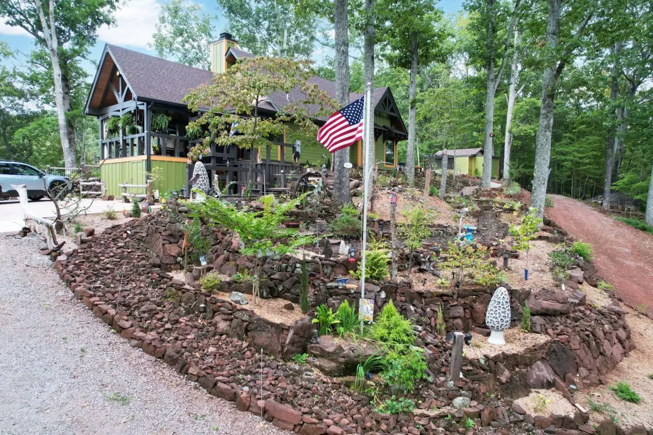 Welcome to your mountain-top oasis! This exceptional property encompasses over 15 acres spanning two mountains, offering unmatched privacy, year-round creek frontage, and stunning long-range views. Built just two years ago with natural dried spruce, this custom retreat blends high-end finishes with rustic mountain charm. The 2-bedroom, 2-bath home showcases an open floor plan with soaring tongue-and-groove pine cathedral ceilings and expansive Pella Impervia windows and doors that frame the breathtaking scenery. Each bedroom includes its own en-suite bathroom with Pfister fixtures and heatilators. The kitchen features quartz countertops and custom hickory cabinetry, while the living area is highlighted by a custom 42-inch wood-burning fireplace, set in one-piece leathered black granite and crowned with a black walnut mantle. Outdoor living is at its best with a wrap-around covered porch designed to double as an additional living space. Outfitted with TV and stereo wiring and custom weather curtains, it offers year-round enjoyment. Underneath deck is an unfinished basement, perfect for more storage area. Landscaped walkways, waterfalls, and garden areas and a fire pit complete the serene, spa-like atmosphere.Also included is a one bedroom/one bath guest house, large wired tool room, underground electricity, gated driveway entry, and a surround security system. Multiple cleared building sites provide opportunities for expansion. The property also qualifies for a greenbelt tax exemption, making it a smart investment as well as a peaceful retreat.Whether you're searching for a full-time residence, private getaway, or an investment rental this mountain-top sanctuary is truly one-of-a-kind.Schedule your private showing today and experience the beauty, privacy, and craftsmanship this property has to offer. Seller is offering home furnished or unfurnished. Please see below for more detailed information. Exterior Hardie board siding with lifetime warranty35-year architectural shingle roof for lasting durabilityCustom weather curtains enclosing the entire exterior deck2x6 exterior walls for added strength and efficiencyR60 foam insulation for superior energy savingsSolid wood interior doors throughoutInterior trim crafted from natural beetle board for unique character50-gallon high-efficiency water heater26-inch concrete slab foundation for stabilitySecurity system for peace of mindSolar generator backup power solutionFully decked attic providing additional storage space